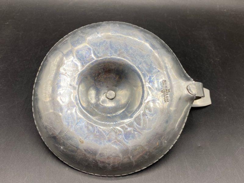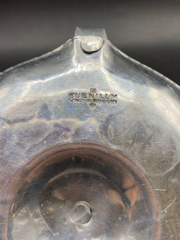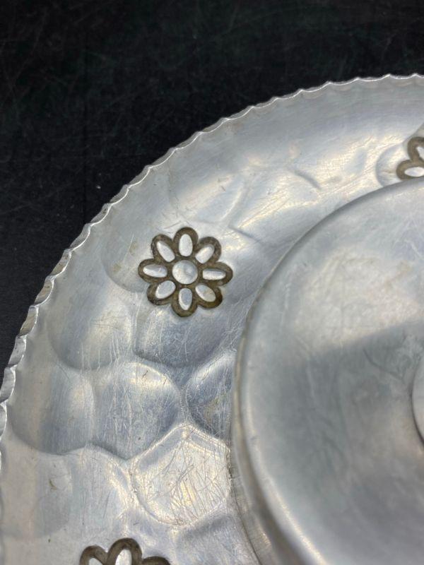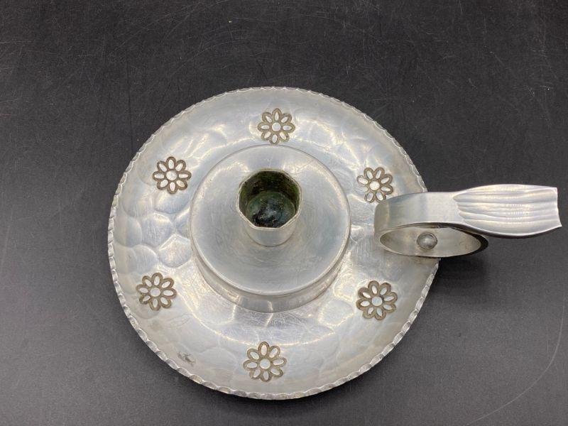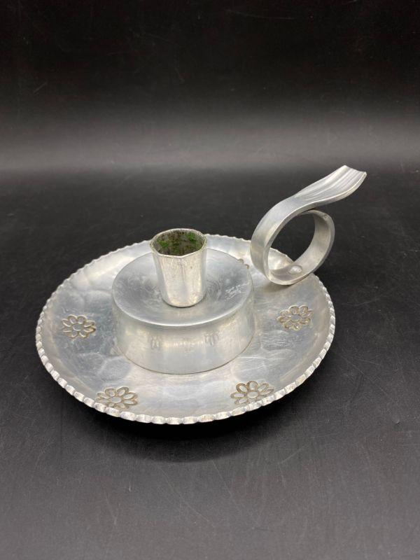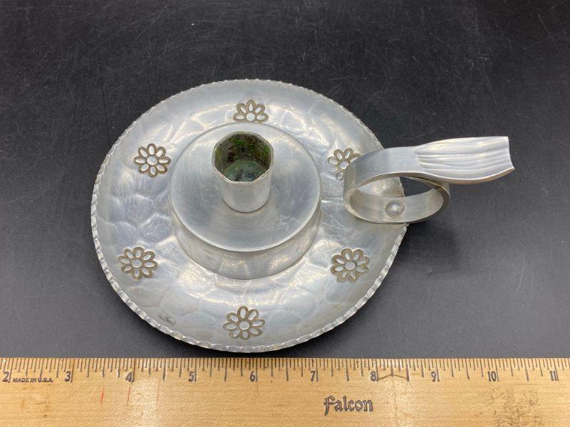Vintage Buenilum hammered aluminum candle holder. Single taper candle with handle. Scalloped like edging and a stamped flower pattern around base. About 7" across including handle.