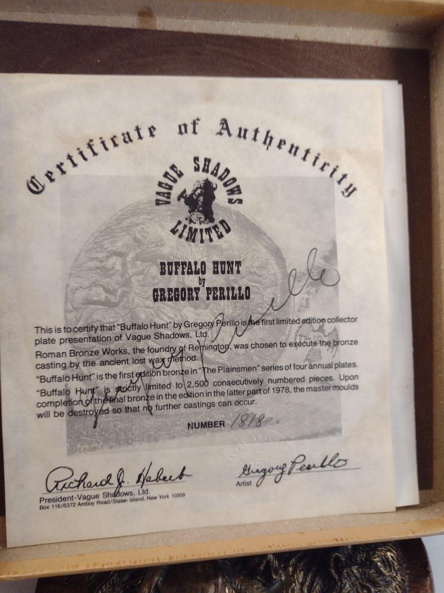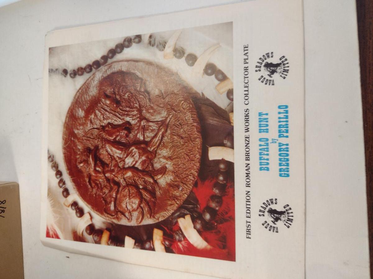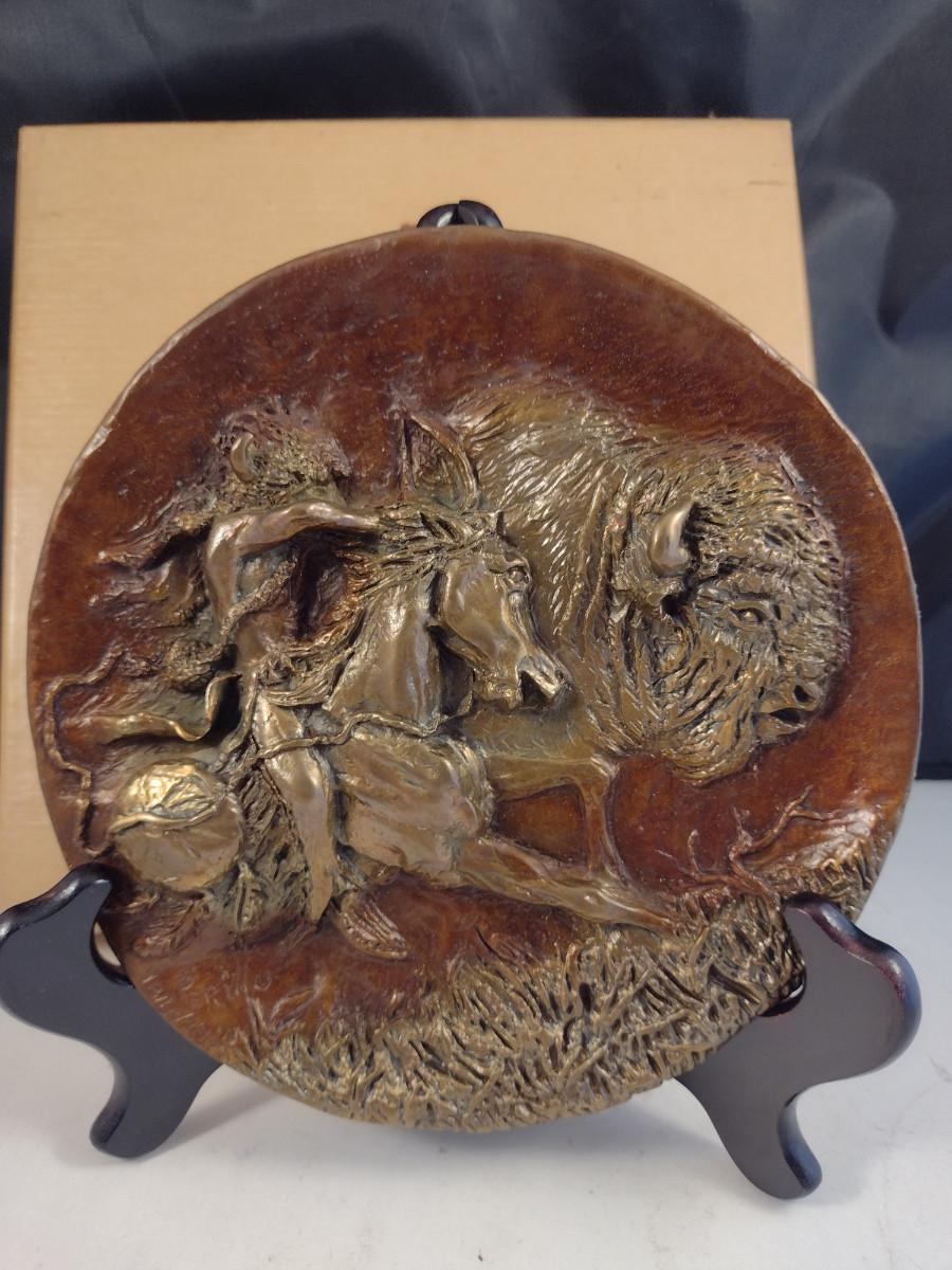 'Buffalo Hunt' by Gregory Perillo First Edition Roman Bronze Collector Plate- Approx 7 3/8" in Diameter- Number 1818/2500. Comes with COA and original box.