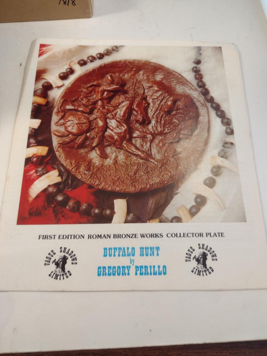 'Buffalo Hunt' by Gregory Perillo First Edition Roman Bronze Collector Plate- Approx 7 3/8" in Diameter- Number 1818/2500. Comes with COA and original box.