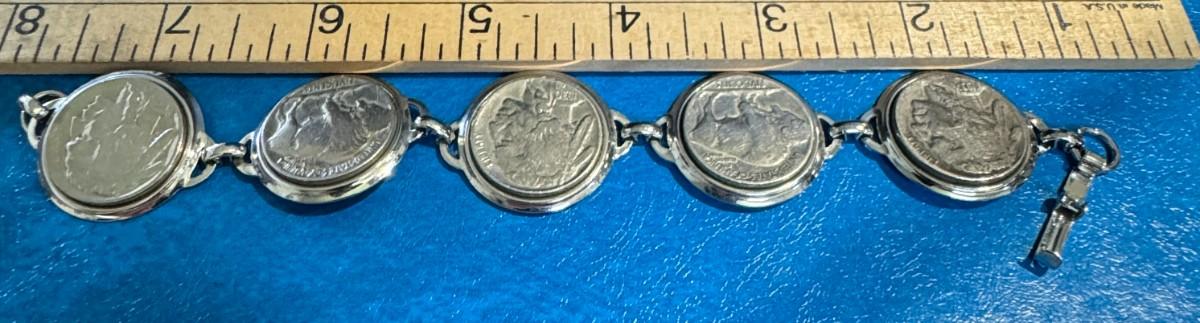 Coins Used: The bracelet incorporates genuine Buffalo Nickels, which feature a Native American profile on the obverse (front) and an American bison (buffalo) on the reverse (back).