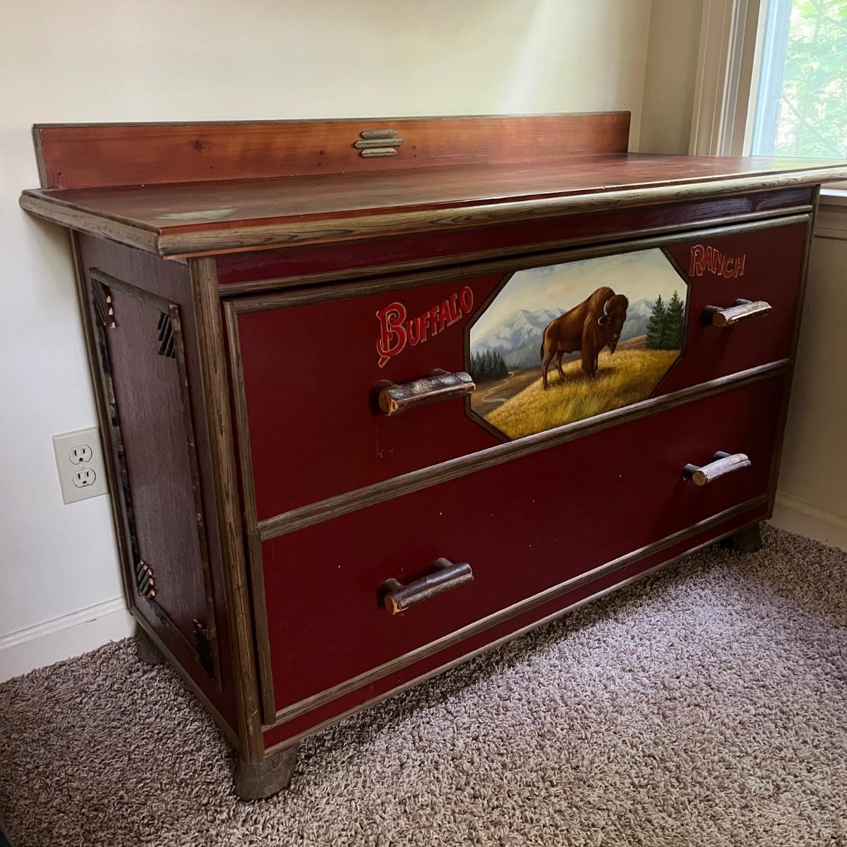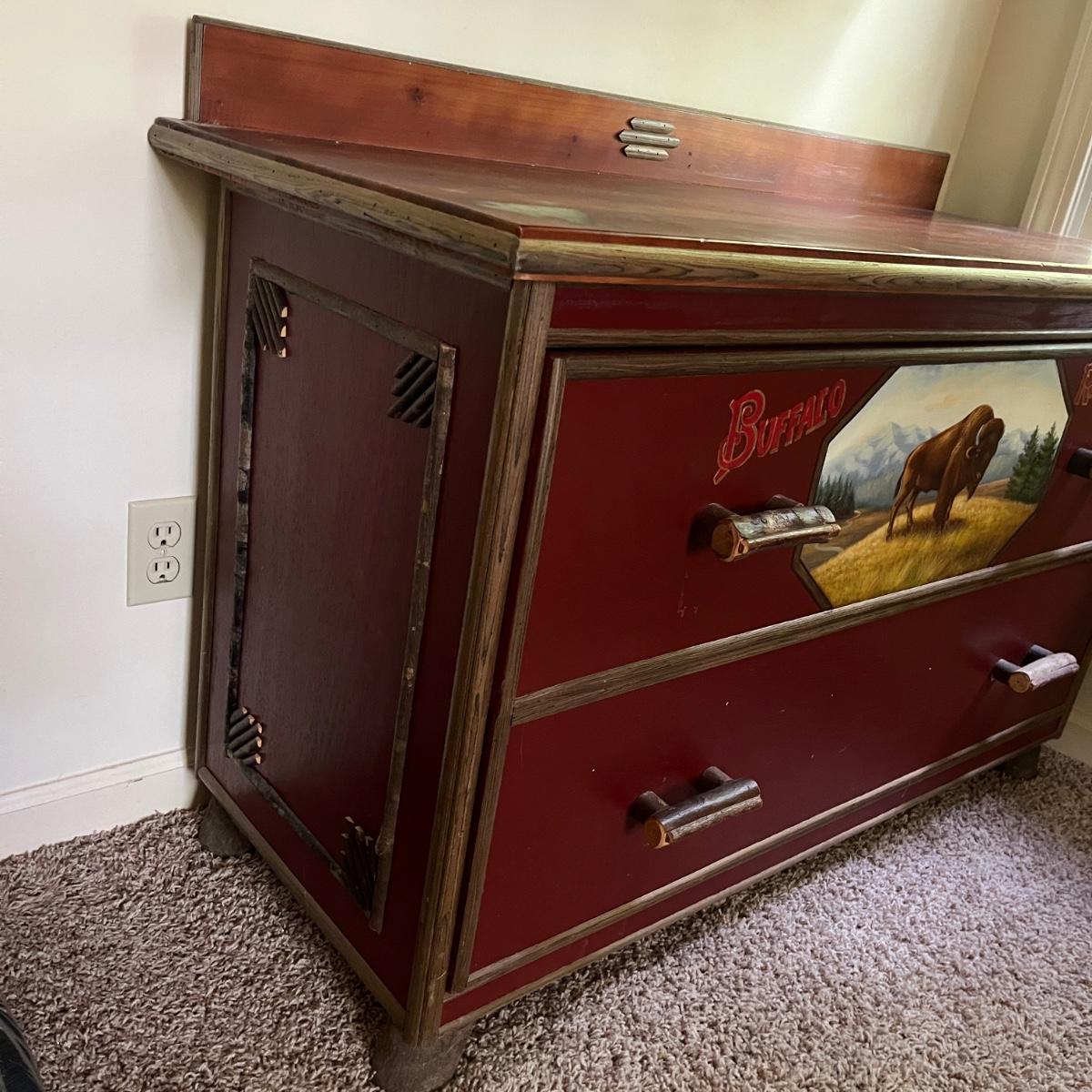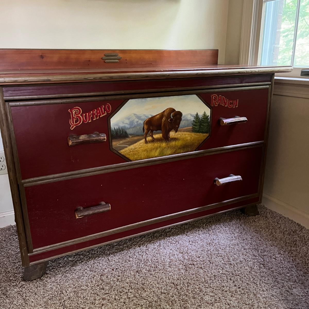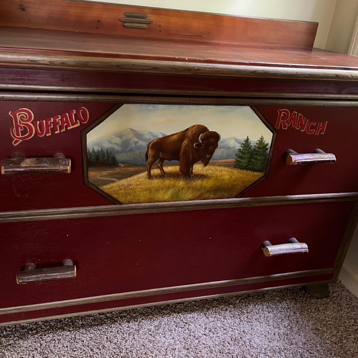 This stylish Buffalo Ranch two drawer chest has a buffalo on the front with two arrowheads that appear to be painted on the top. Chest measures 48” x 28.5” x 33”H.