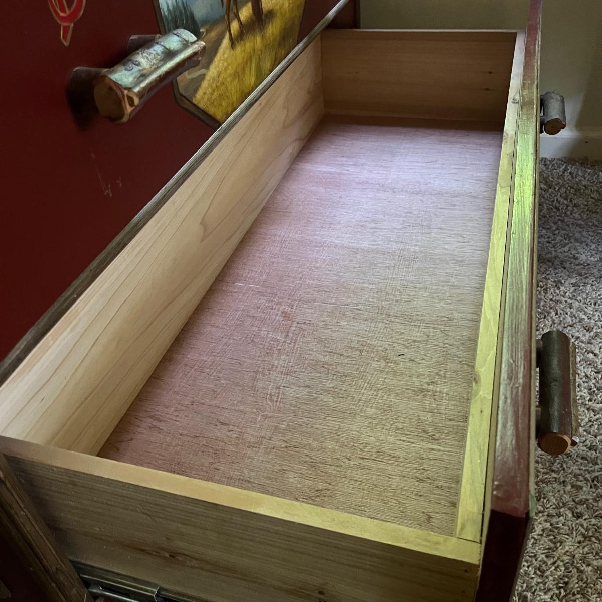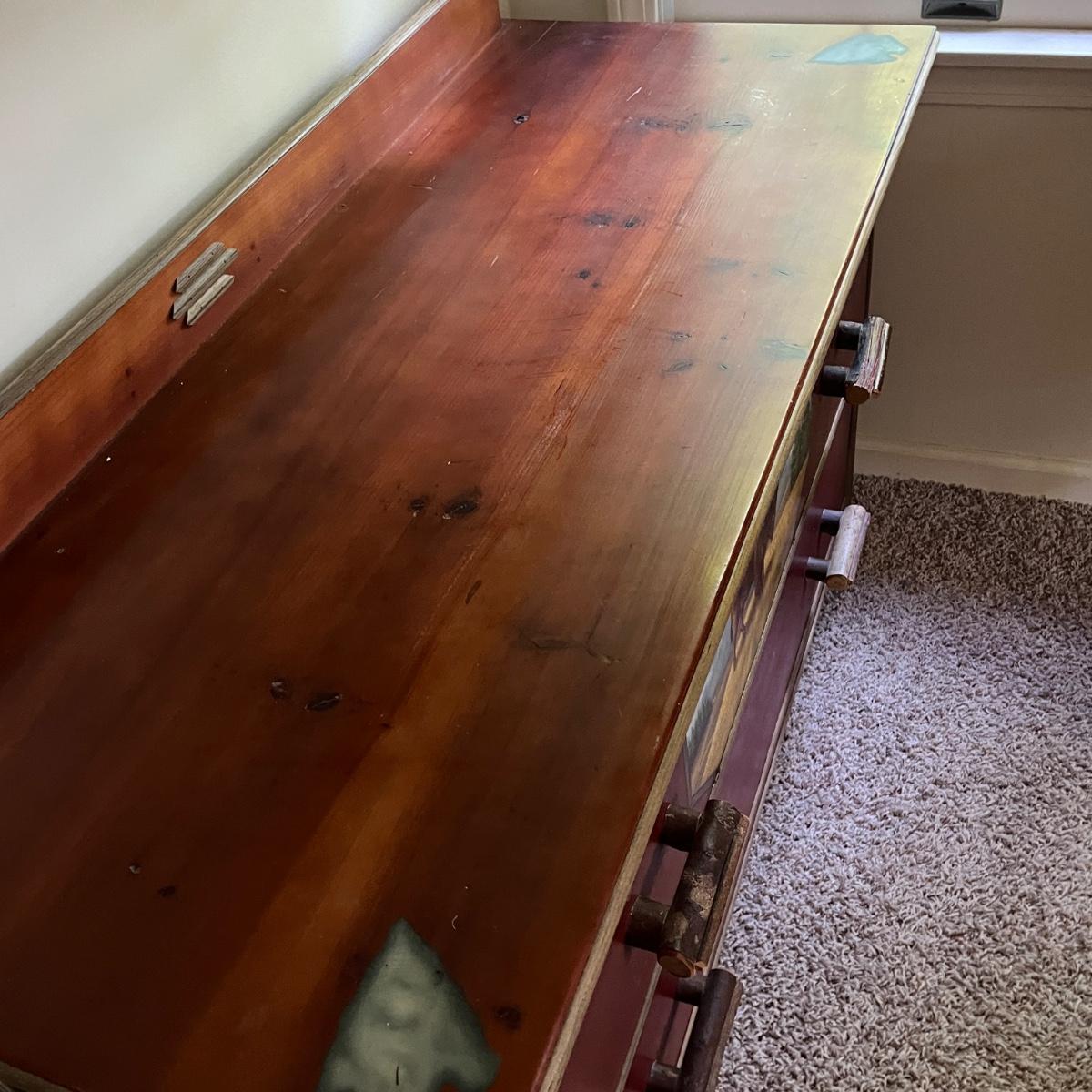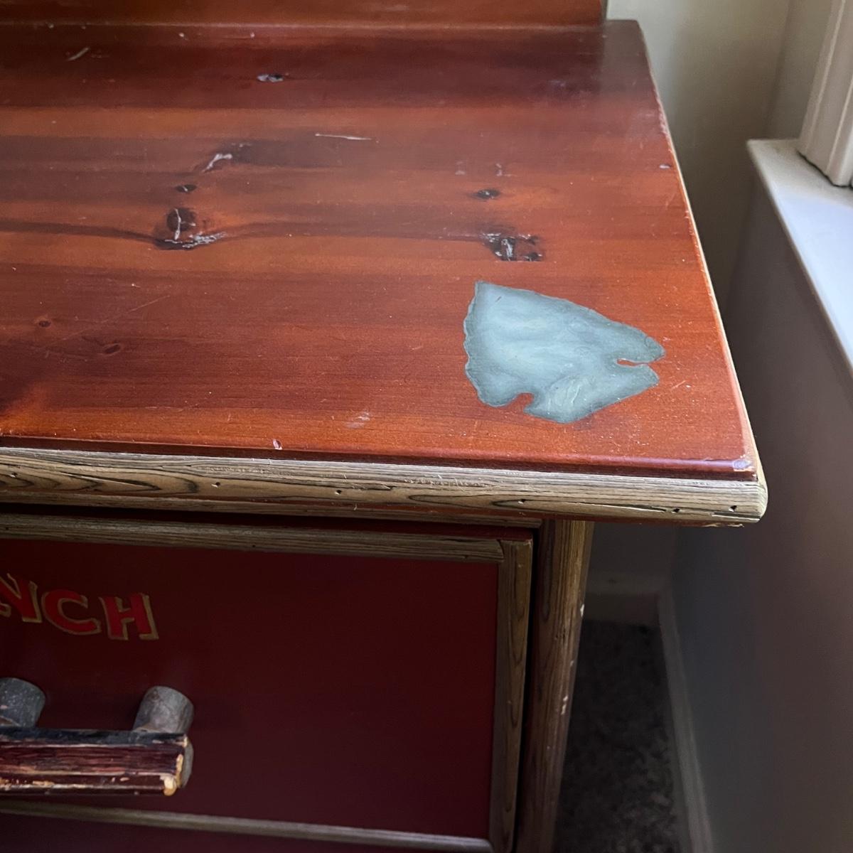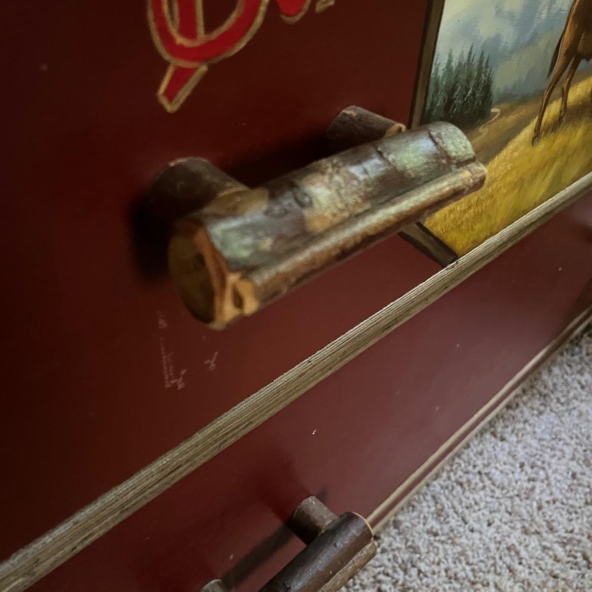 This stylish Buffalo Ranch two drawer chest has a buffalo on the front with two arrowheads that appear to be painted on the top. Chest measures 48” x 28.5” x 33”H.