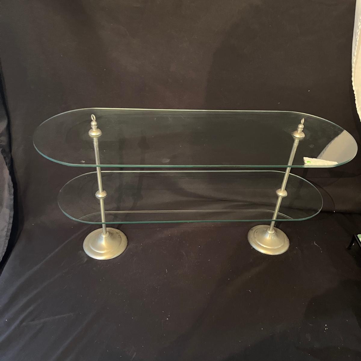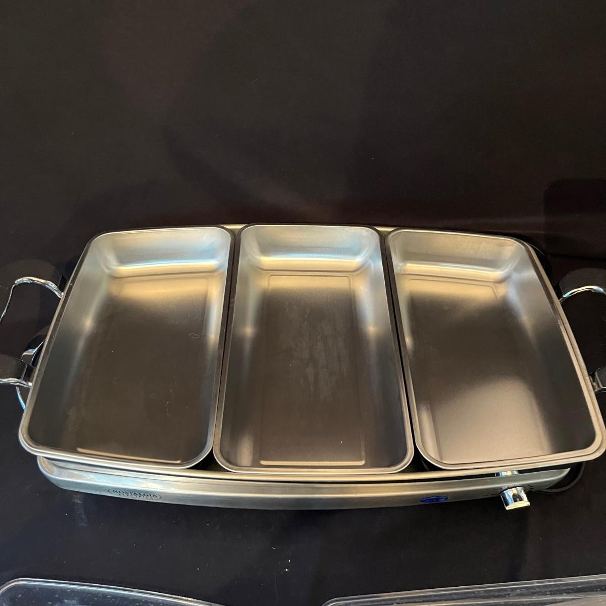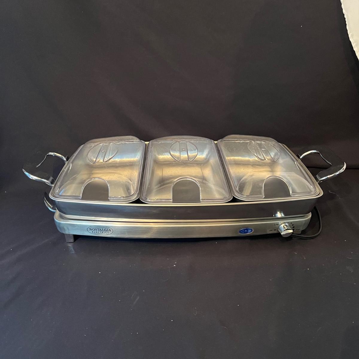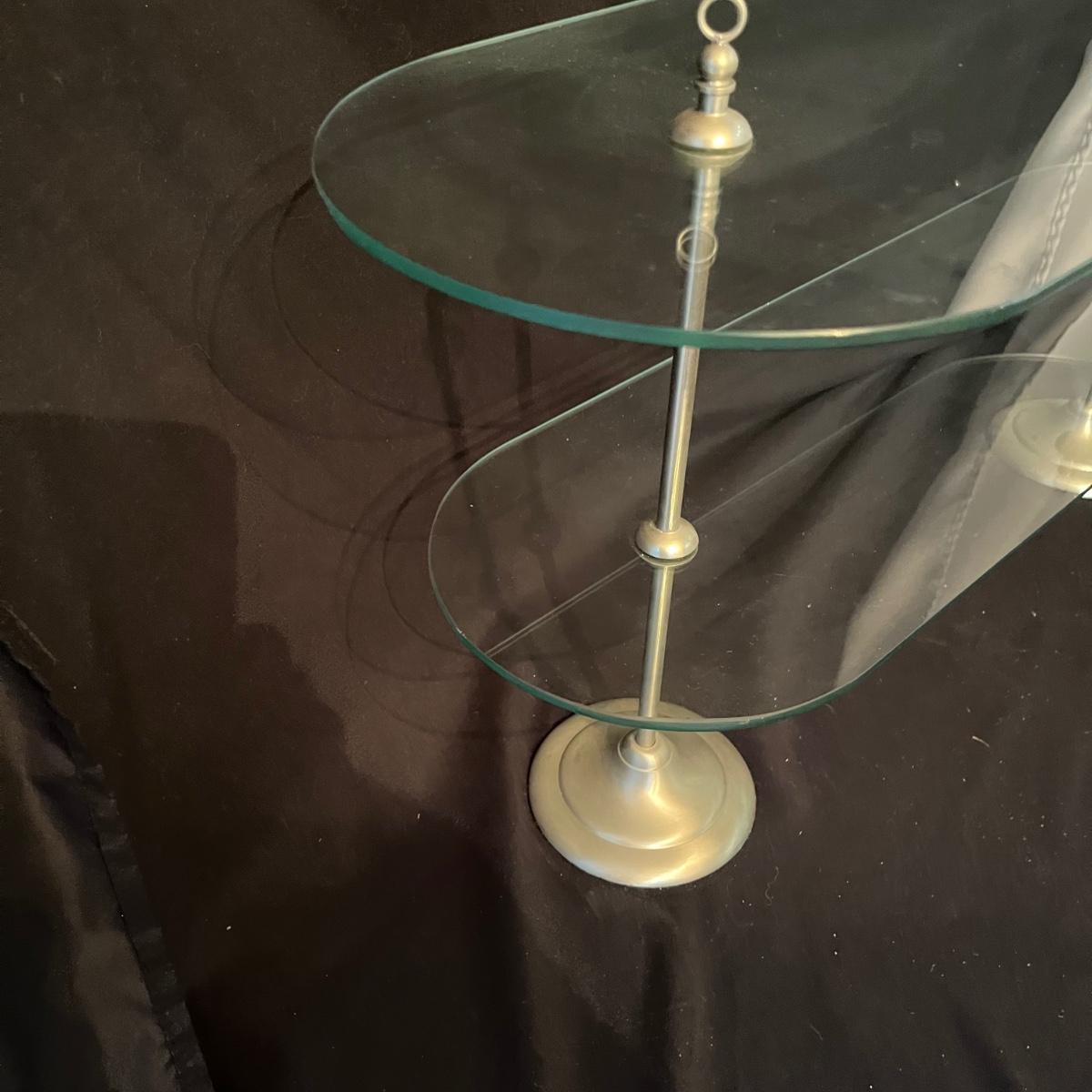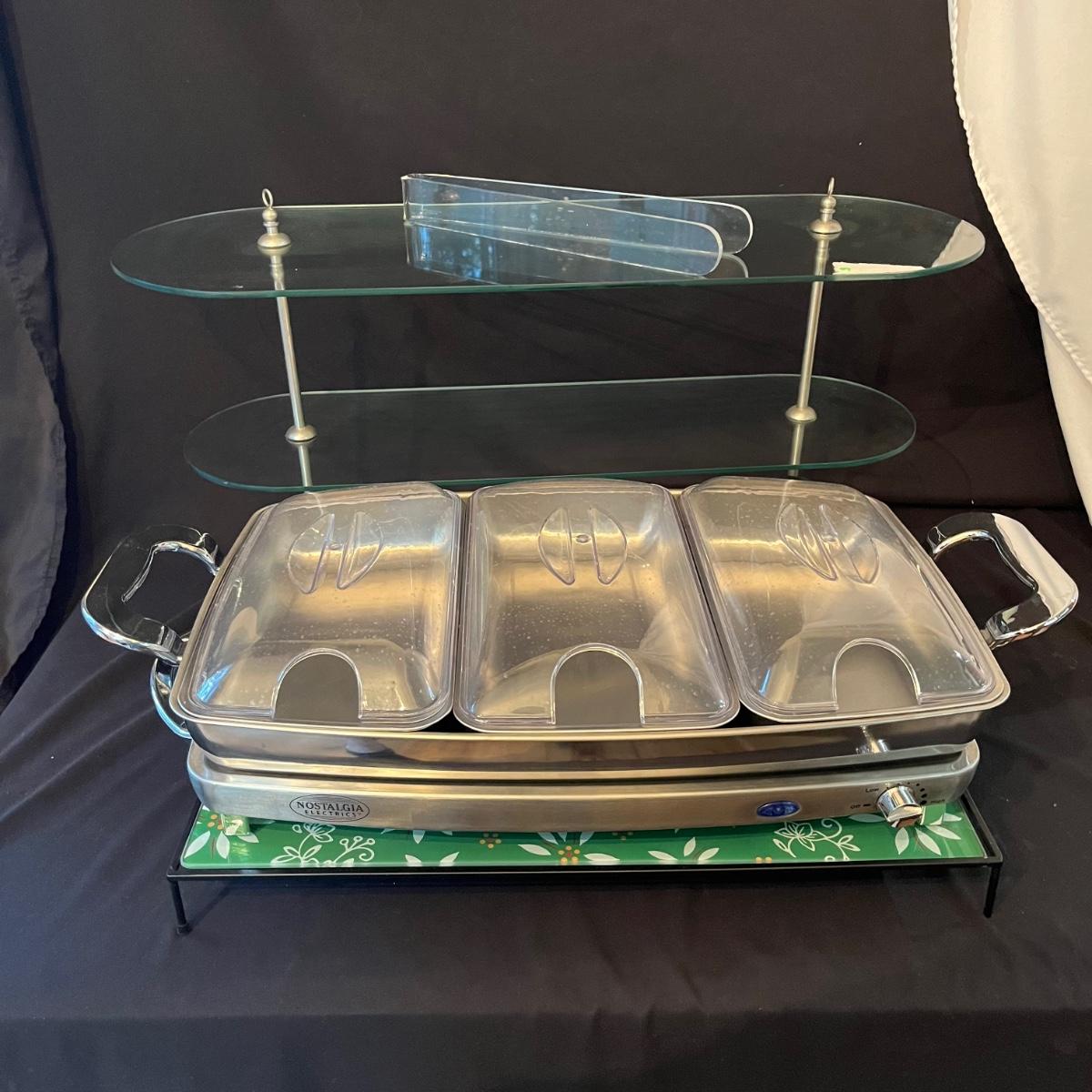 Lot includes à electric buffet server that powered on when plugged in. Also includes a two tier glass and metal food display stand and a metal and floral design glass stand. Display stand measures 28” x 10” x 14”H.l