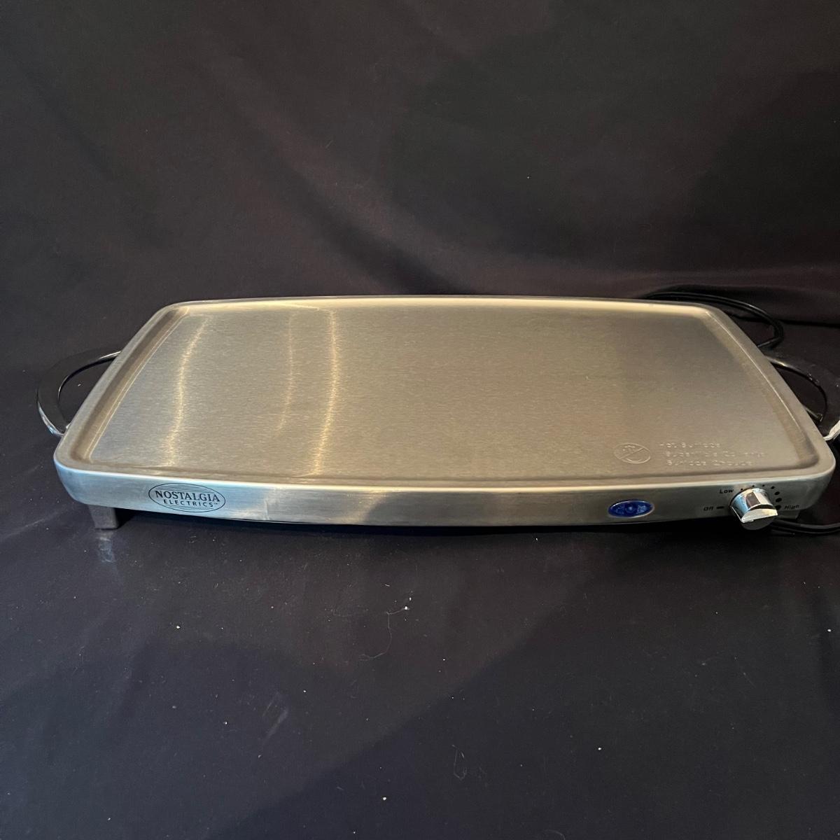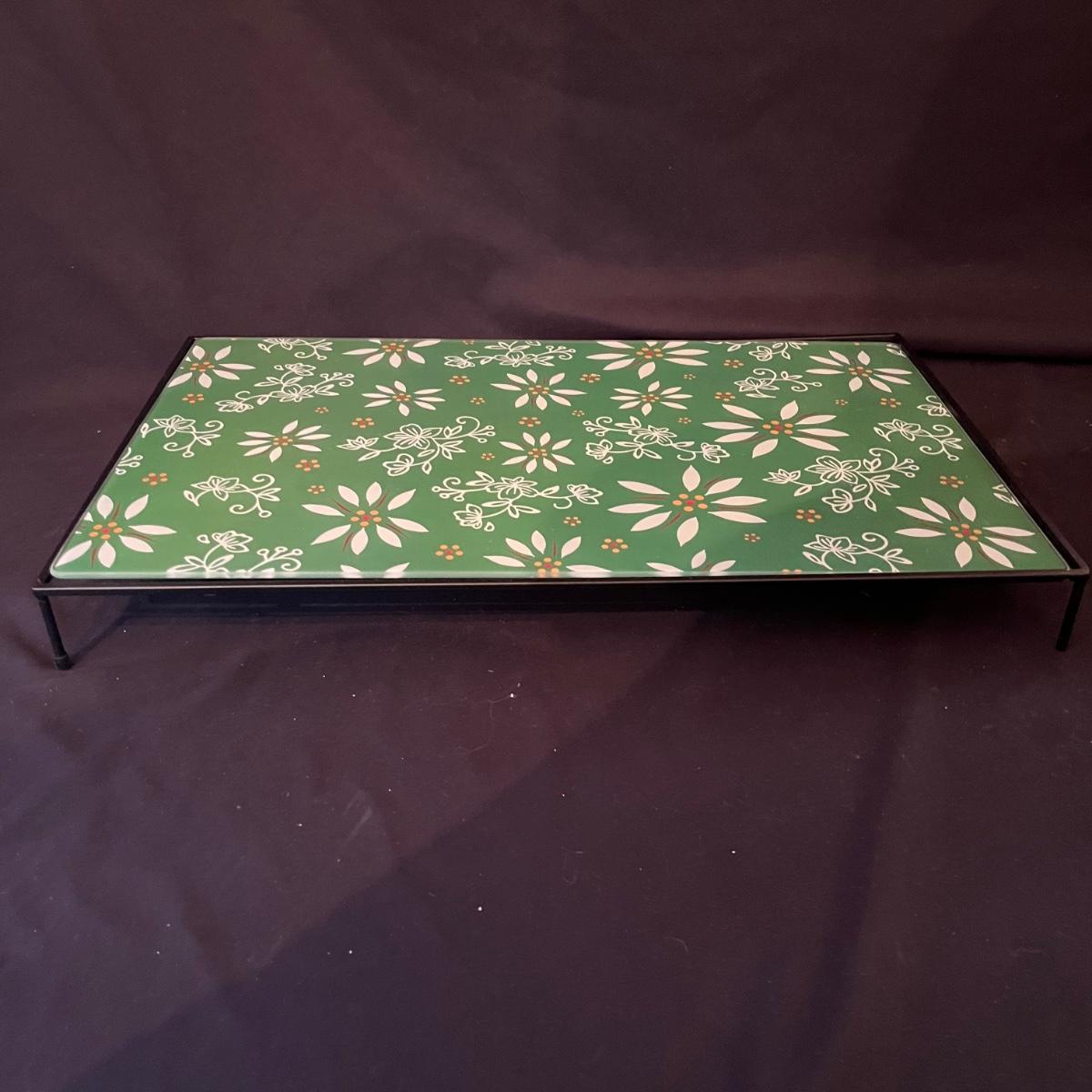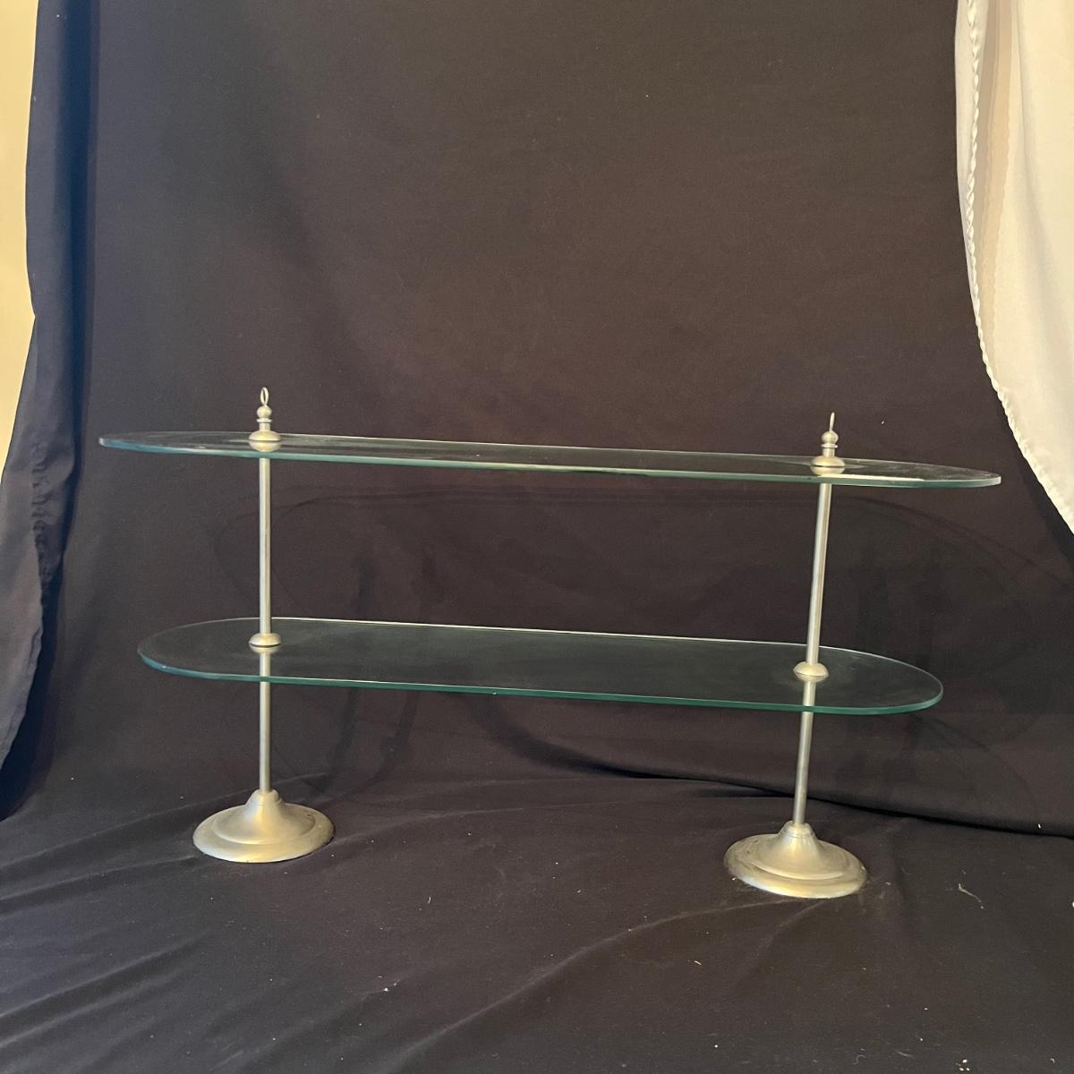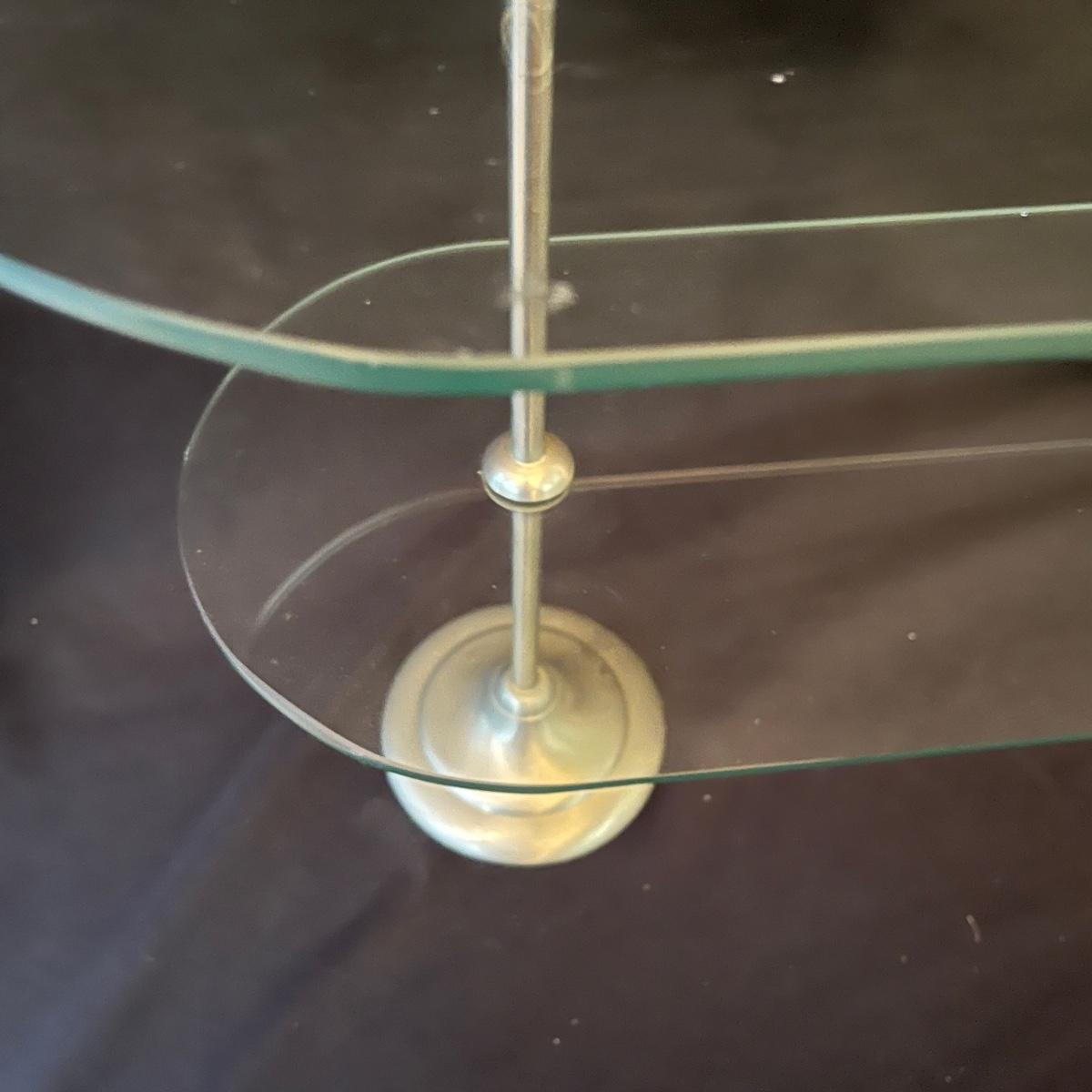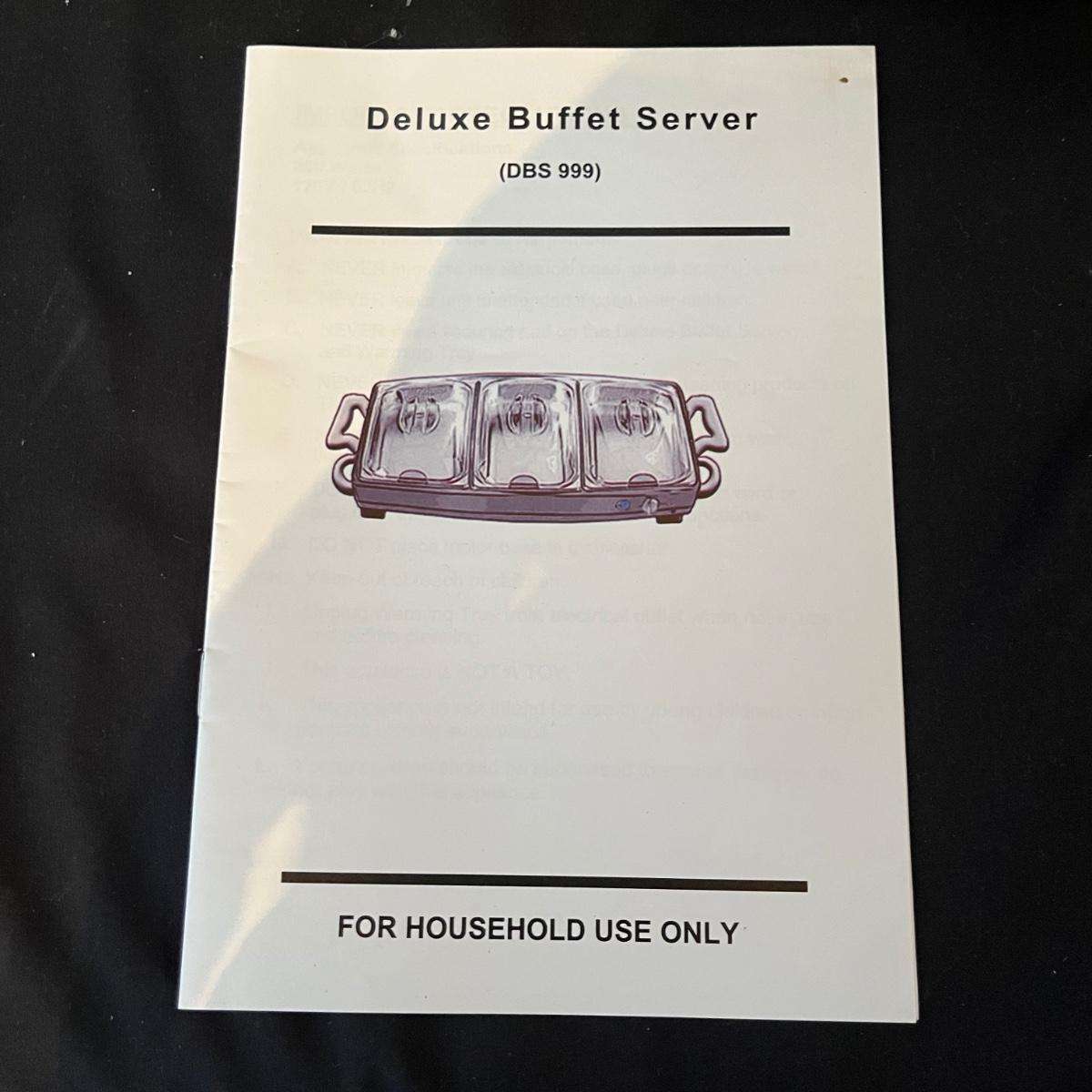 Lot includes à electric buffet server that powered on when plugged in. Also includes a two tier glass and metal food display stand and a metal and floral design glass stand. Display stand measures 28” x 10” x 14”H.l