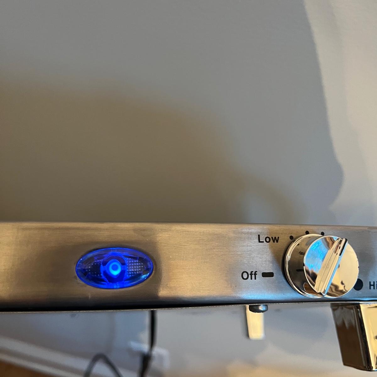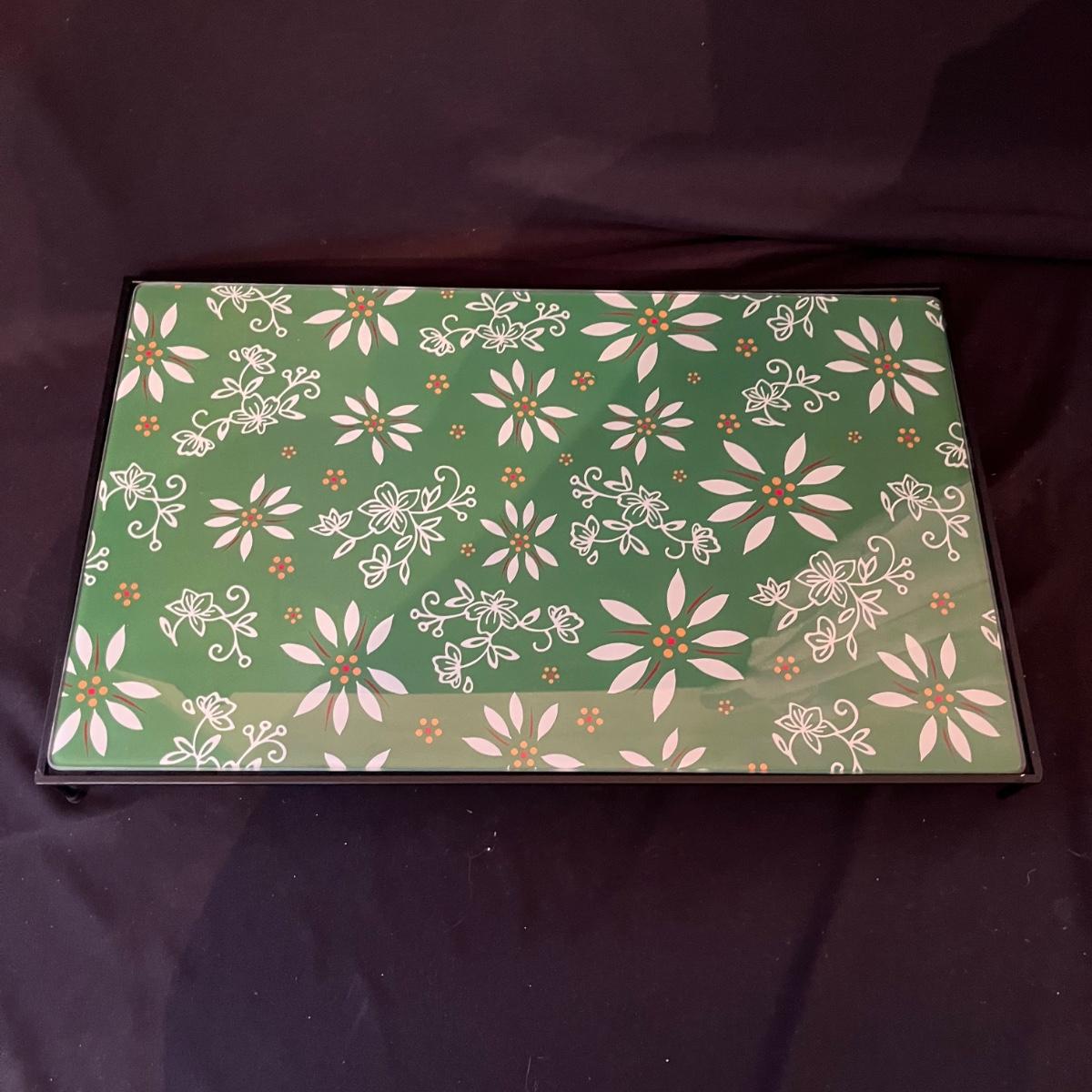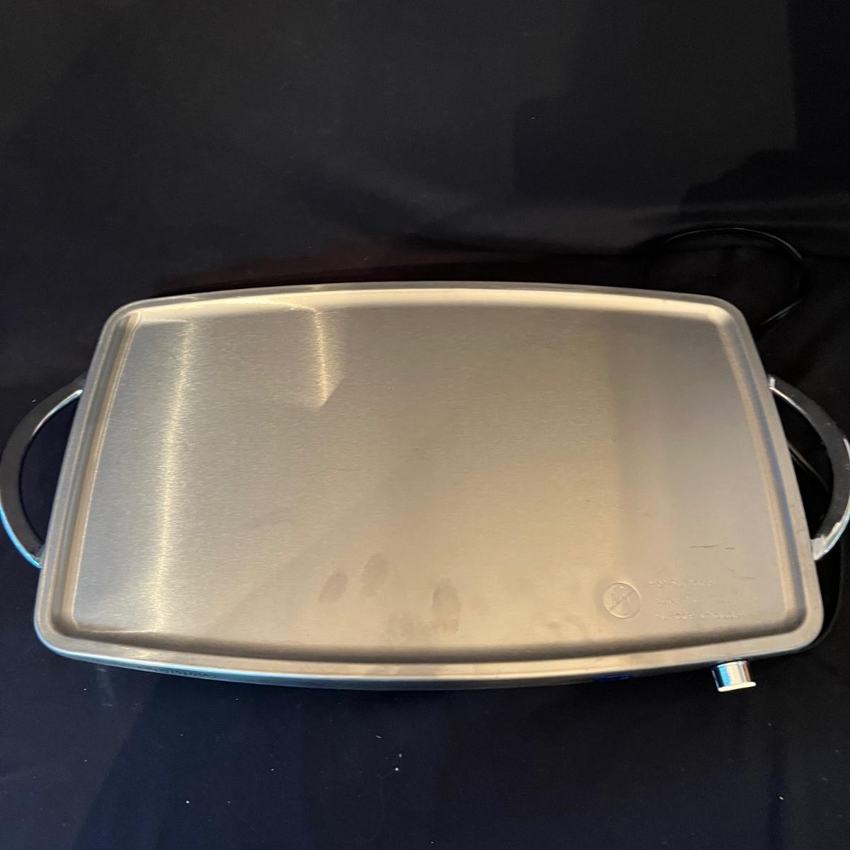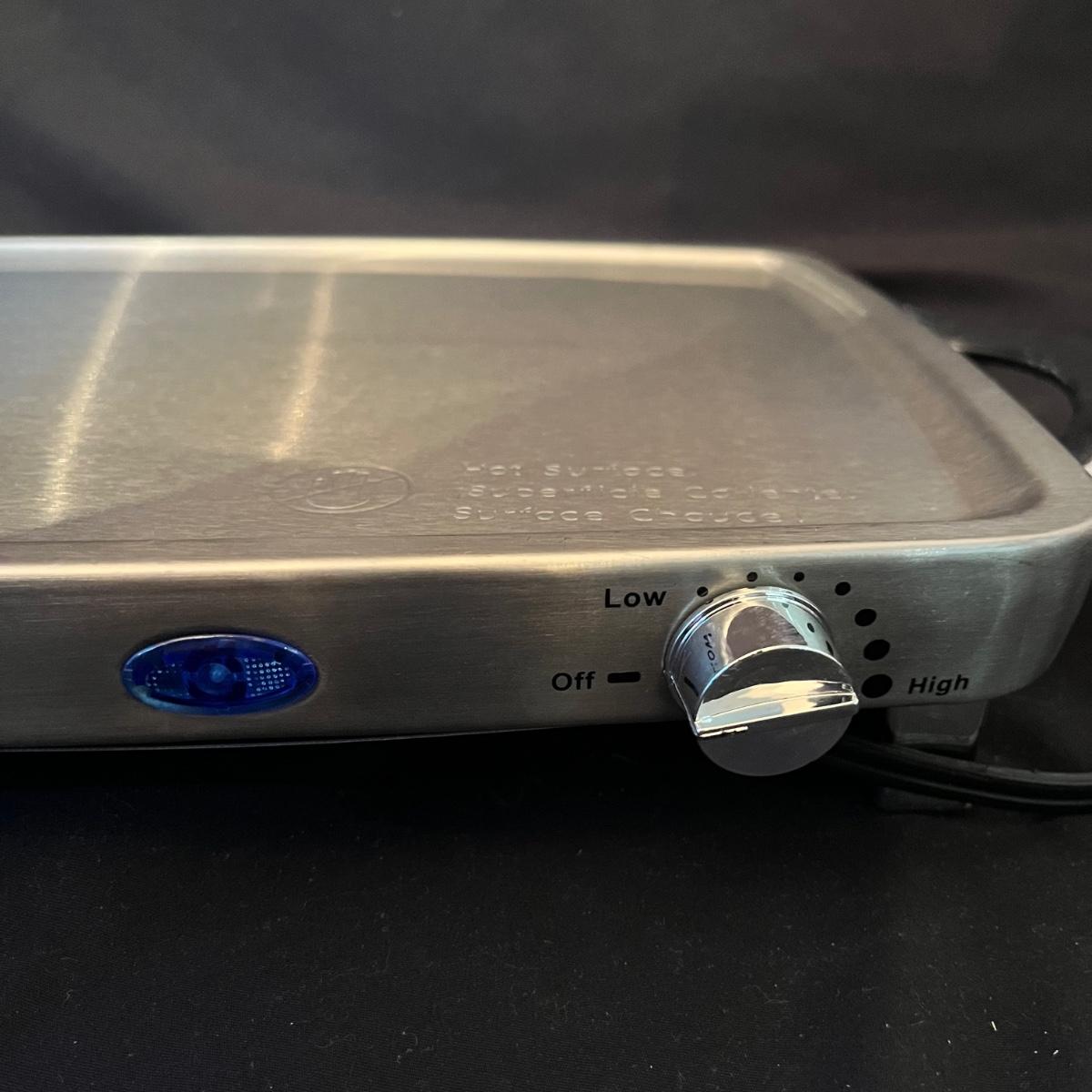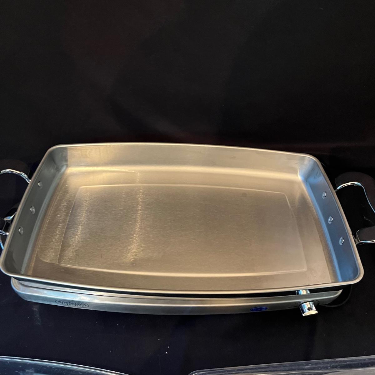 Lot includes à electric buffet server that powered on when plugged in. Also includes a two tier glass and metal food display stand and a metal and floral design glass stand. Display stand measures 28” x 10” x 14”H.l