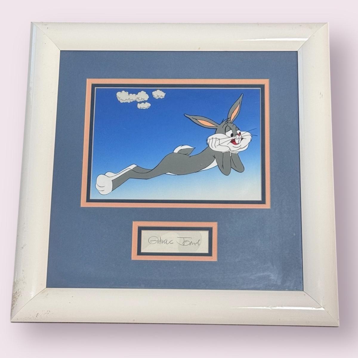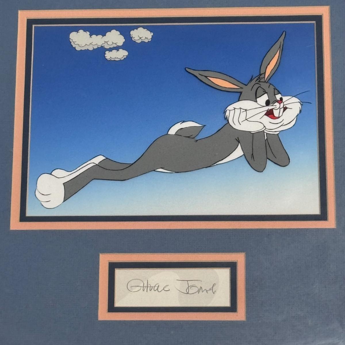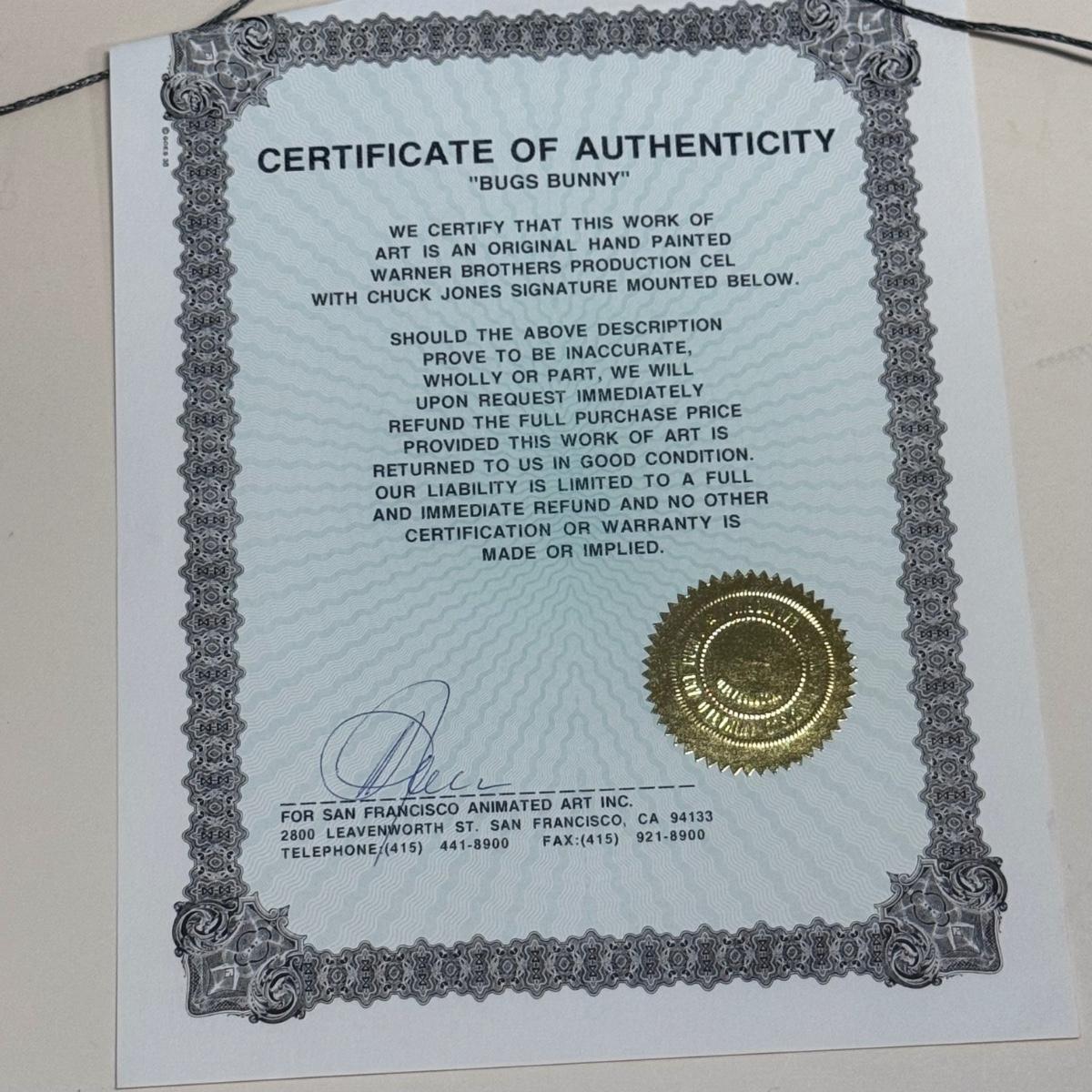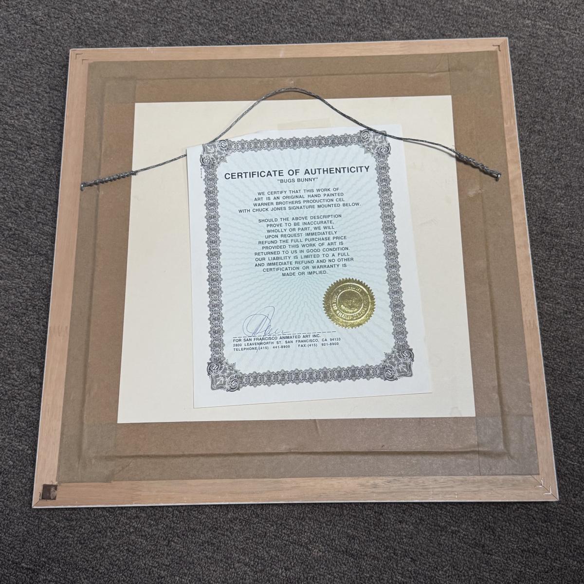 This lot includes one Warner Bro’s cel titled “Bug’s Bunny.” The cel is signed with Chuck Jones’ name. The art is protected with a glass layer, triple matting, and a wooden frame that’s has a white plastic protective coating. The frame measures 18” x 18”H. The certificate of authenticity is attached to the back of the frame.