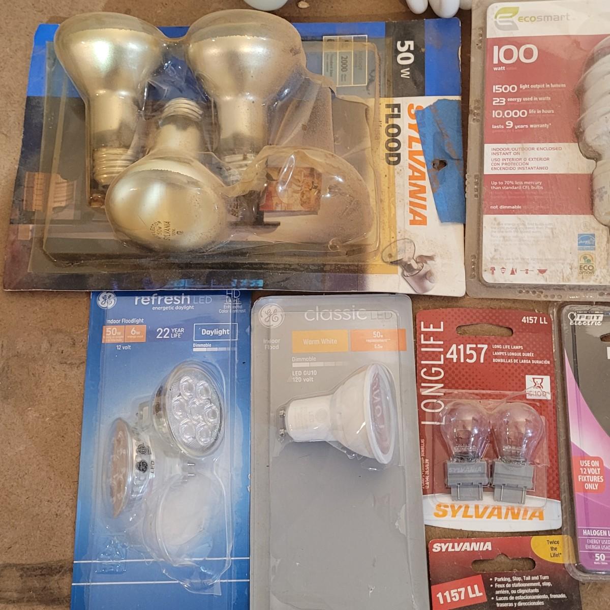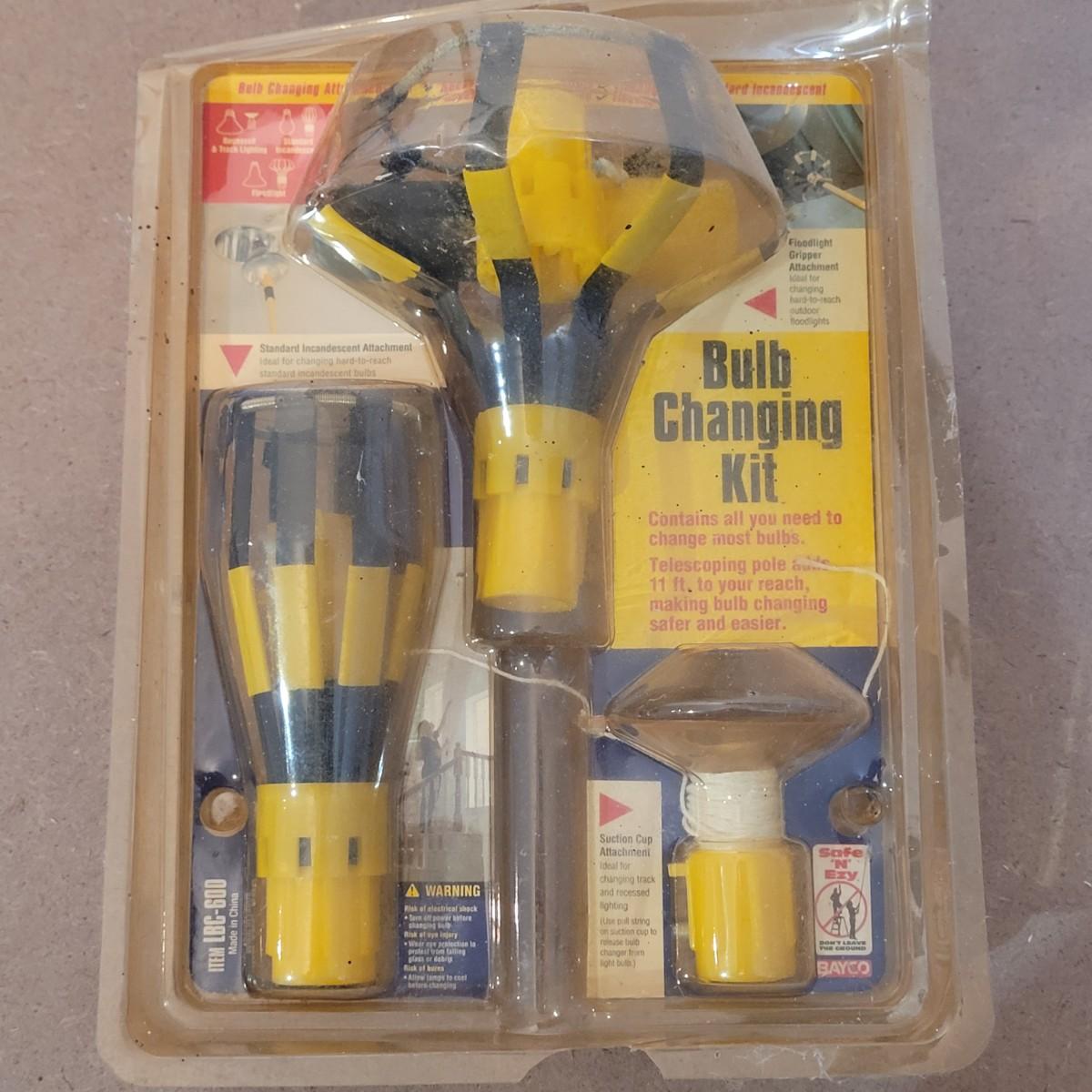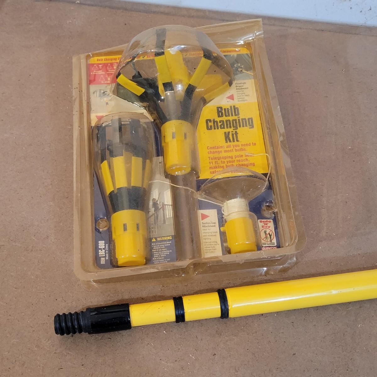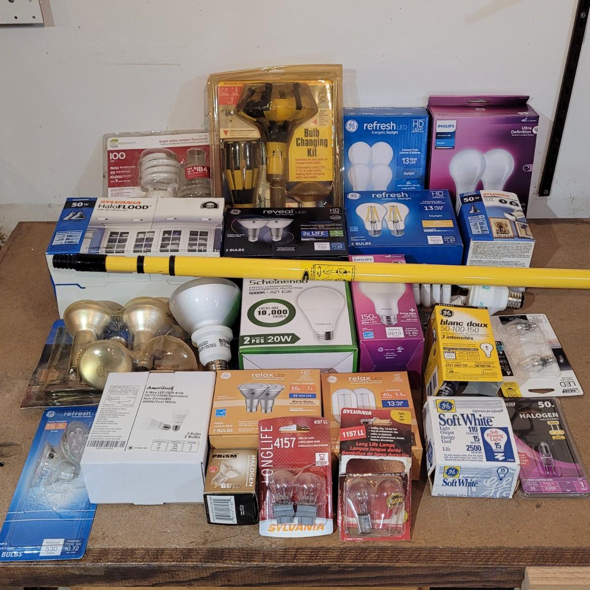 Lot of opened and unopened light bulbs of varying types and sizes. Also includes extendable bulb changing tool with attachments. Bulbs are not tested. Brands include Phillips, Sylvania, and GE. includes some traditional light bulbs as well as L.E.D., fluorescent, and halogen. Changing tool measures 52" long and extends to 11' (feet).
