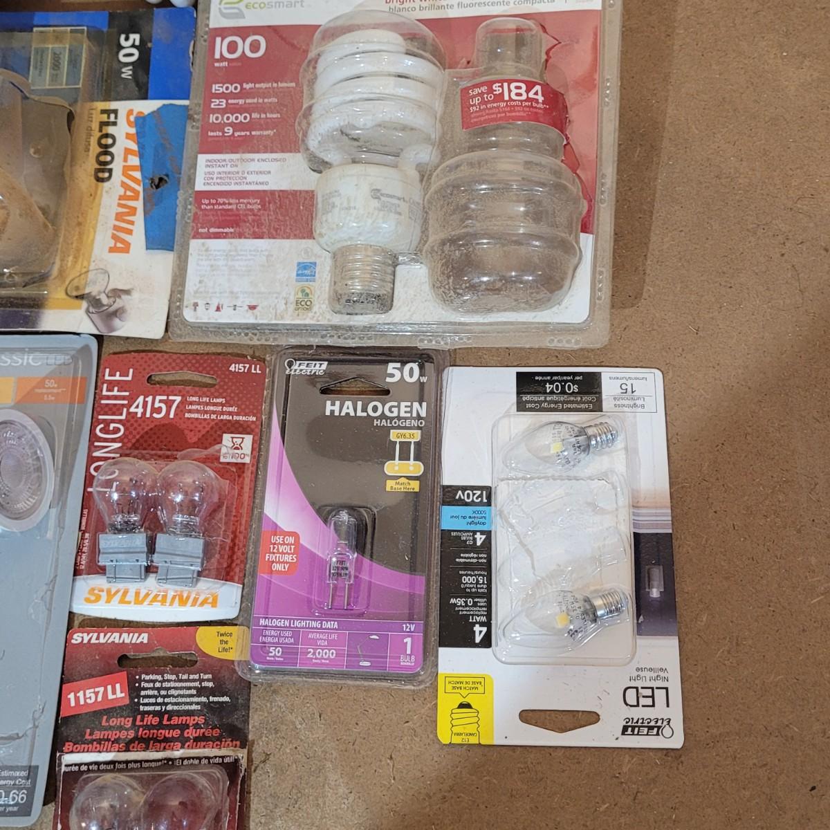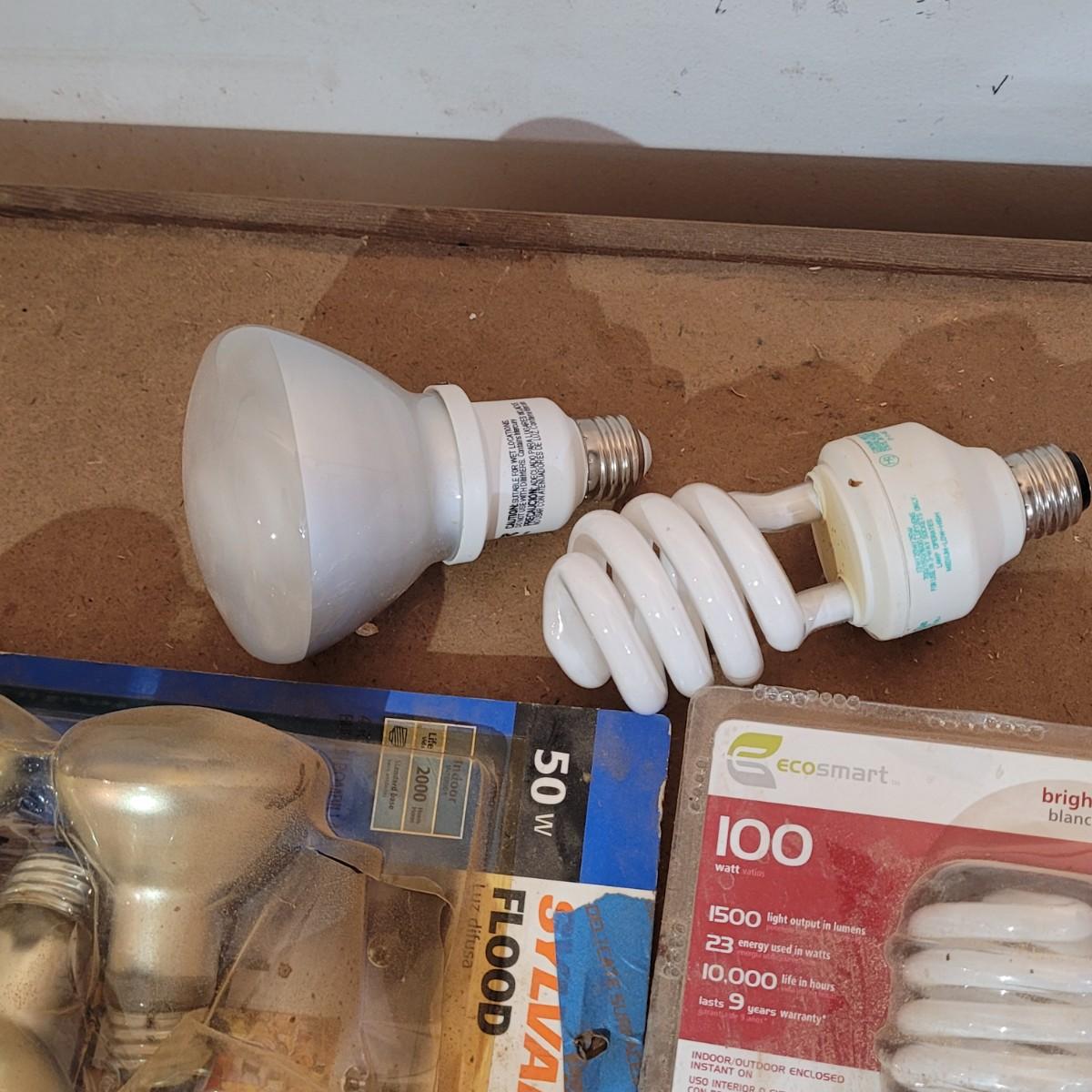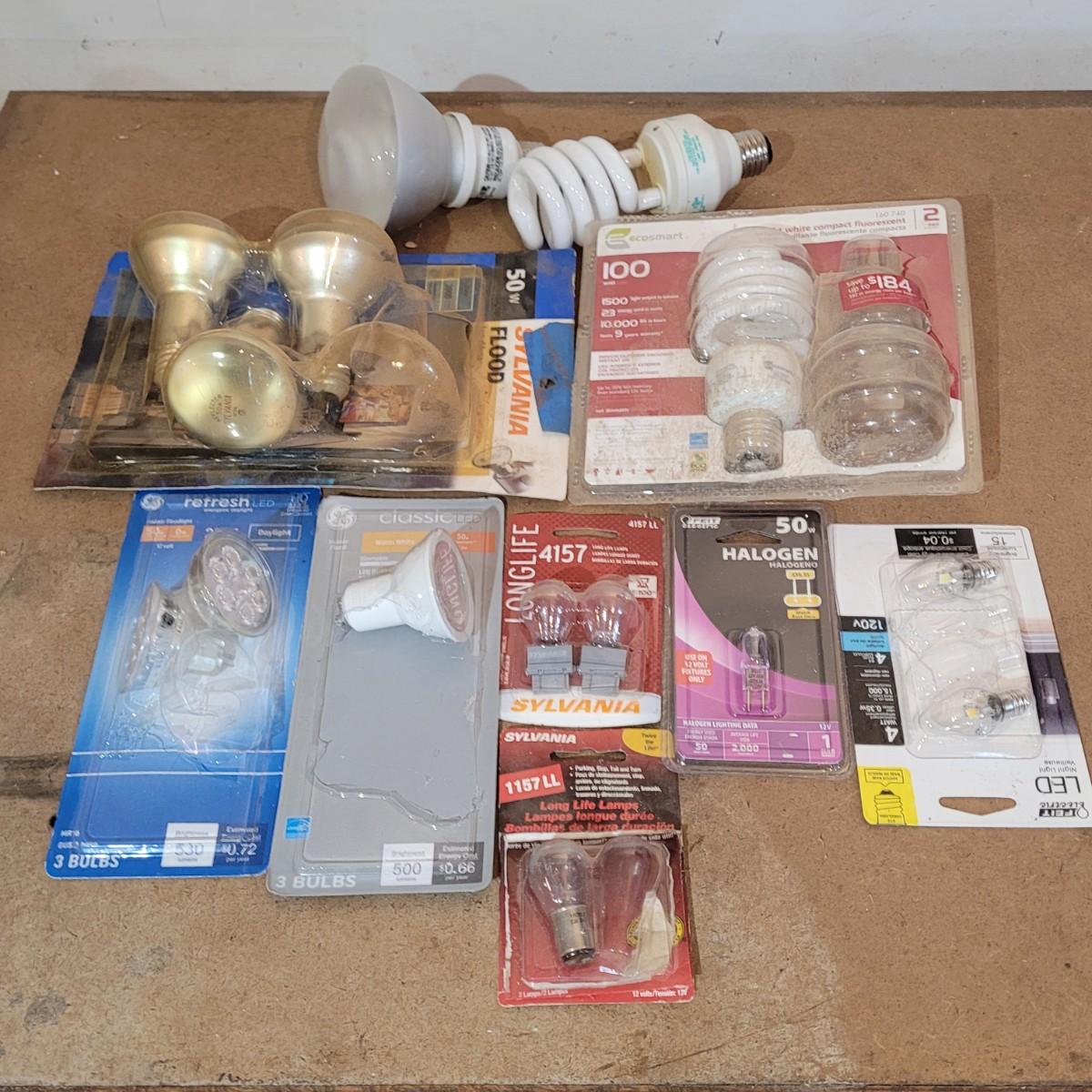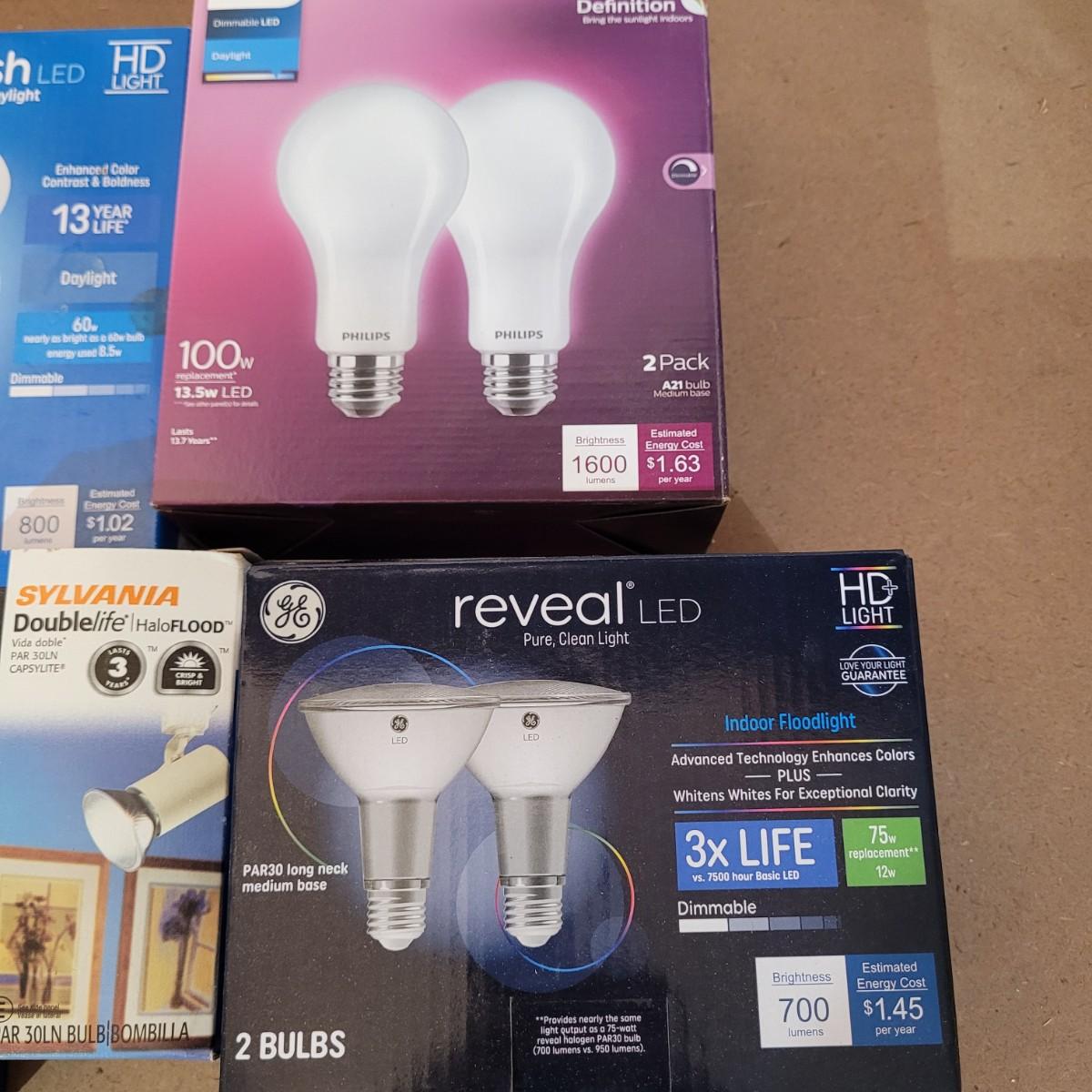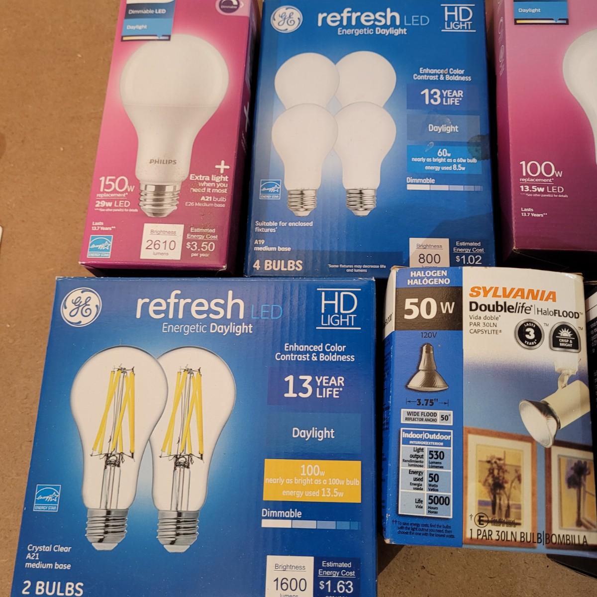 Lot of opened and unopened light bulbs of varying types and sizes. Also includes extendable bulb changing tool with attachments. Bulbs are not tested. Brands include Phillips, Sylvania, and GE. includes some traditional light bulbs as well as L.E.D., fluorescent, and halogen. Changing tool measures 52" long and extends to 11' (feet).