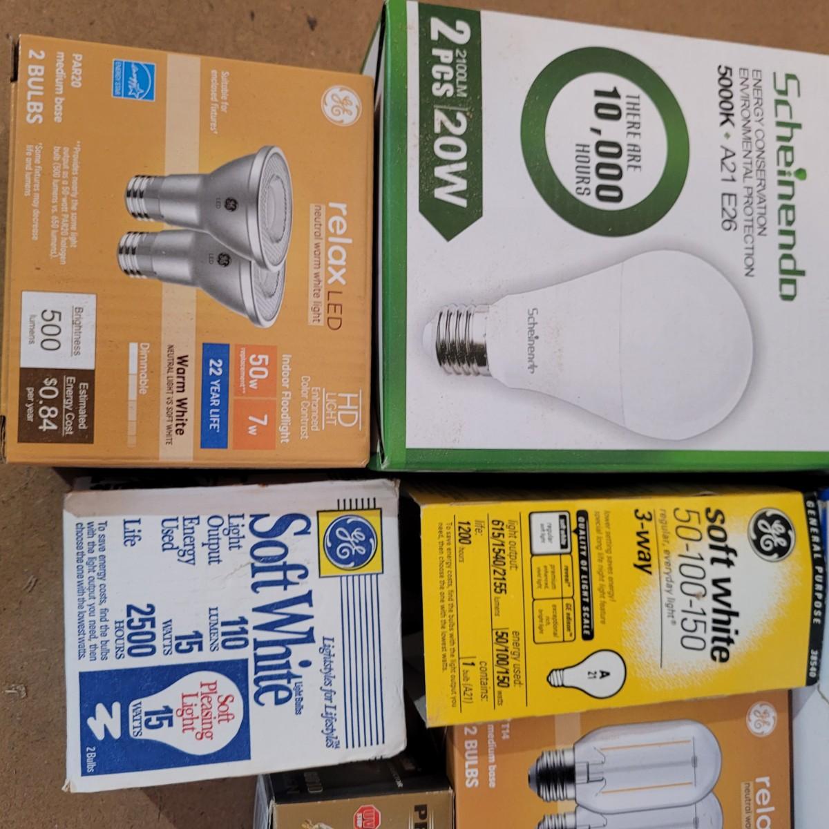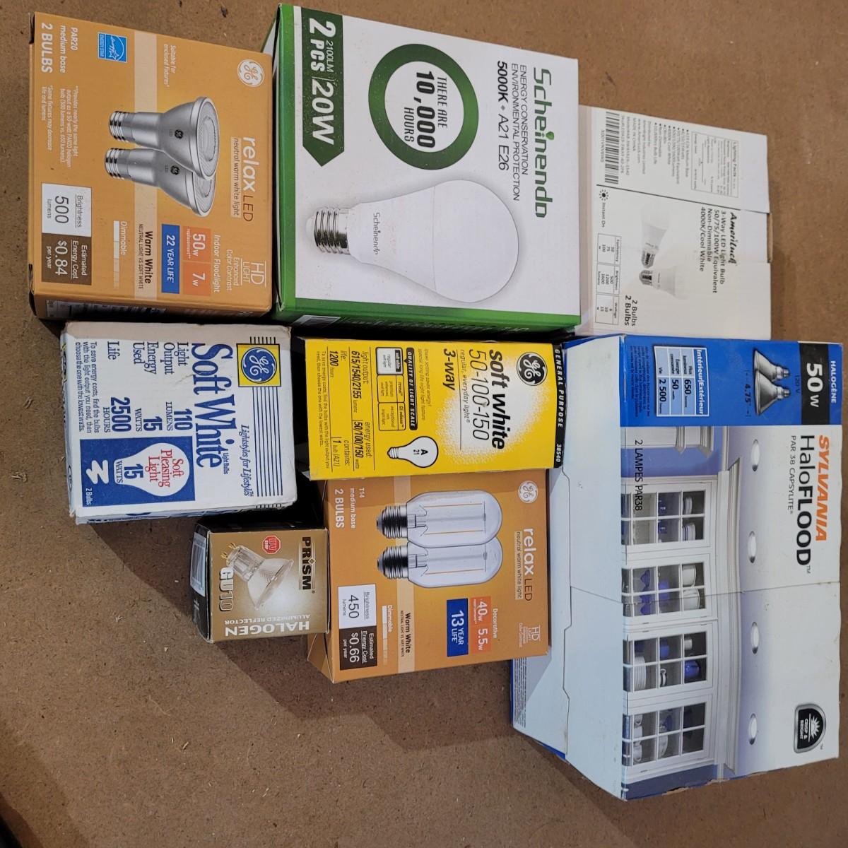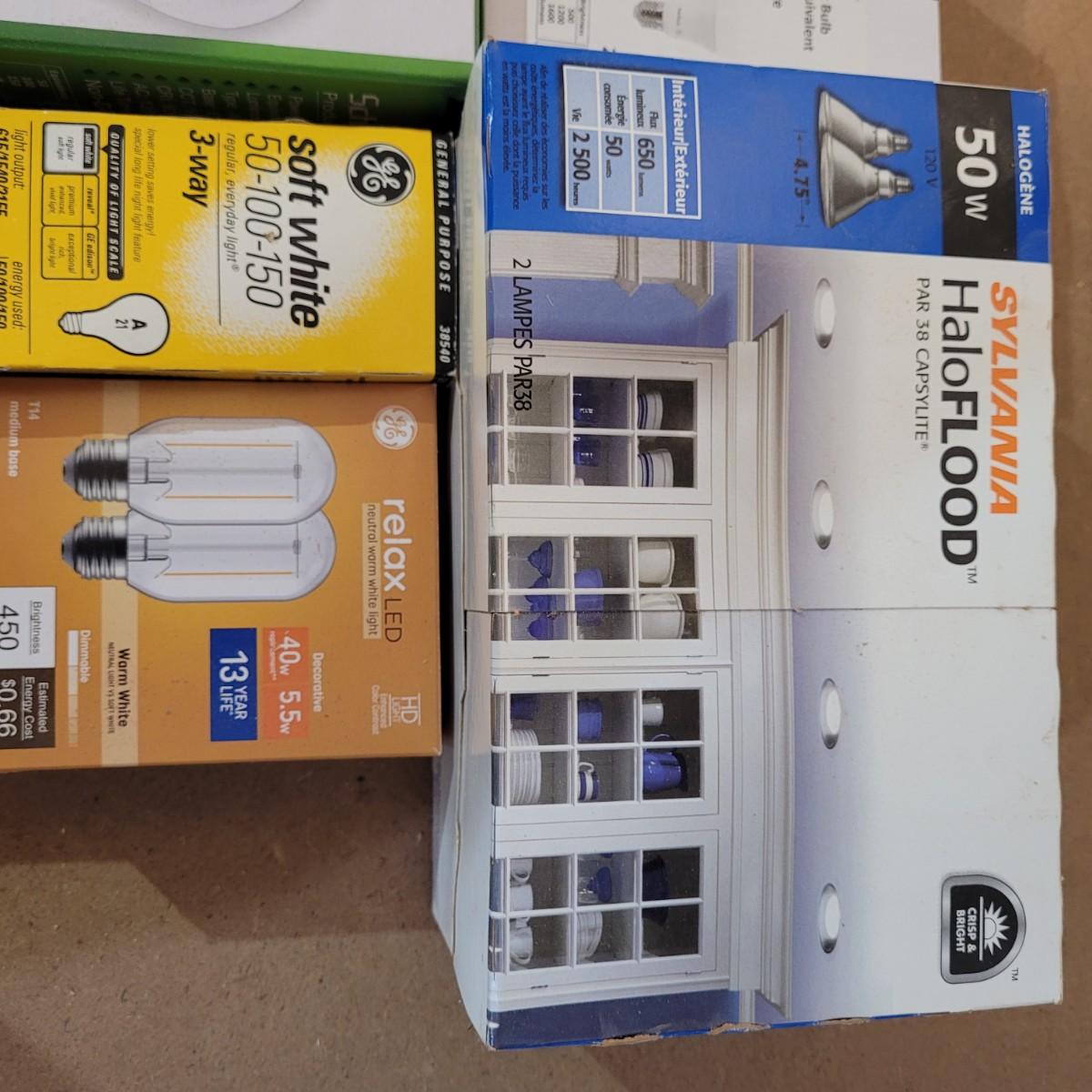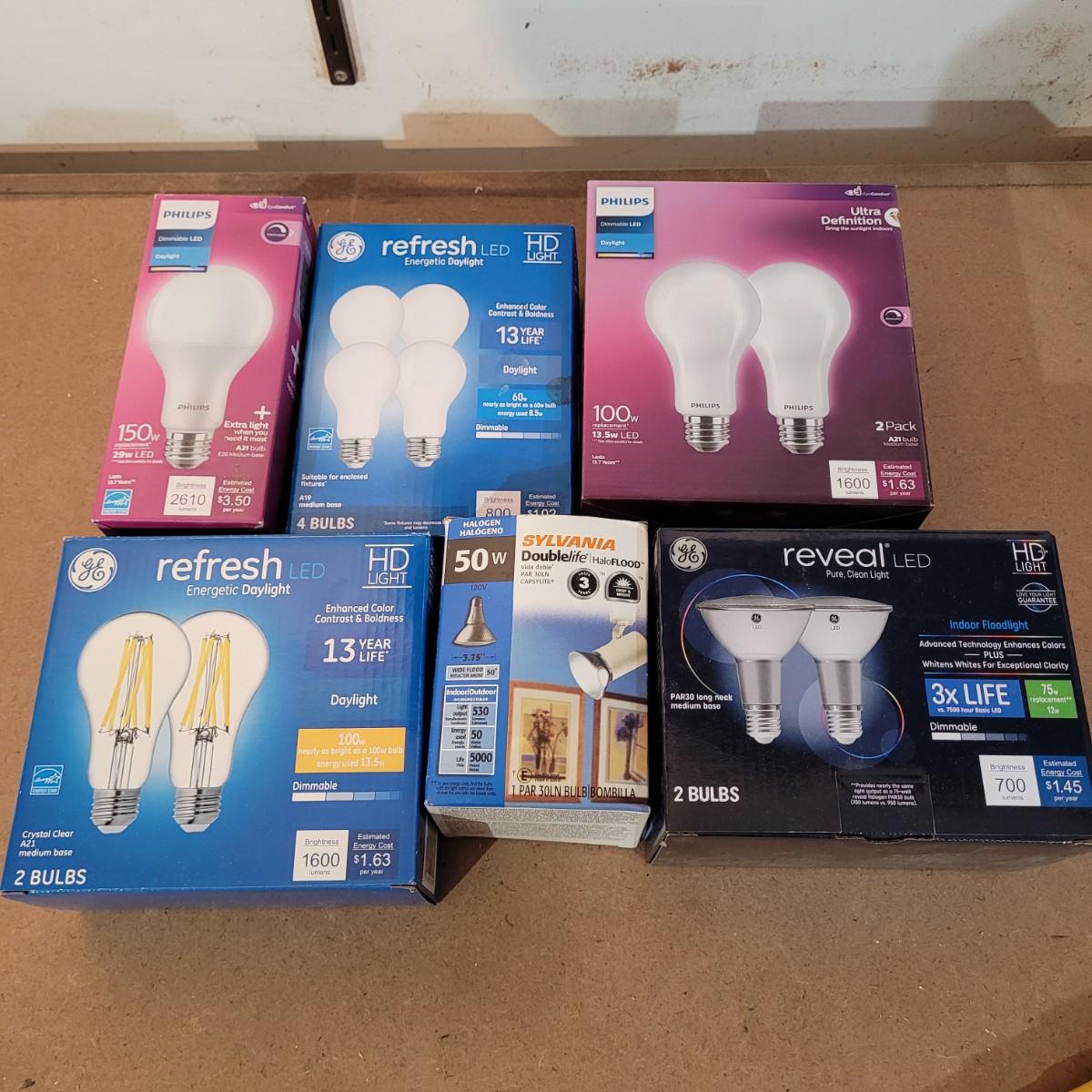 Lot of opened and unopened light bulbs of varying types and sizes. Also includes extendable bulb changing tool with attachments. Bulbs are not tested. Brands include Phillips, Sylvania, and GE. includes some traditional light bulbs as well as L.E.D., fluorescent, and halogen. Changing tool measures 52" long and extends to 11' (feet).