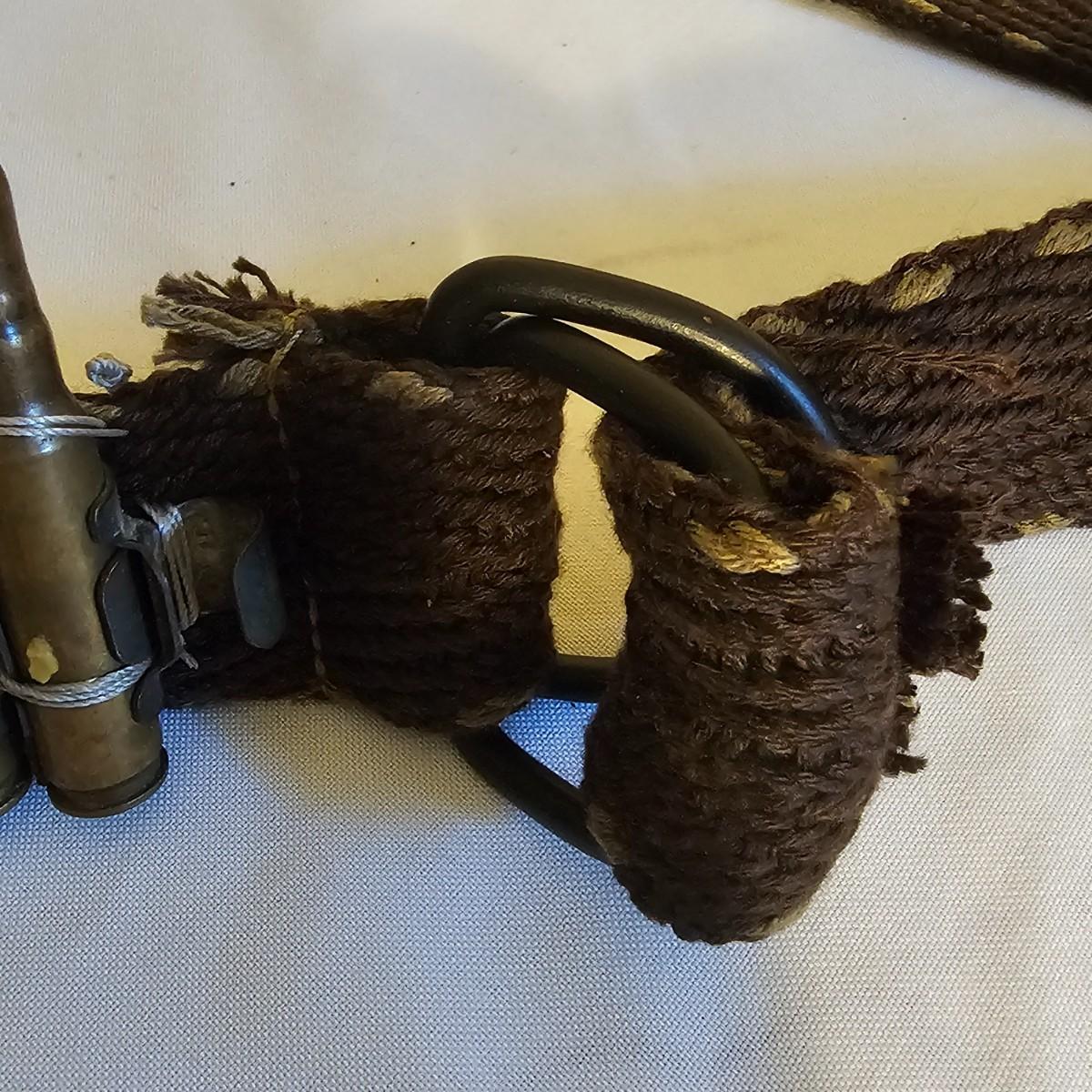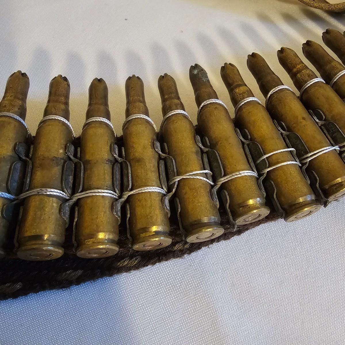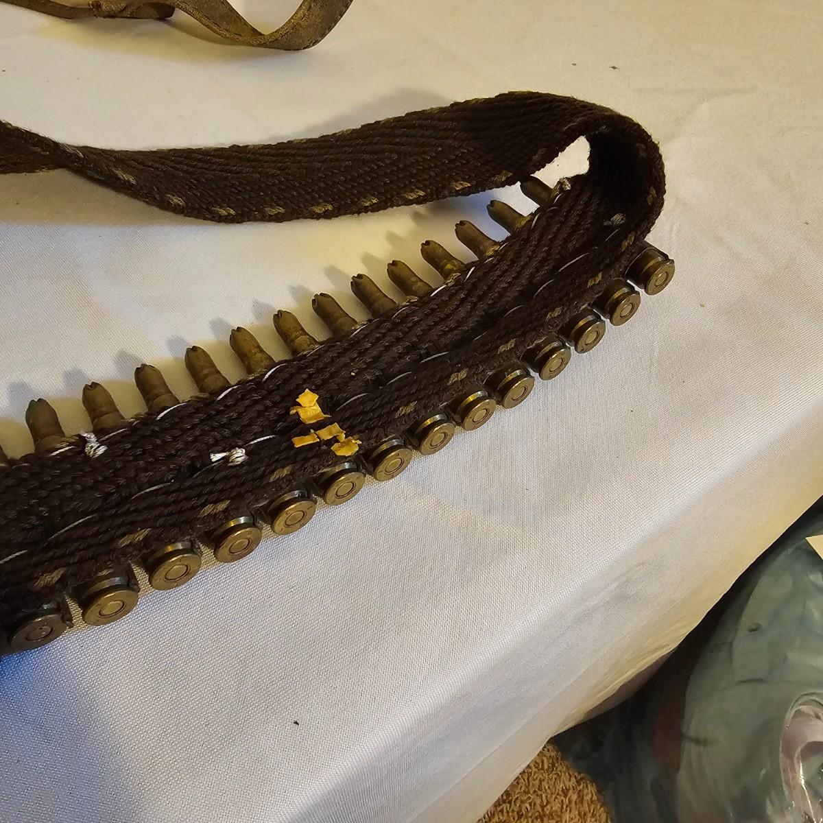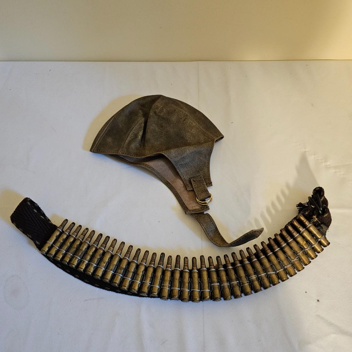 One link belt bullet belt/mandolin, possibly 5.56mm caliber. All bullets have had tips removed and are crimped over. Individual cartridges are 2.5"long. They are sewn into a cloth belt or bandolier piece which is 50" long if fully extended. Belt appears to be fixed at 25" length. Replica WWI flying cap has chin strap, is made of thin suede pieces sewn together. Cap measures 10.5" x 11"H. Tag indicates made in U.S.A and size is shown as S/M. See photos