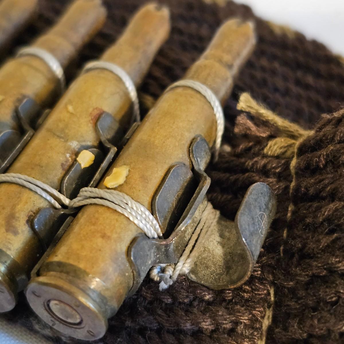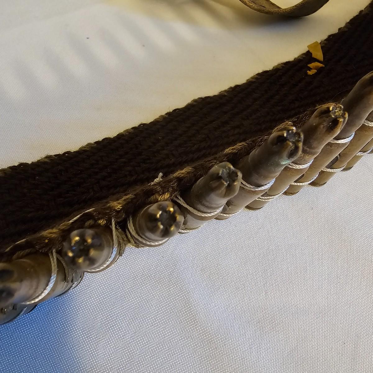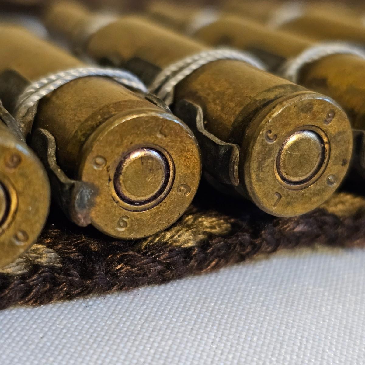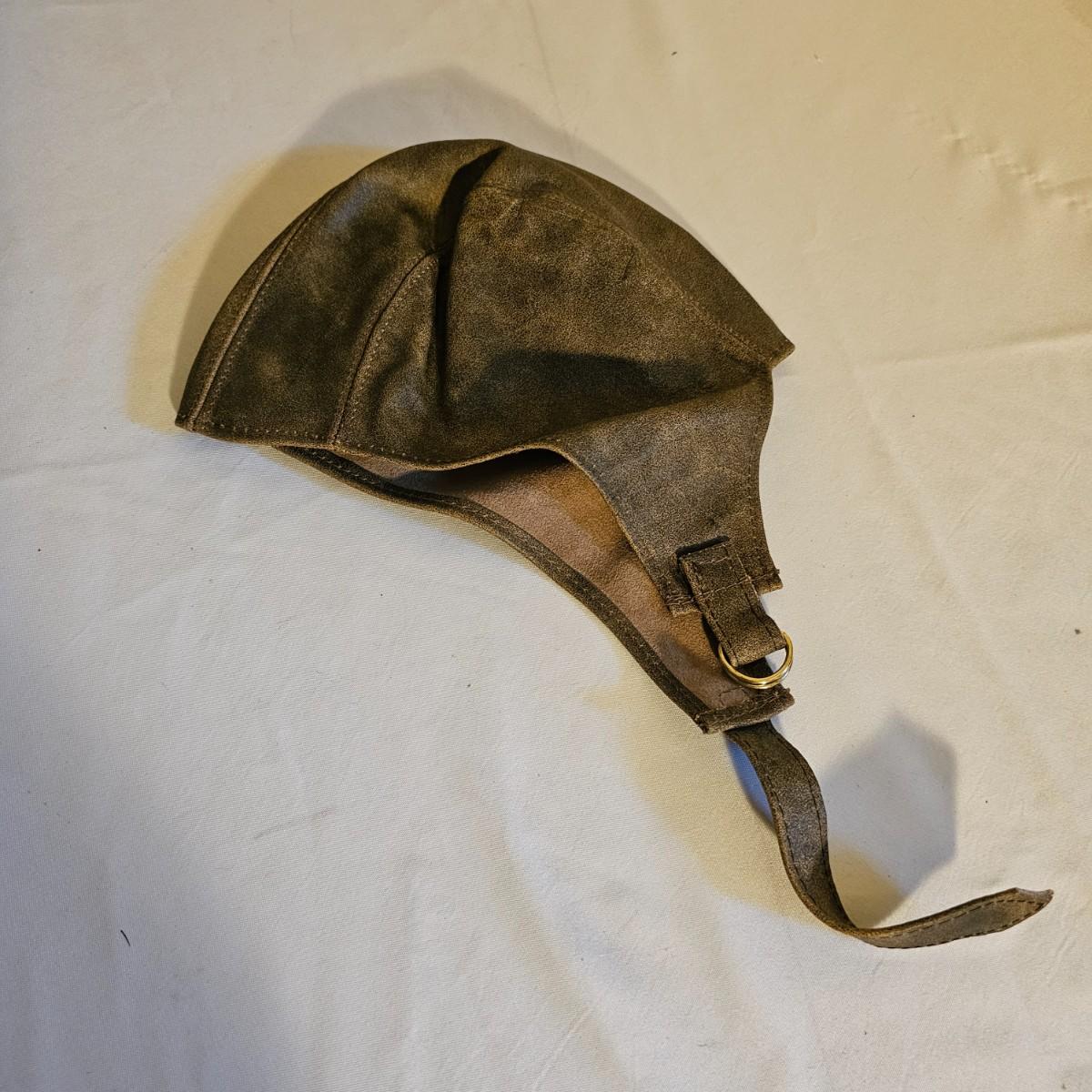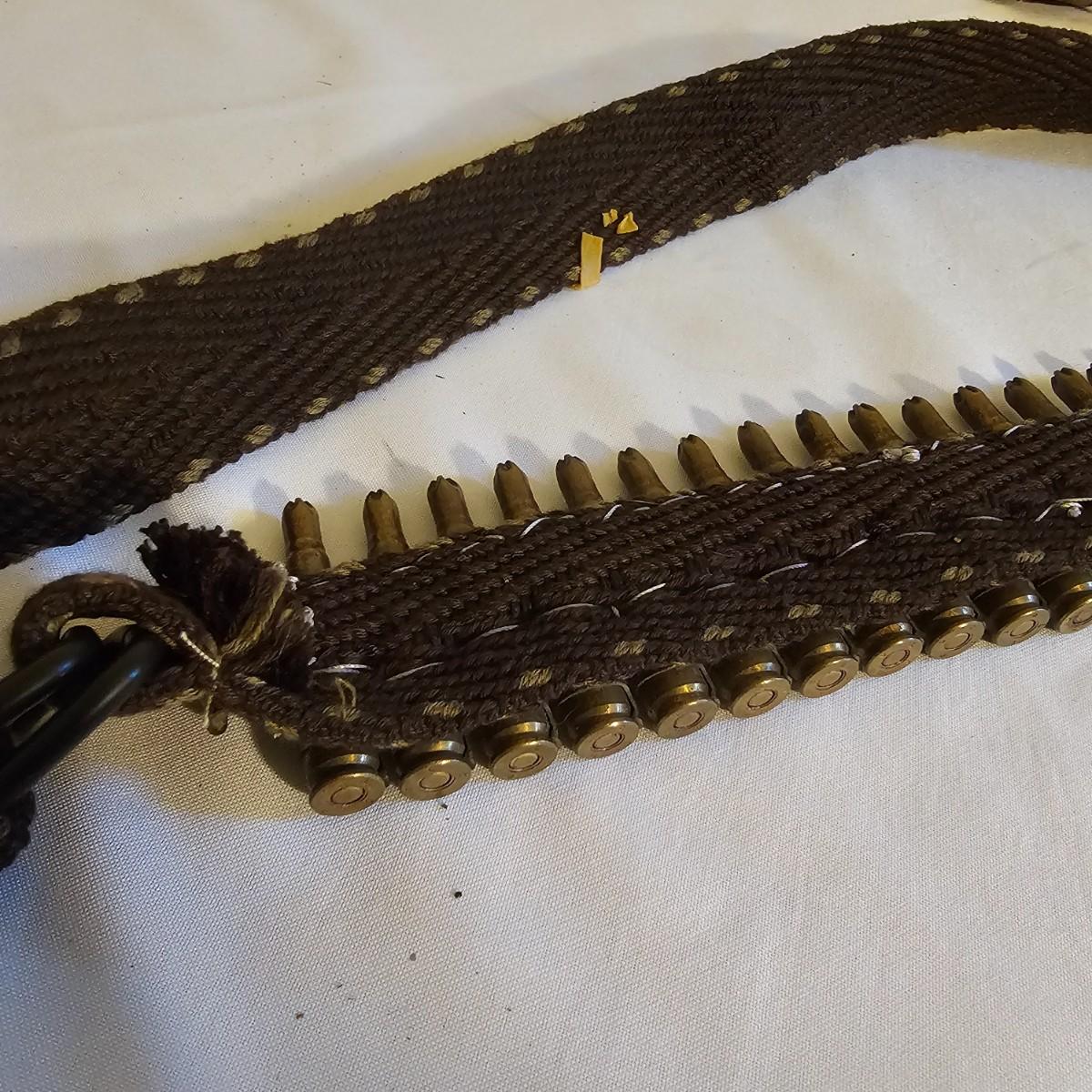 One link belt bullet belt/mandolin, possibly 5.56mm caliber. All bullets have had tips removed and are crimped over. Individual cartridges are 2.5"long. They are sewn into a cloth belt or bandolier piece which is 50" long if fully extended. Belt appears to be fixed at 25" length. Replica WWI flying cap has chin strap, is made of thin suede pieces sewn together. Cap measures 10.5" x 11"H. Tag indicates made in U.S.A and size is shown as S/M. See photos