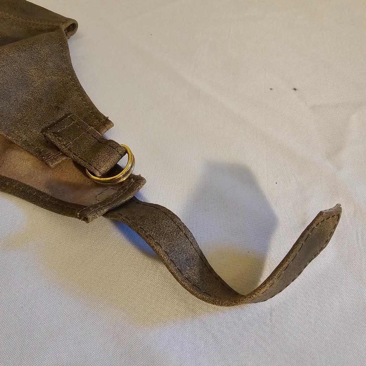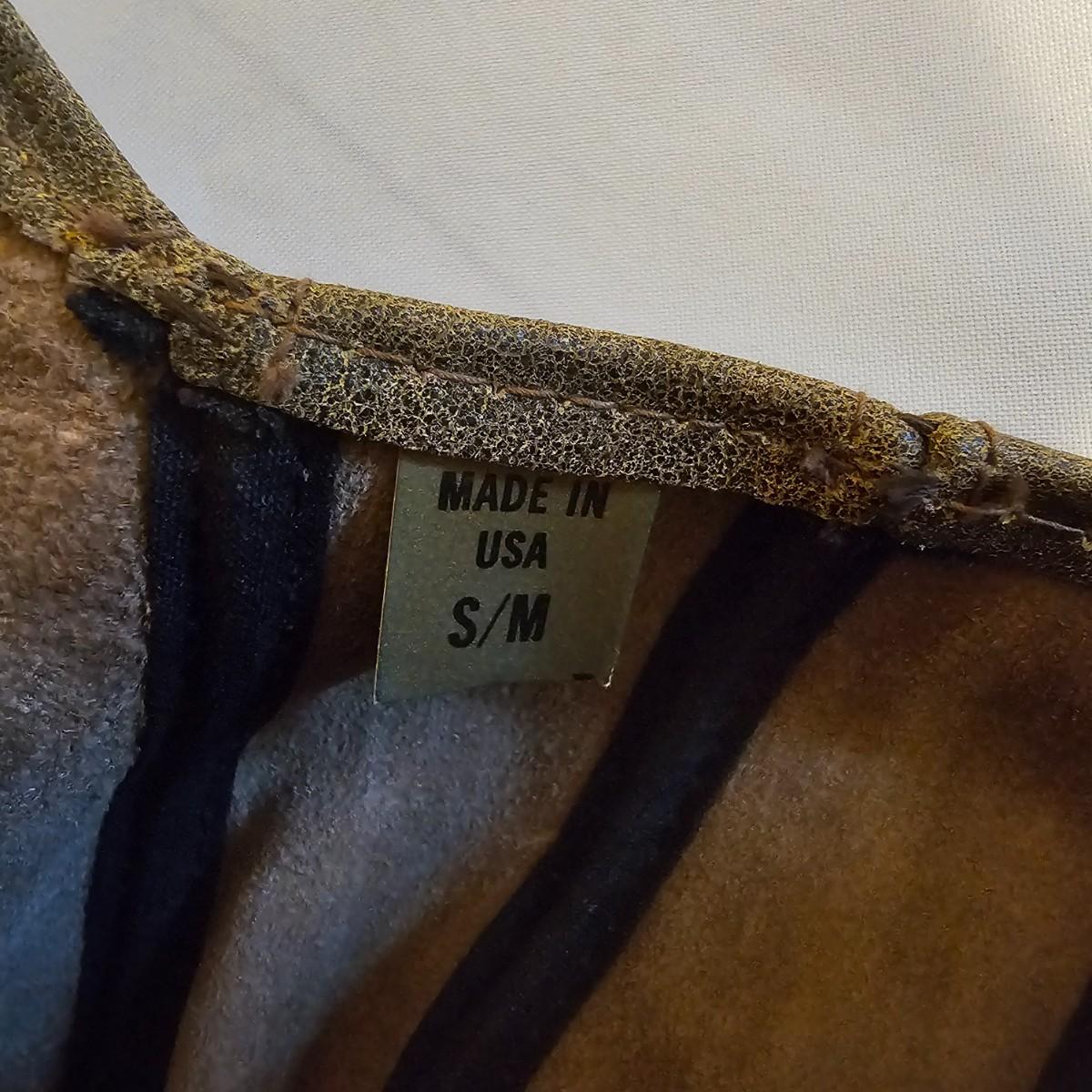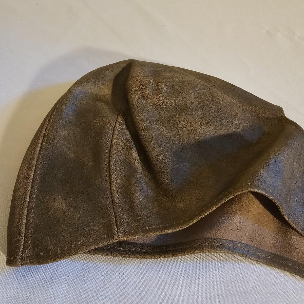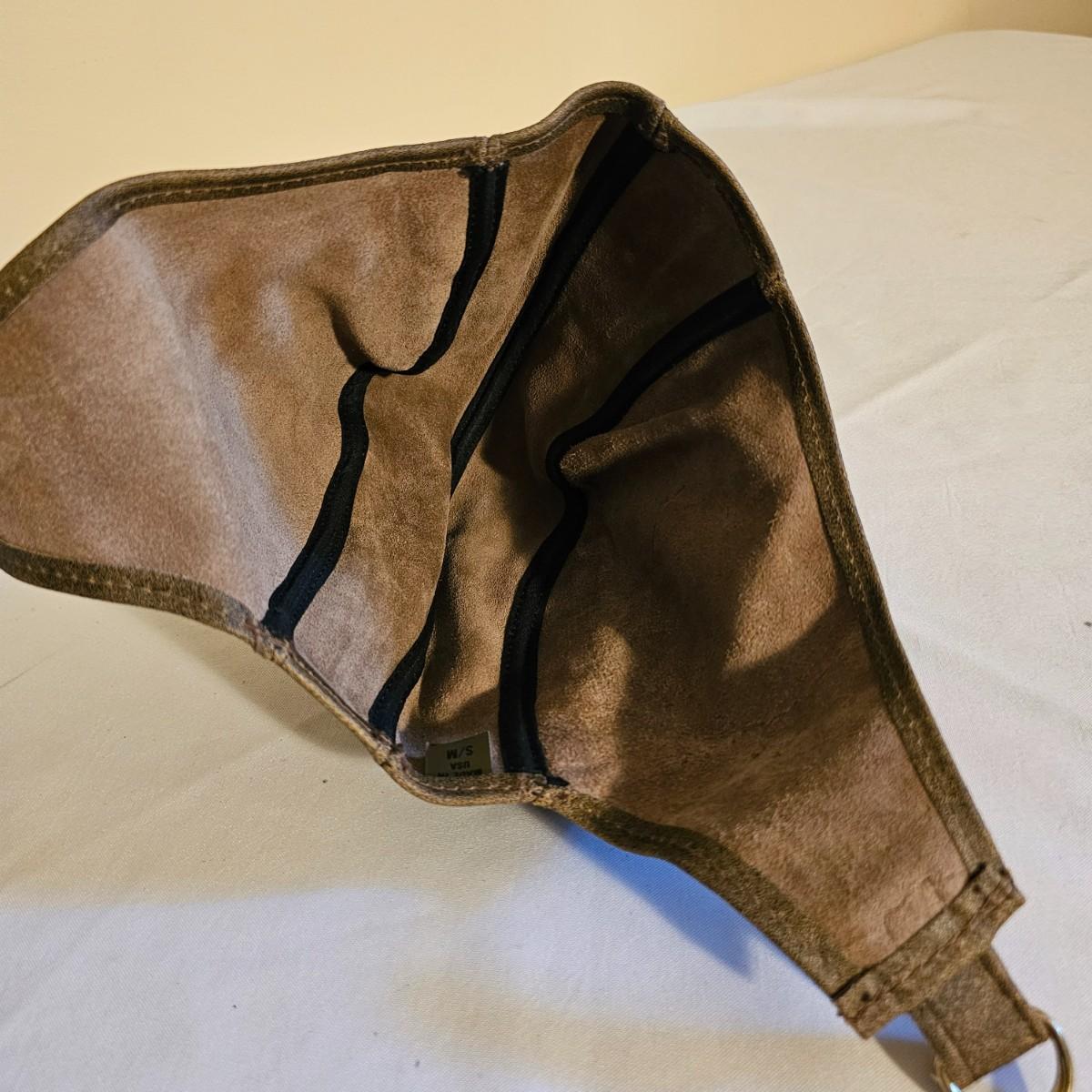 One link belt bullet belt/mandolin, possibly 5.56mm caliber. All bullets have had tips removed and are crimped over. Individual cartridges are 2.5"long. They are sewn into a cloth belt or bandolier piece which is 50" long if fully extended. Belt appears to be fixed at 25" length. Replica WWI flying cap has chin strap, is made of thin suede pieces sewn together. Cap measures 10.5" x 11"H. Tag indicates made in U.S.A and size is shown as S/M. See photos