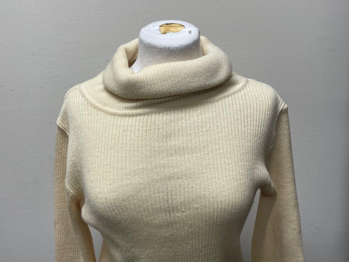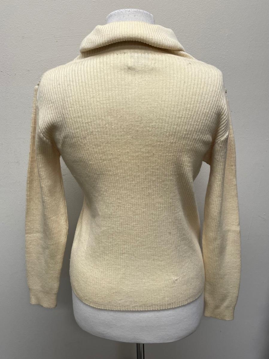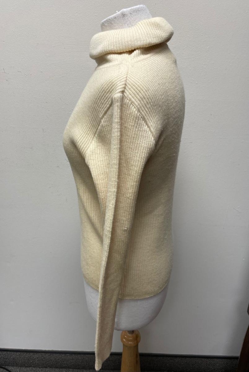 This sweater is in great condition. The neck part is very long so it has to be folded multiple times. The sweater is a medium. It is made up of 100% wool and made in Hong Kong. It is hand washable, do not wring, dry flat, dry cleanable.