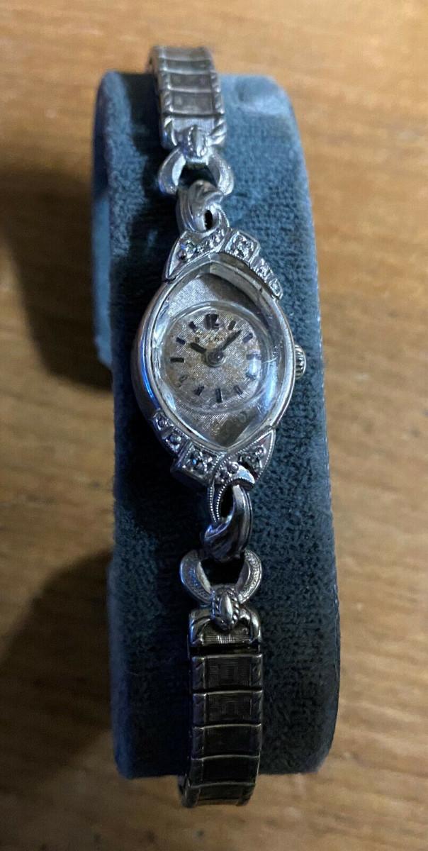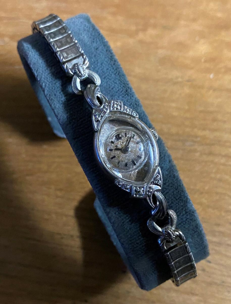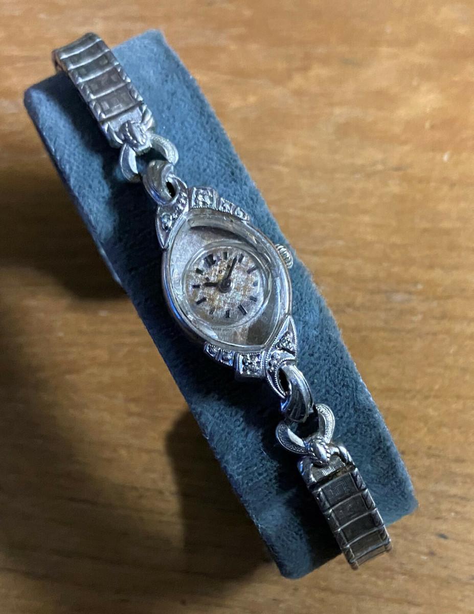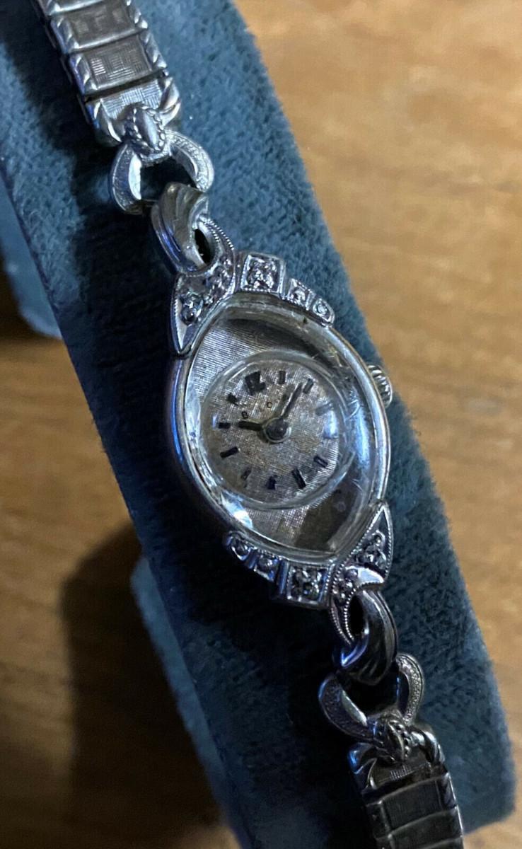 1964 First Lady "I" by Bulova...17 jewel..10 karat rolled gold case with four diamonds..Grade 5AR...Mechanical wind...Analong display...This estate watch could use a professional cleaning....Some discoloration on etched face and loss of script logo...Missing one cap on replacement Speidel twist band...Faceted crystal..Shock resistant..It is running but we have no service history and offer it as is