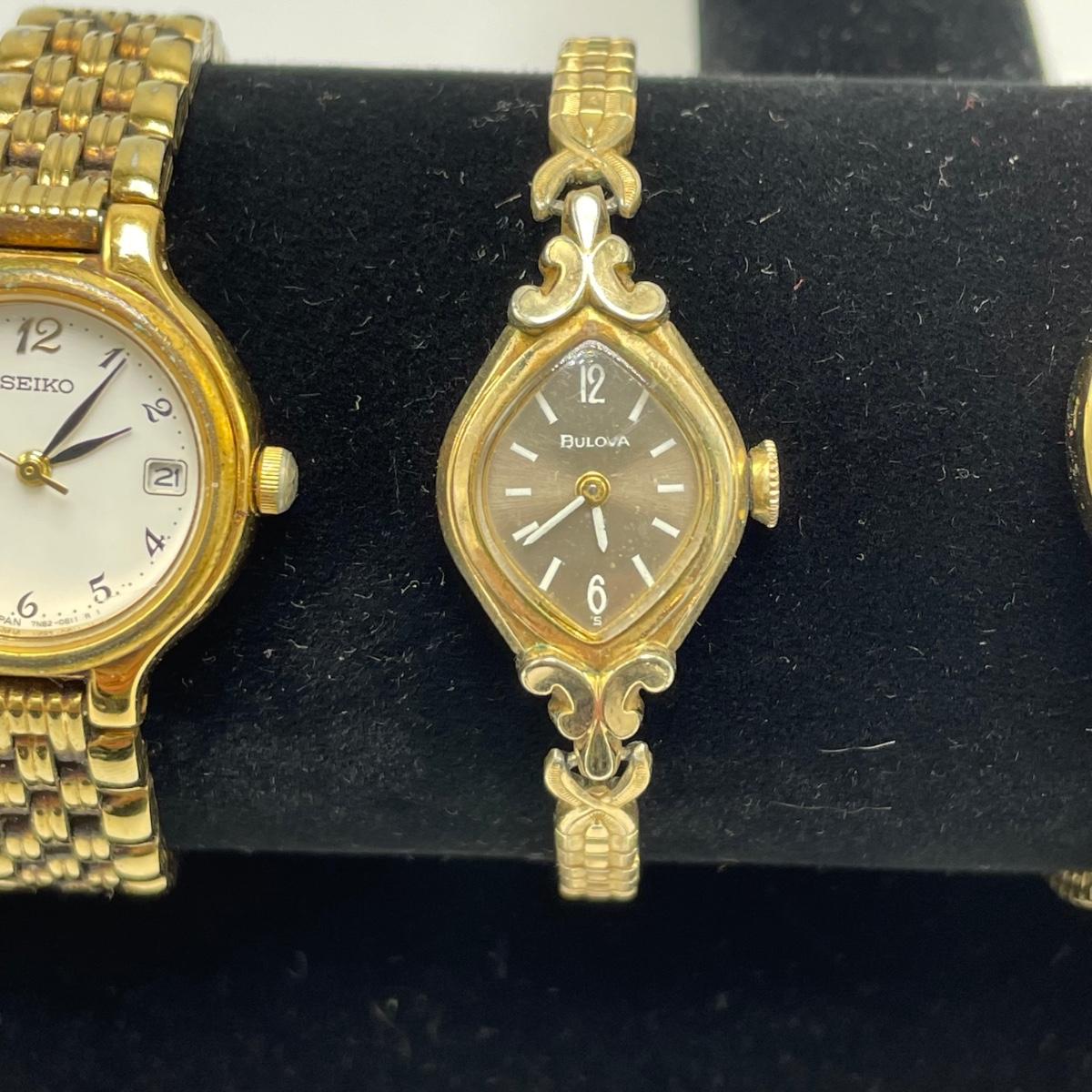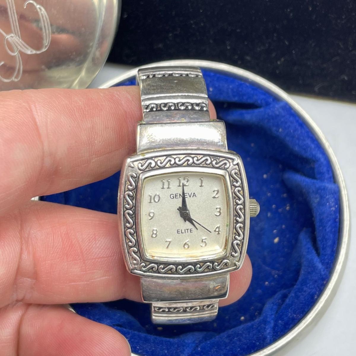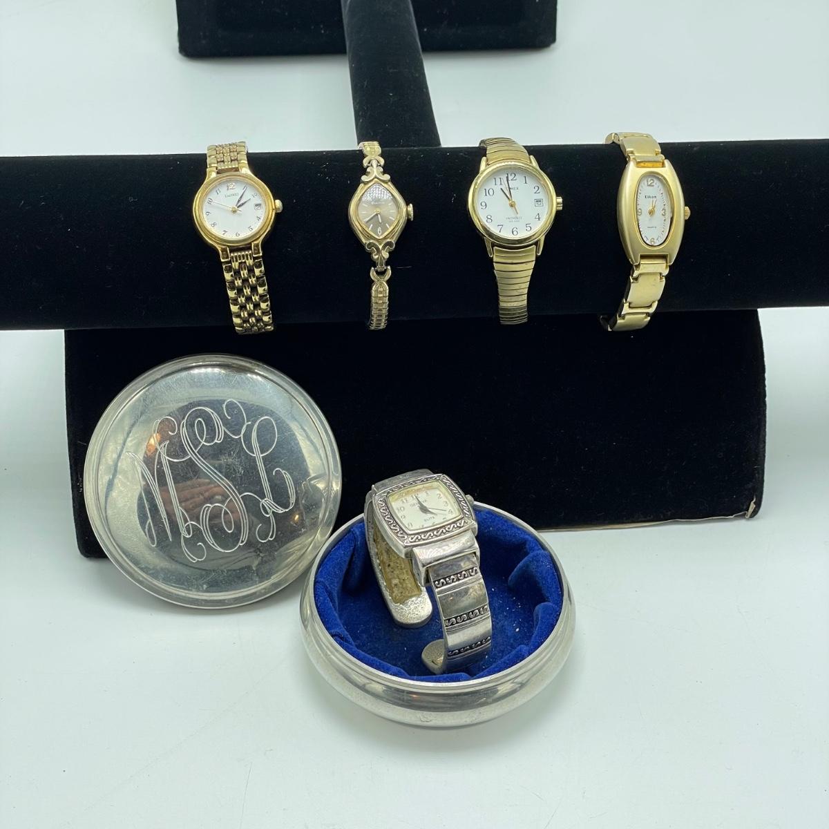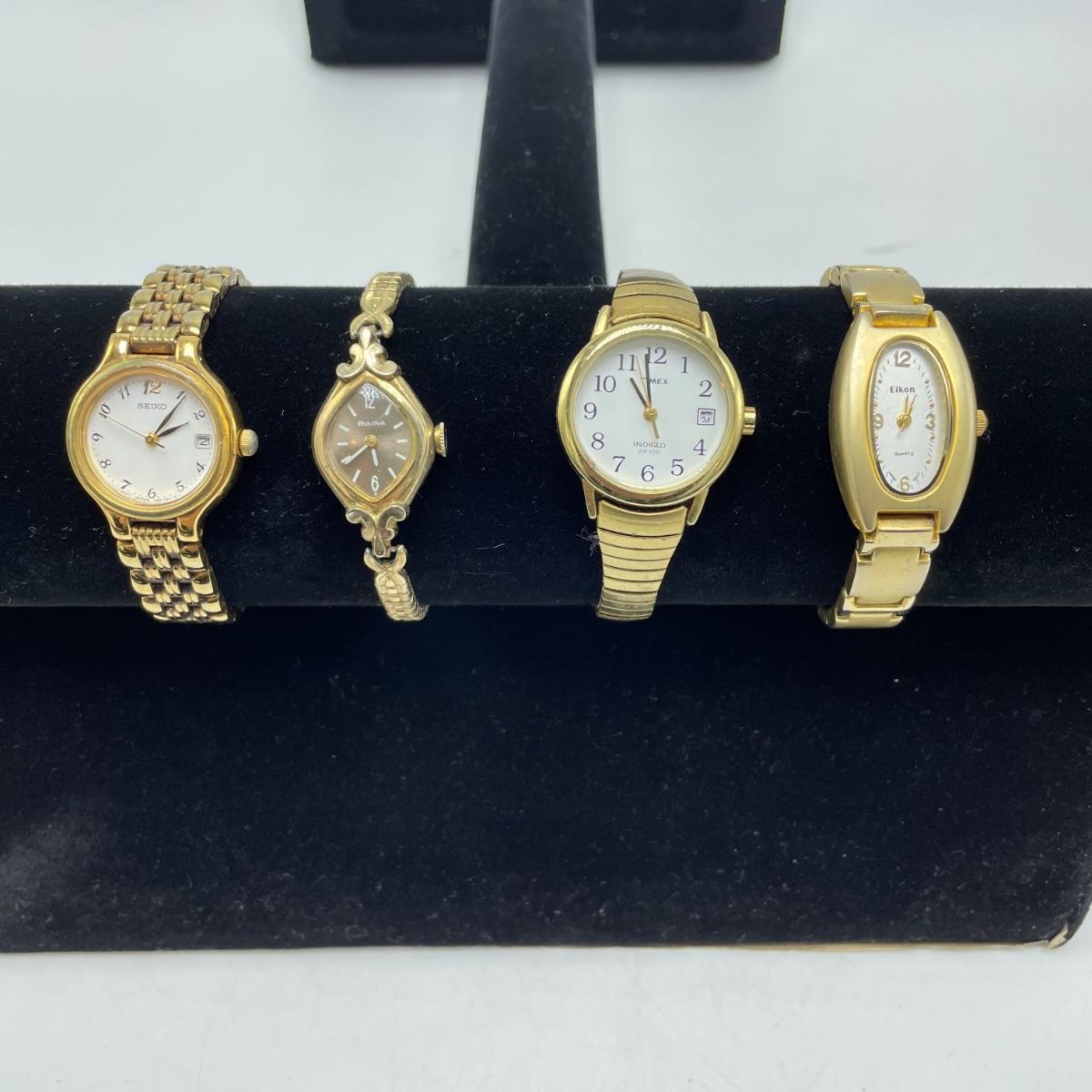 Vintage Bulova watch with Speidel elastic band along with Eikon, Seiko, Timex and Geneva watch with pewter case. Case has an etched monogram. The watches all appear in fine condition, but we were unable to test as likely batteries need replaced. See images. Shipping available.