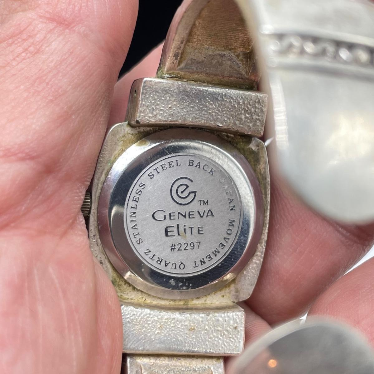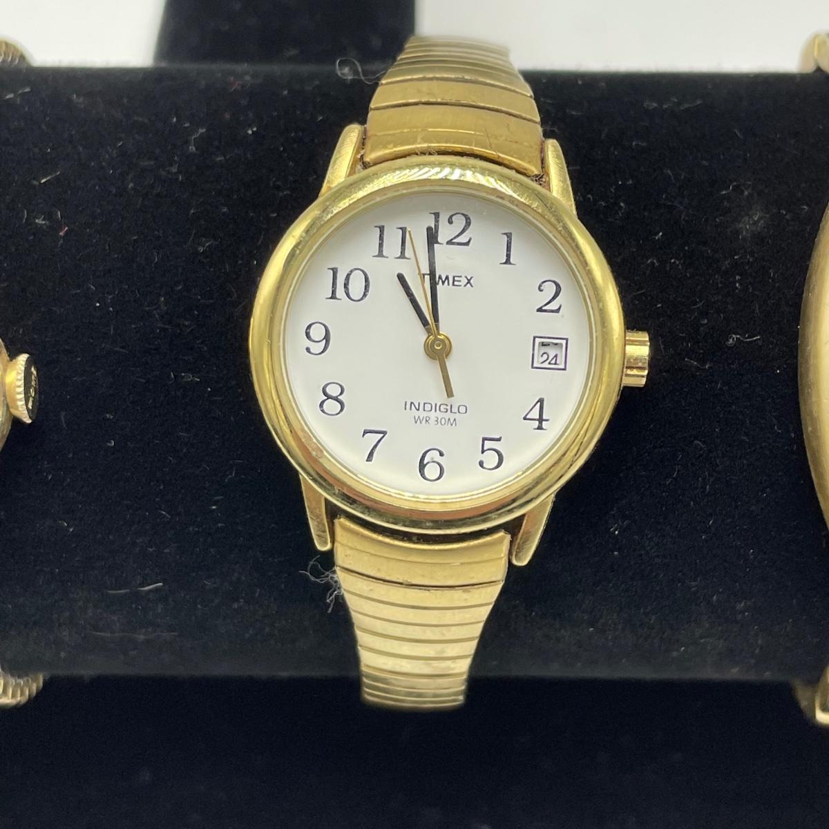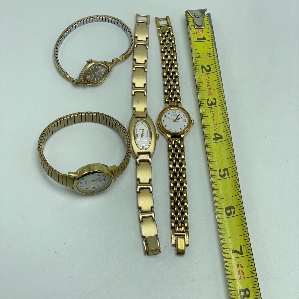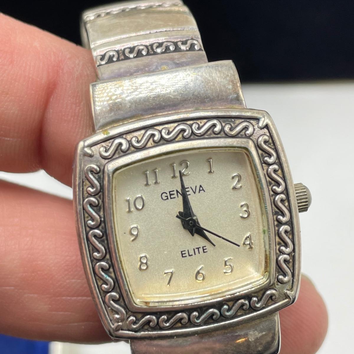 Vintage Bulova watch with Speidel elastic band along with Eikon, Seiko, Timex and Geneva watch with pewter case. Case has an etched monogram. The watches all appear in fine condition, but we were unable to test as likely batteries need replaced. See images. Shipping available.
