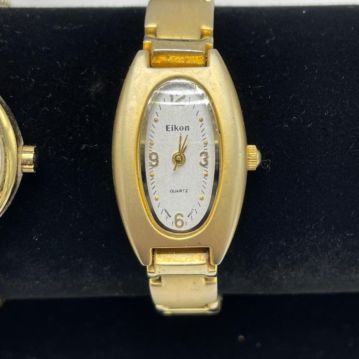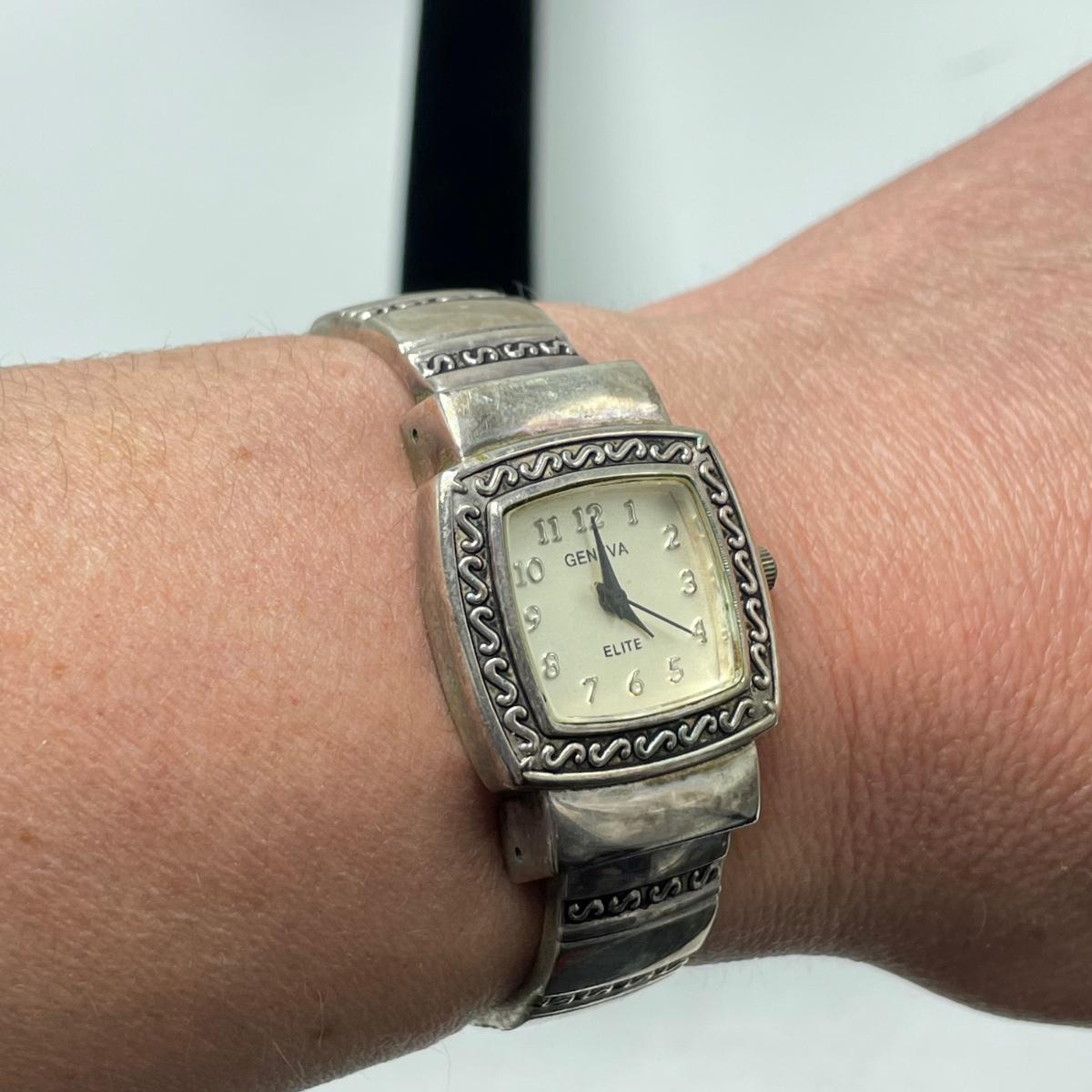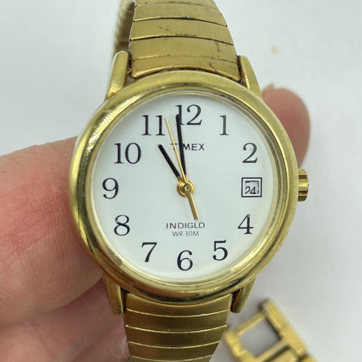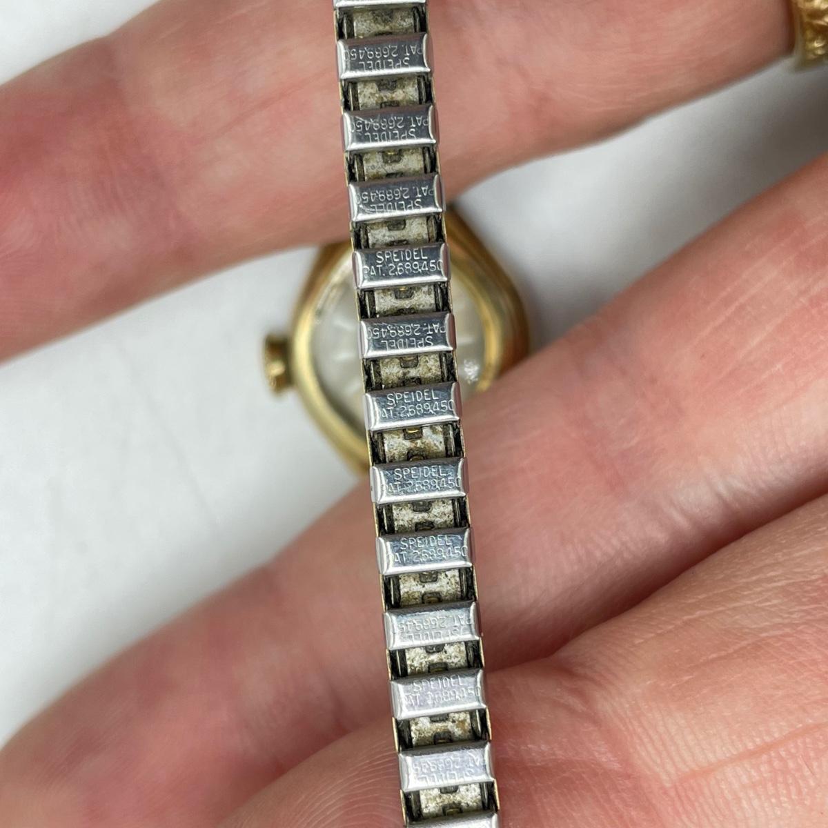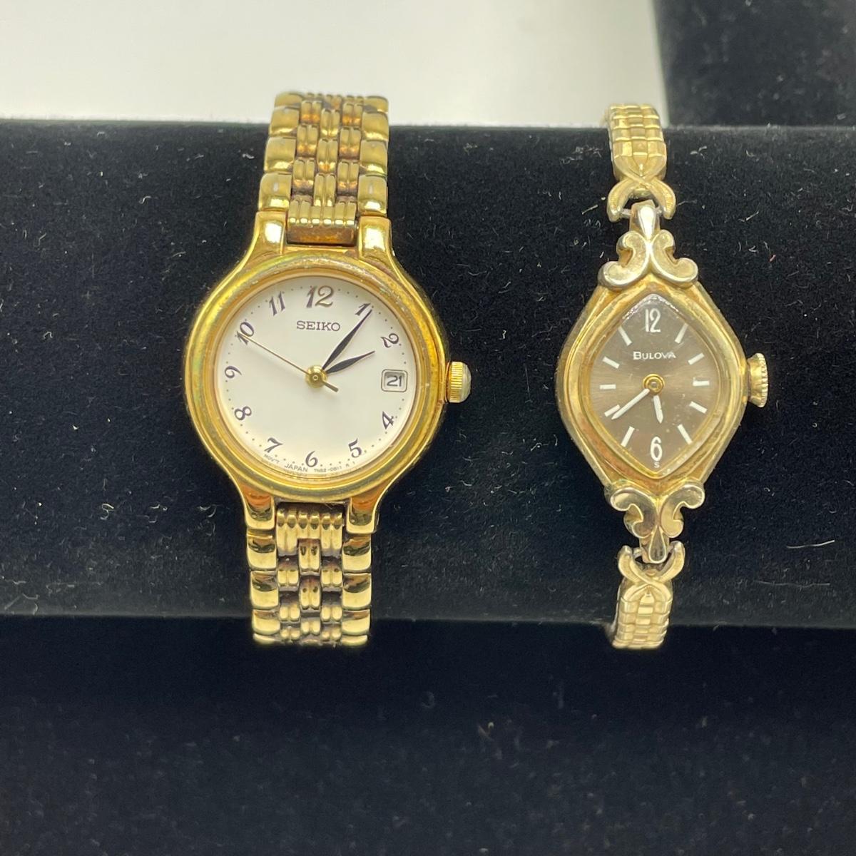 Vintage Bulova watch with Speidel elastic band along with Eikon, Seiko, Timex and Geneva watch with pewter case. Case has an etched monogram. The watches all appear in fine condition, but we were unable to test as likely batteries need replaced. See images. Shipping available.