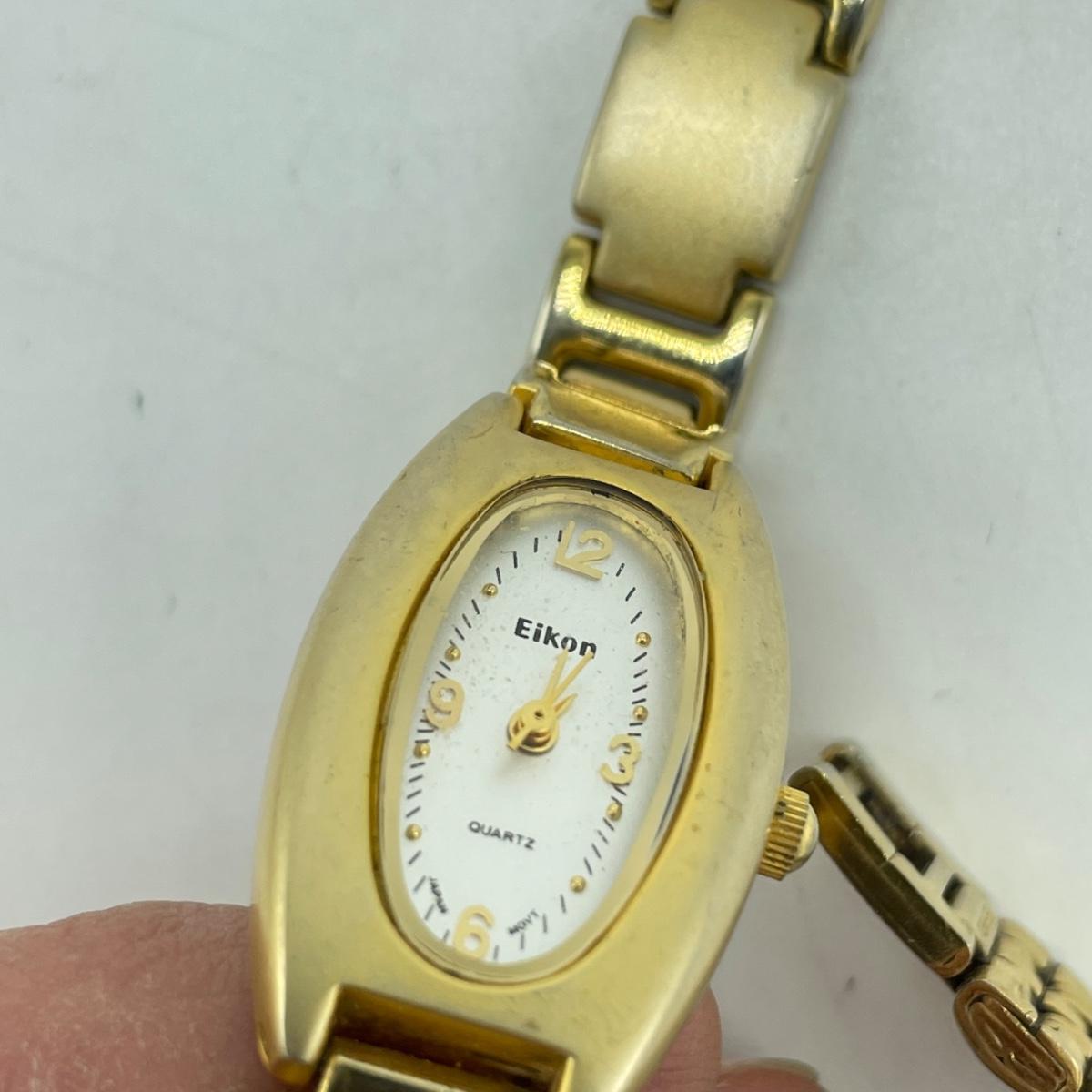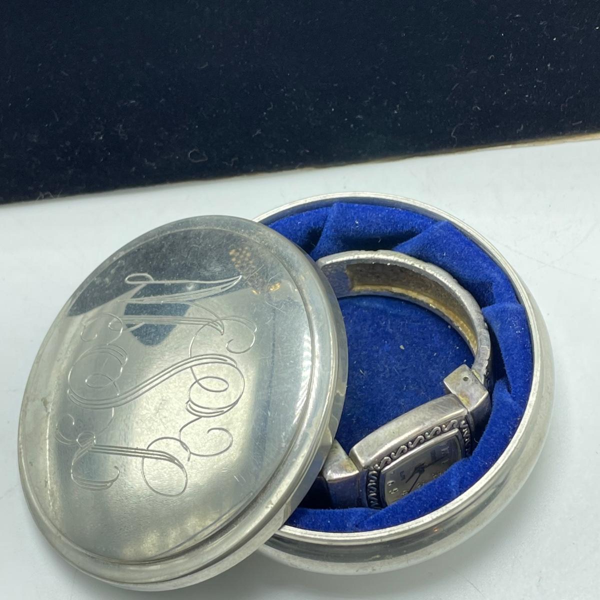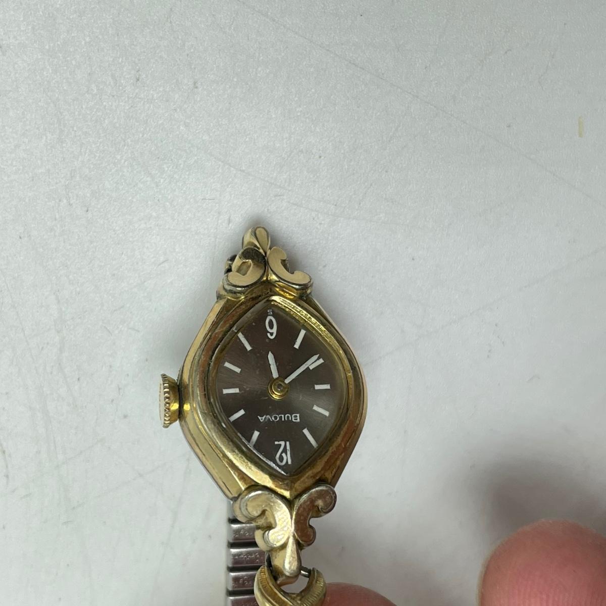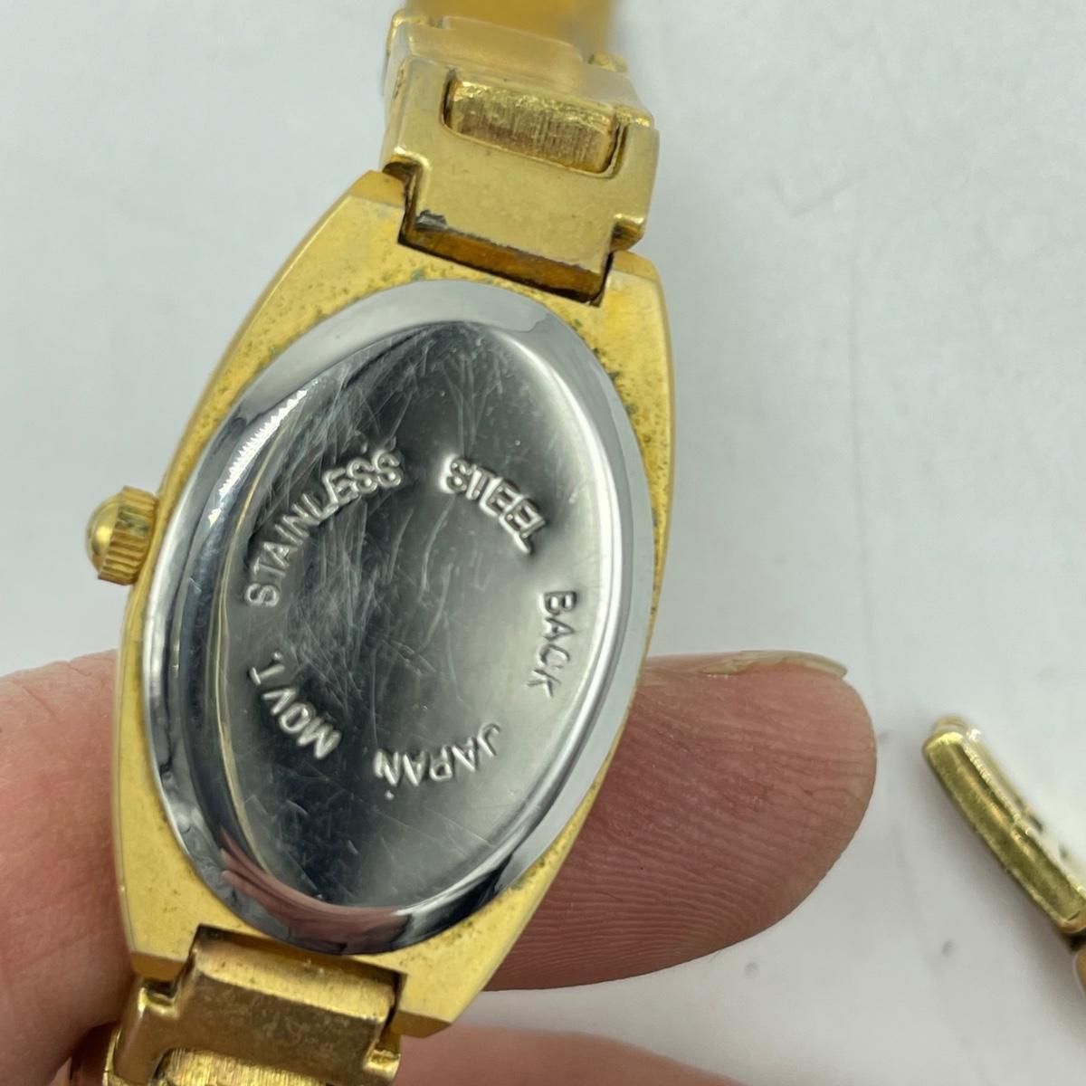 Vintage Bulova watch with Speidel elastic band along with Eikon, Seiko, Timex and Geneva watch with pewter case. Case has an etched monogram. The watches all appear in fine condition, but we were unable to test as likely batteries need replaced. See images. Shipping available.