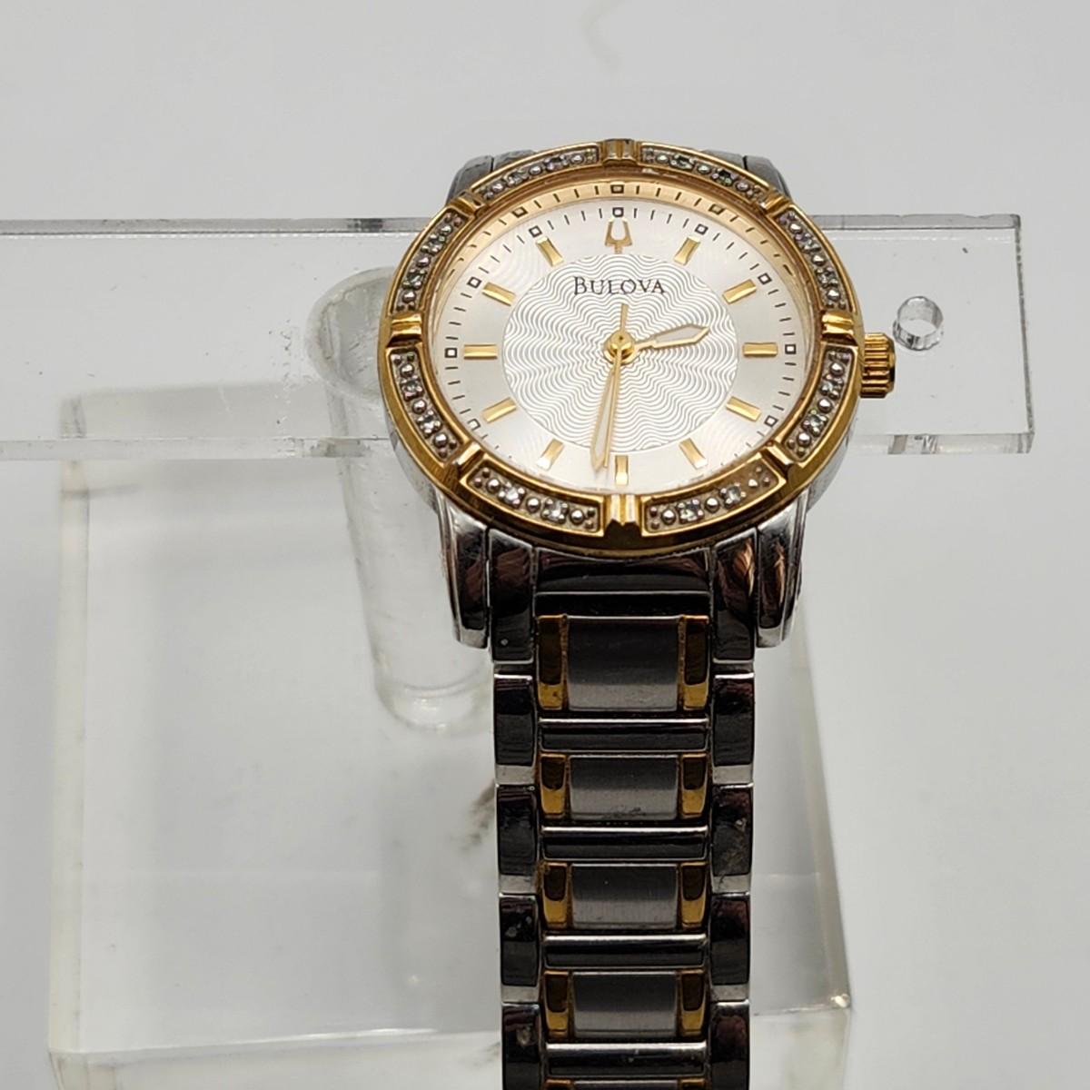 Gold tones diamond accented bezel and stainles steel bracelet.