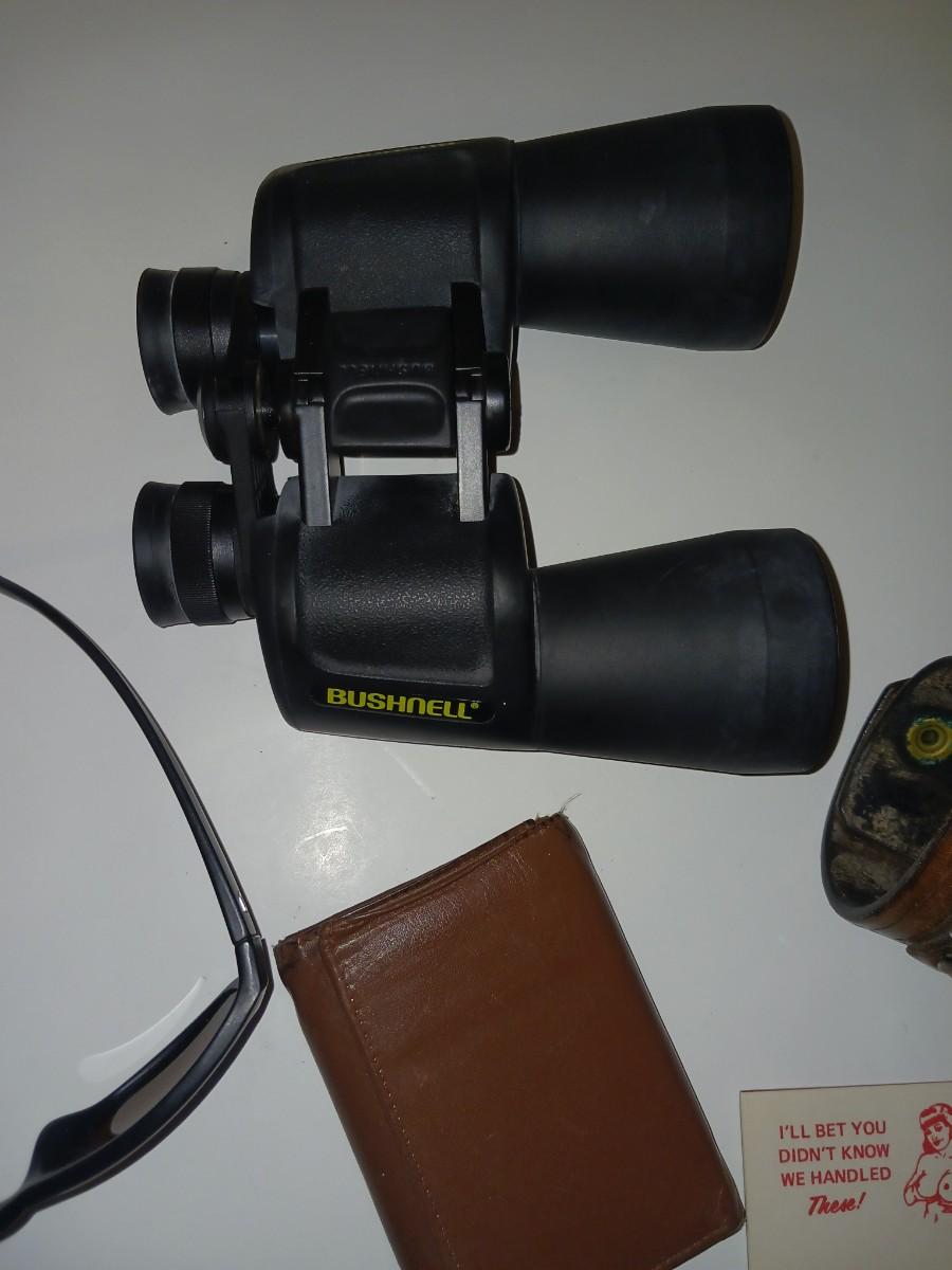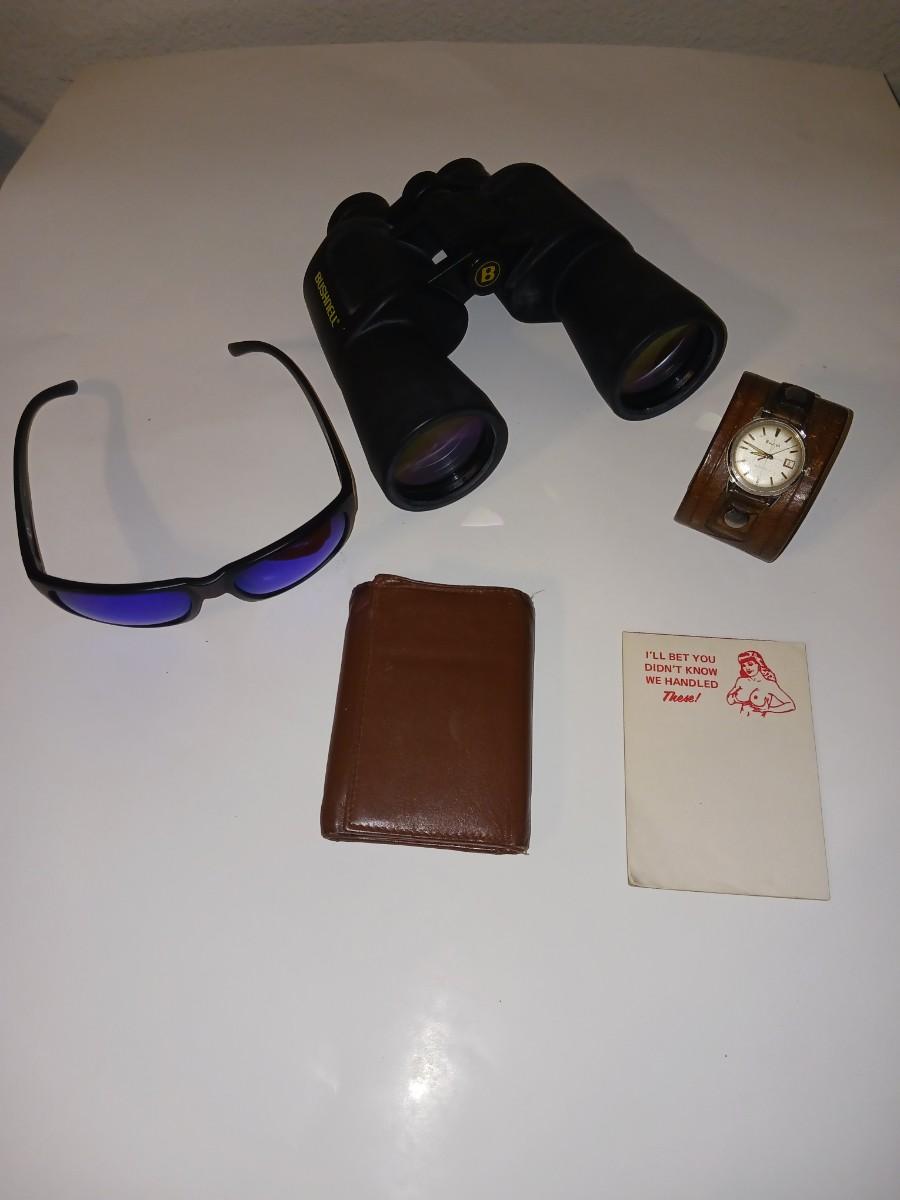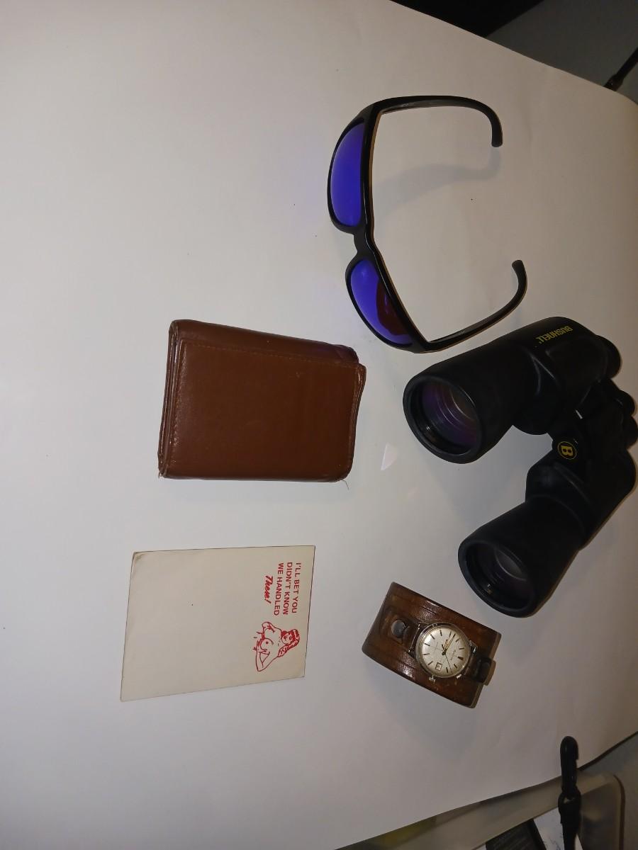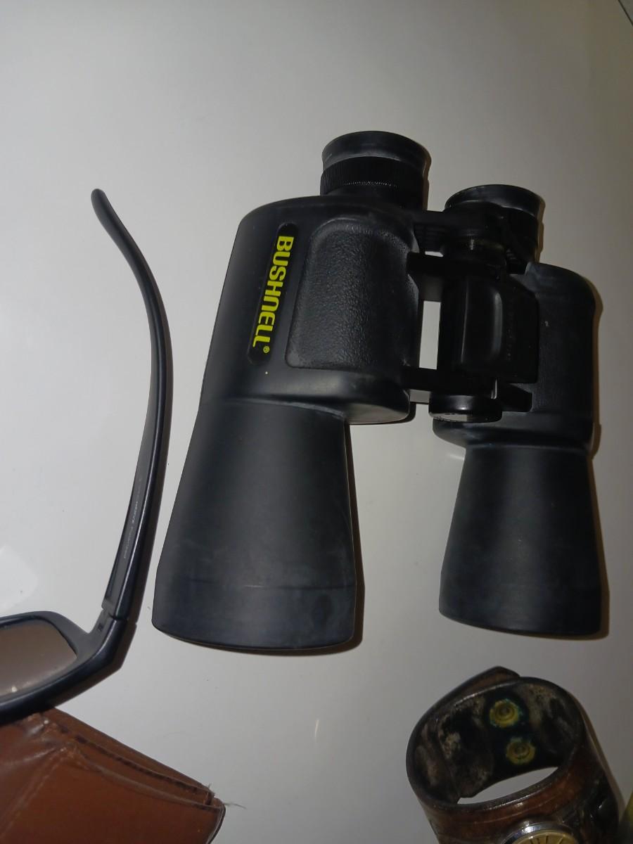 BULOVA MENS WATCH, BUSHNELL BINOCULARS, NEW OPTICS SUNGLASSES