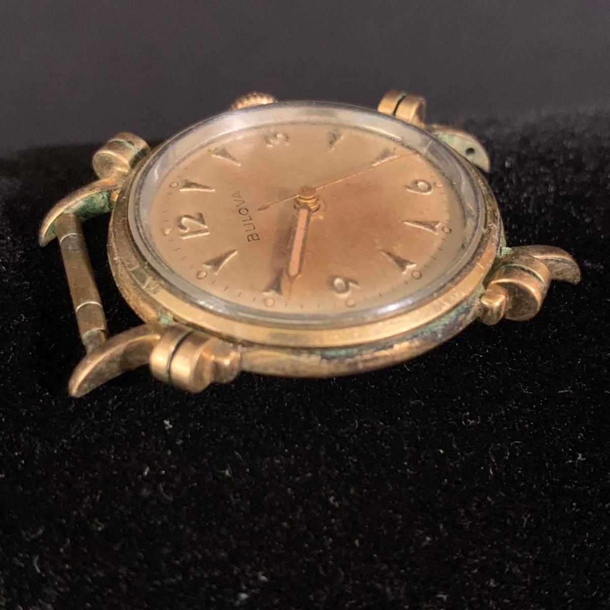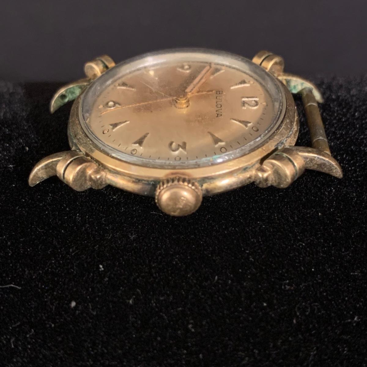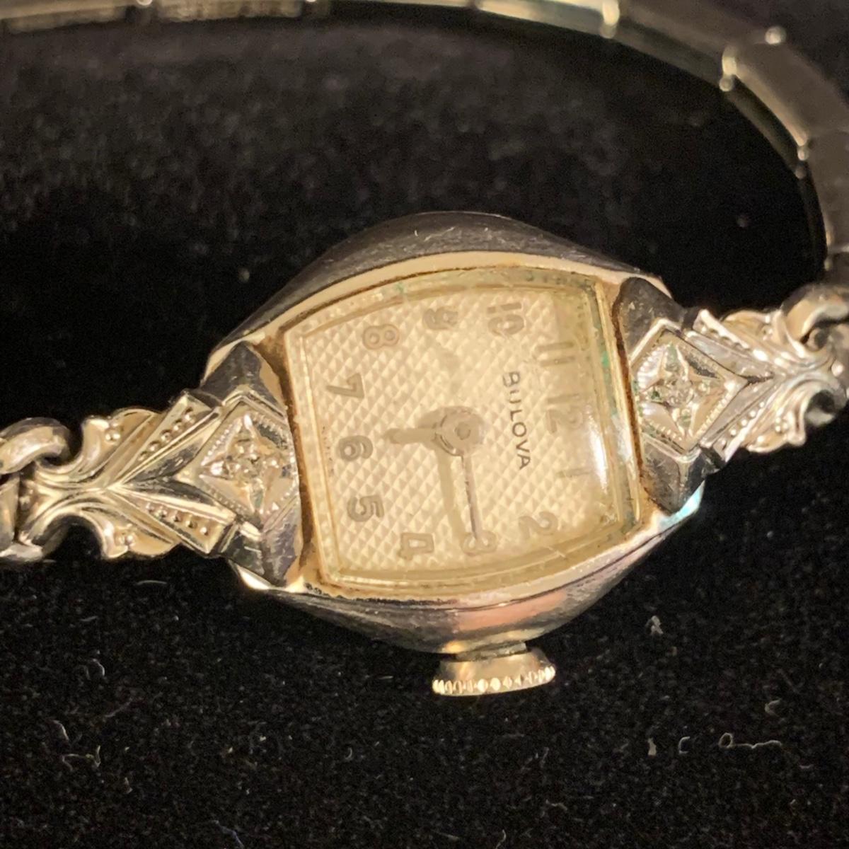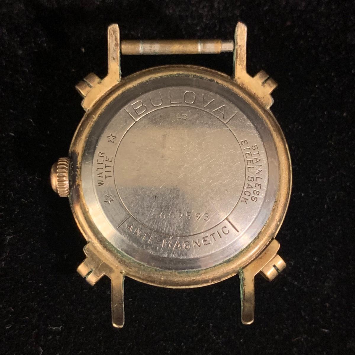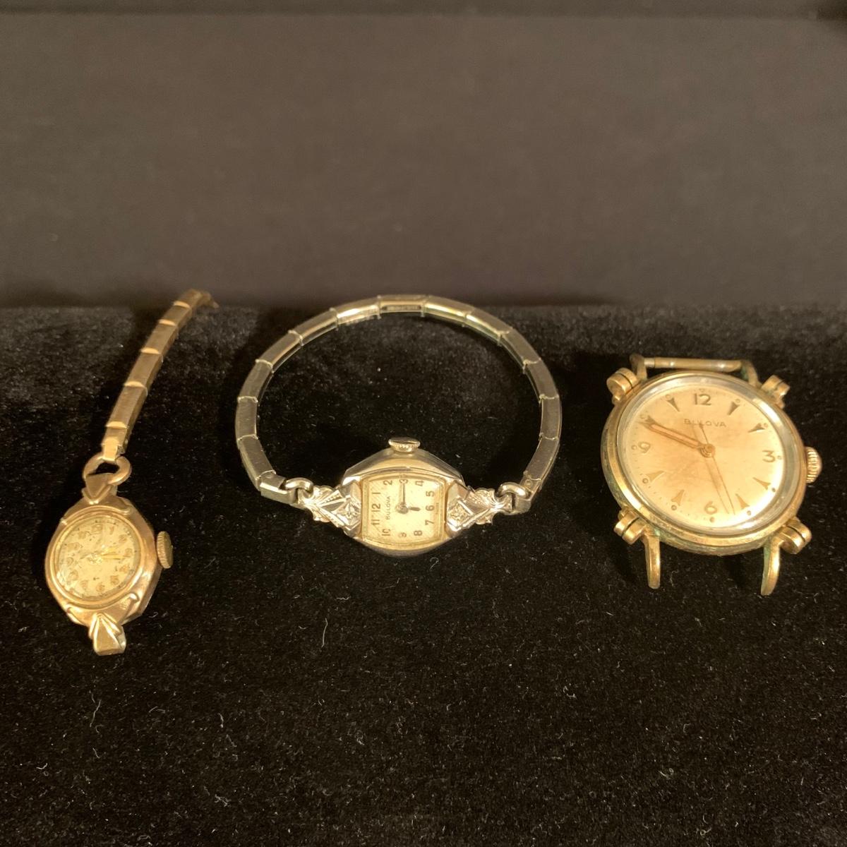 Three Bulova watches. Two are women’s metal wristwatches and one is a men’s watch face. None are currently ticking and likely need new batteries. The gold-colored women’s watch has a broken band and cracked glass. This one is marked “1-20 12K G.F. Top”. The silver colored women’s watch is marked “10K RGP Bezel” / “Stainless Steel Back” and “1/20 10K G.F. Top”. It has two small sparkly gemstones that tested as diamonds. The men’s watch face is marked “Stainless Steel Back” / “Anti-Magnetic” / “Water Tite”. Shipping available.