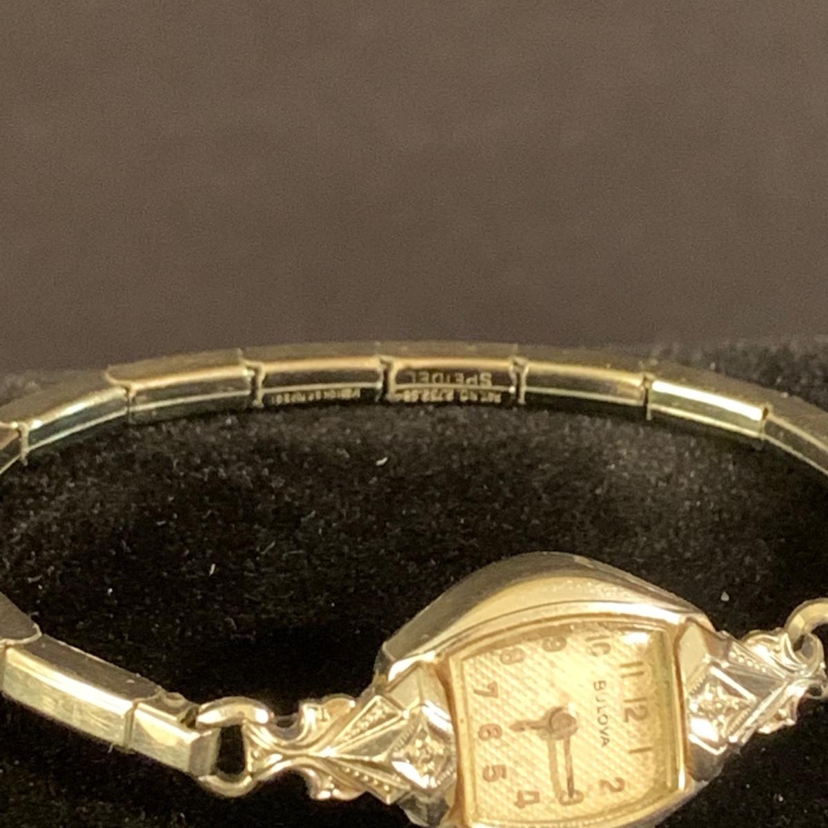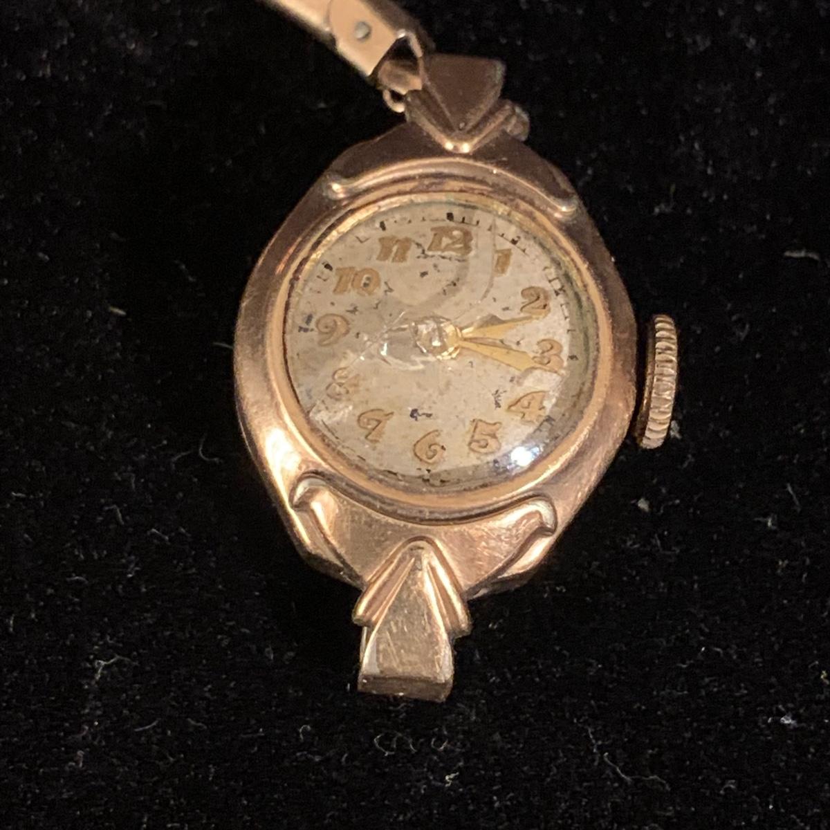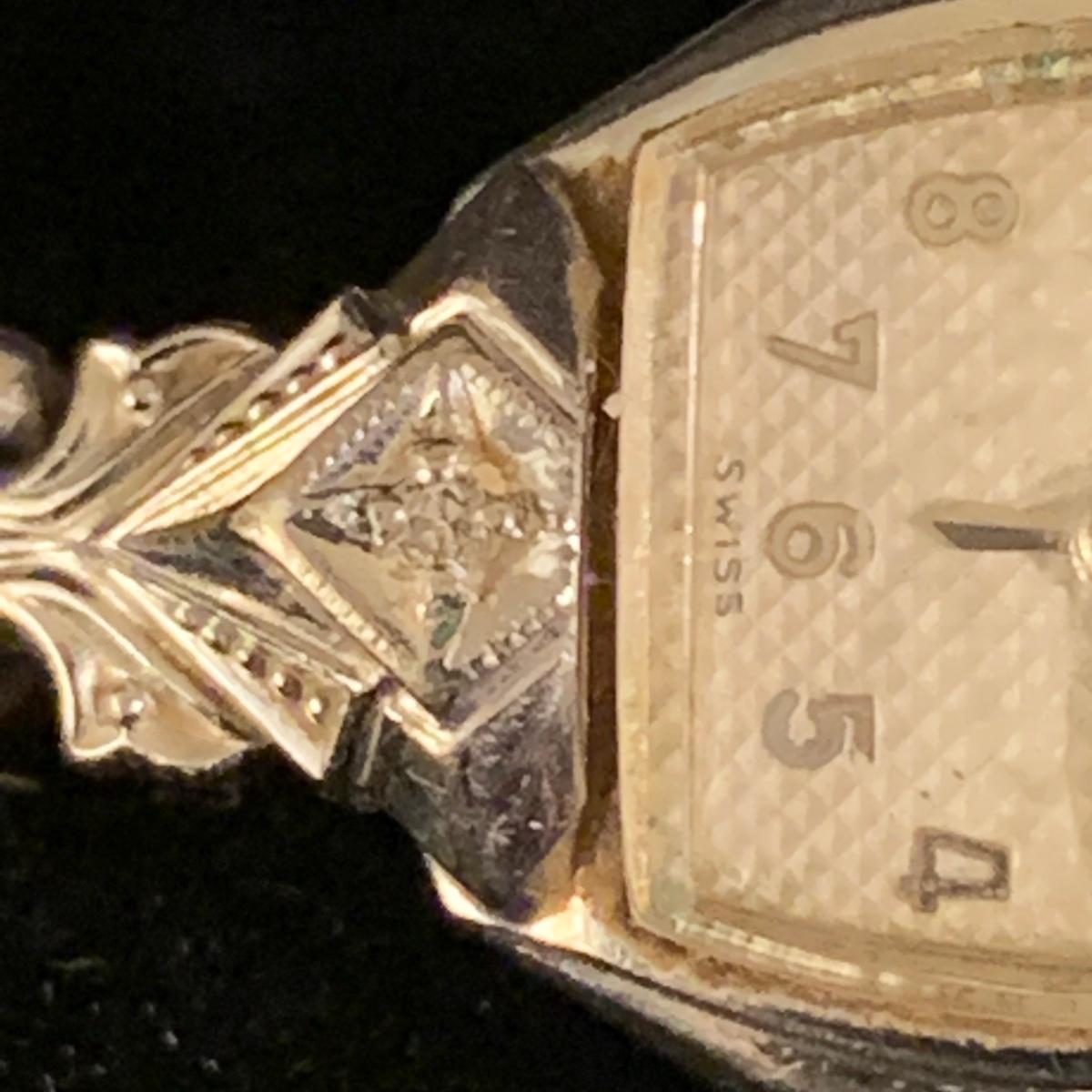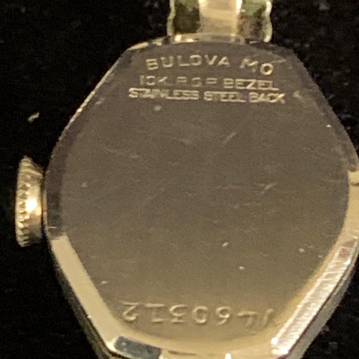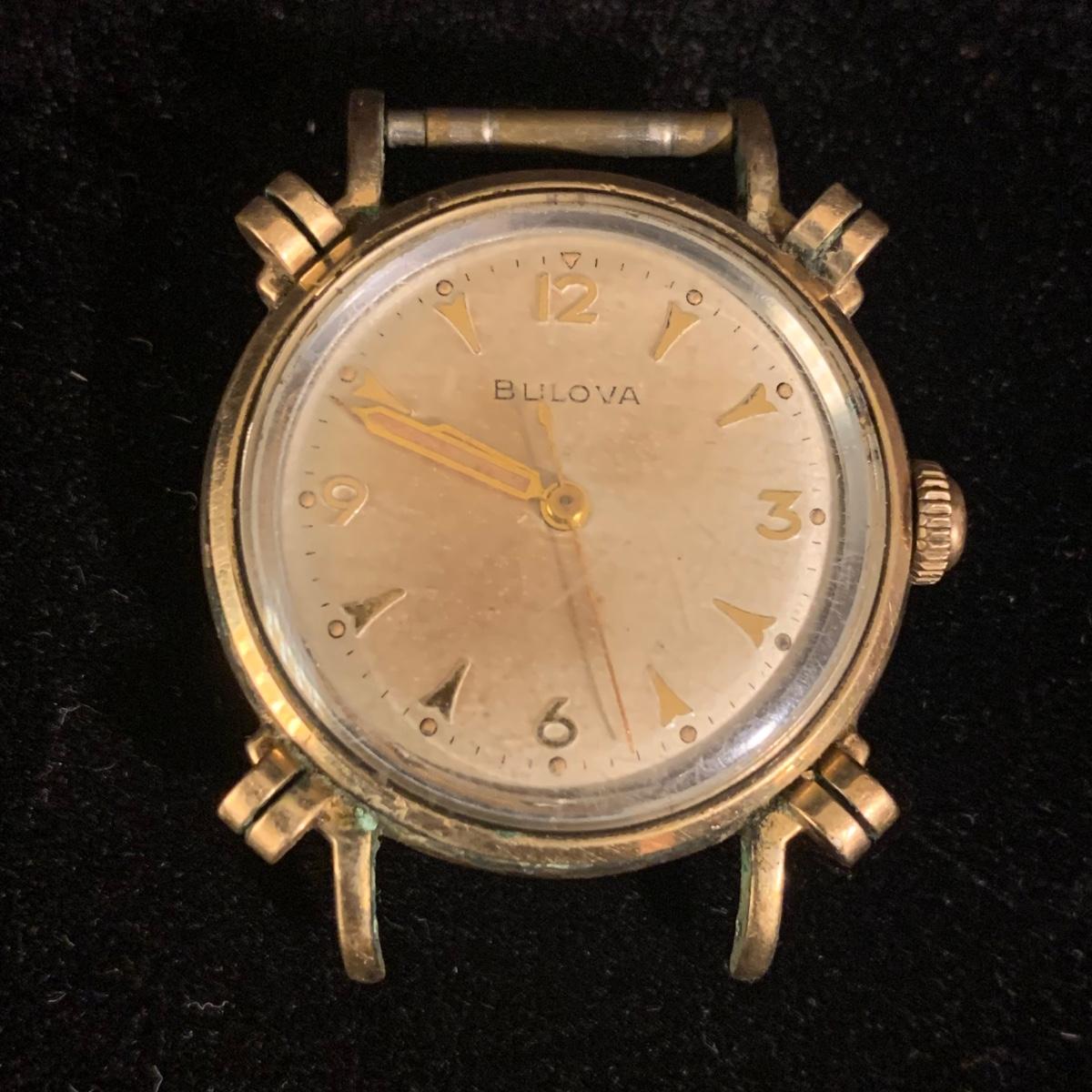 Three Bulova watches. Two are women’s metal wristwatches and one is a men’s watch face. None are currently ticking and likely need new batteries. The gold-colored women’s watch has a broken band and cracked glass. This one is marked “1-20 12K G.F. Top”. The silver colored women’s watch is marked “10K RGP Bezel” / “Stainless Steel Back” and “1/20 10K G.F. Top”. It has two small sparkly gemstones that tested as diamonds. The men’s watch face is marked “Stainless Steel Back” / “Anti-Magnetic” / “Water Tite”. Shipping available.