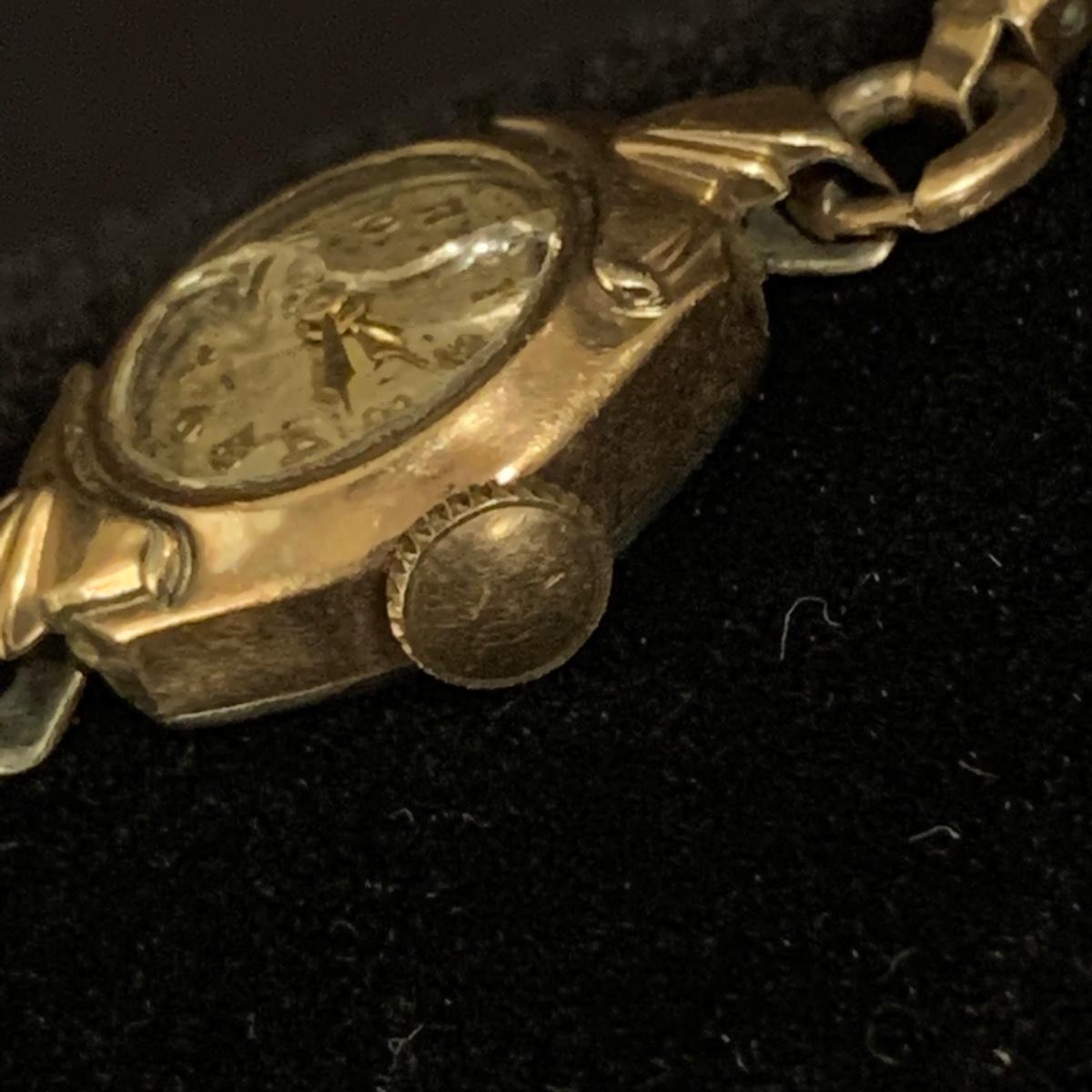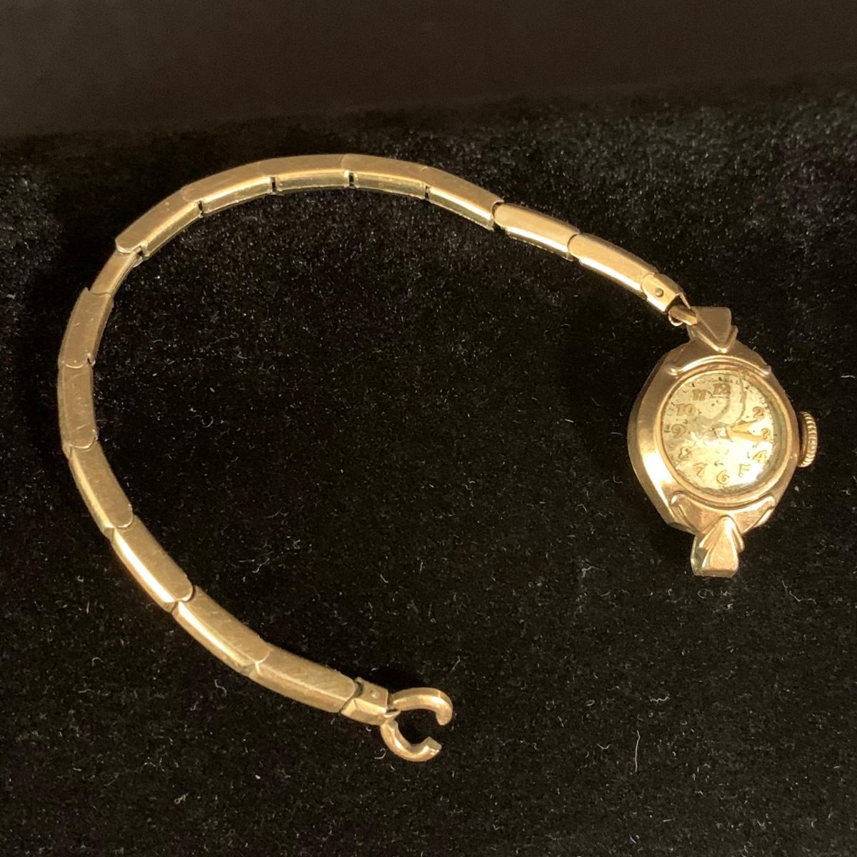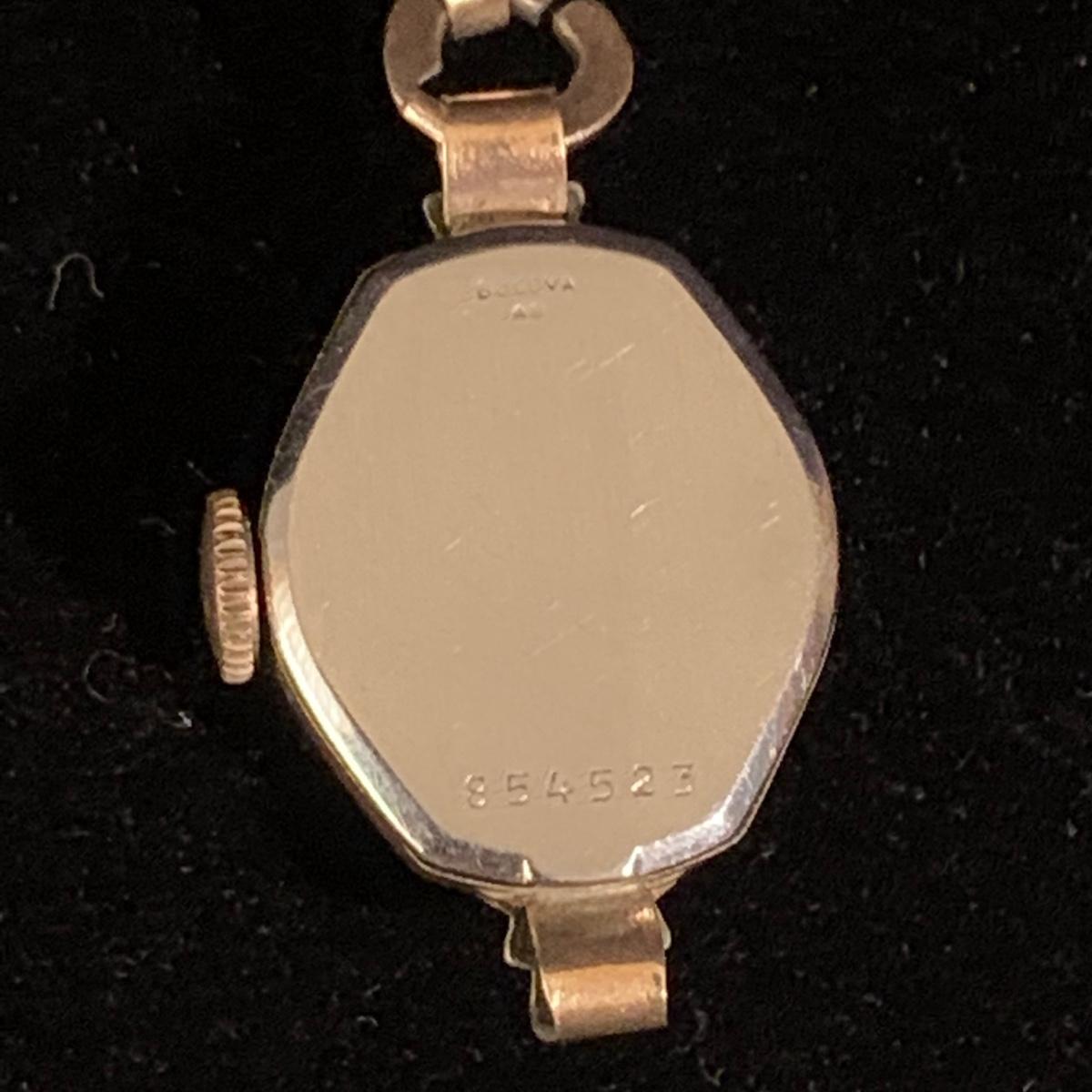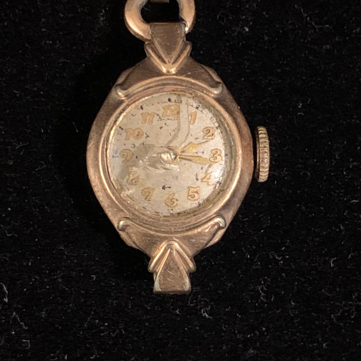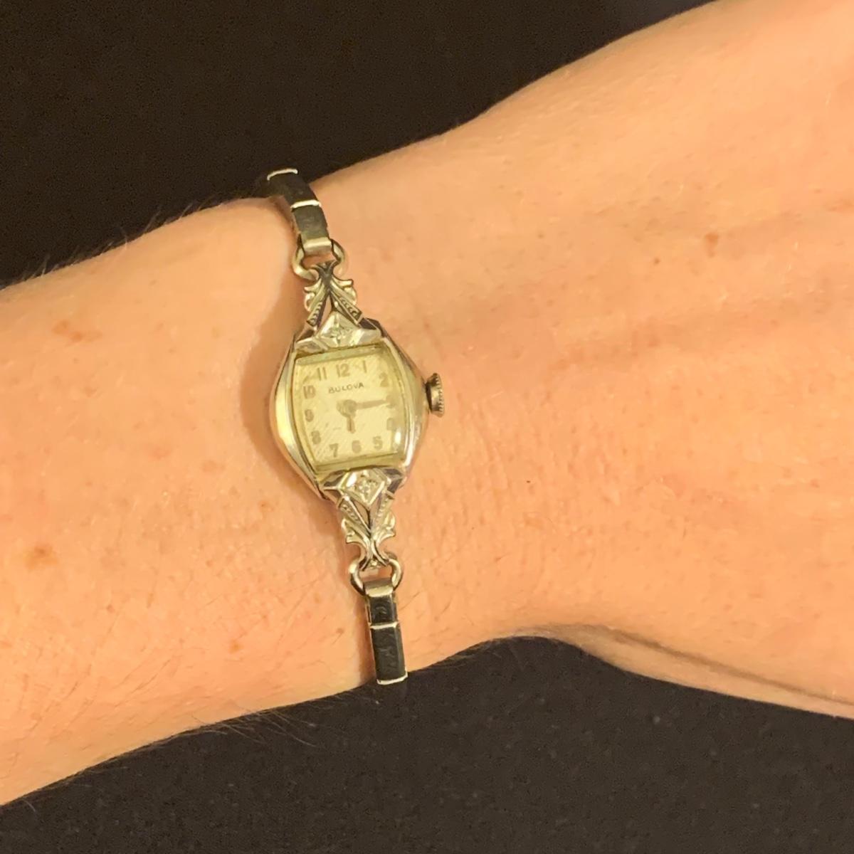 Three Bulova watches. Two are women’s metal wristwatches and one is a men’s watch face. None are currently ticking and likely need new batteries. The gold-colored women’s watch has a broken band and cracked glass. This one is marked “1-20 12K G.F. Top”. The silver colored women’s watch is marked “10K RGP Bezel” / “Stainless Steel Back” and “1/20 10K G.F. Top”. It has two small sparkly gemstones that tested as diamonds. The men’s watch face is marked “Stainless Steel Back” / “Anti-Magnetic” / “Water Tite”. Shipping available.