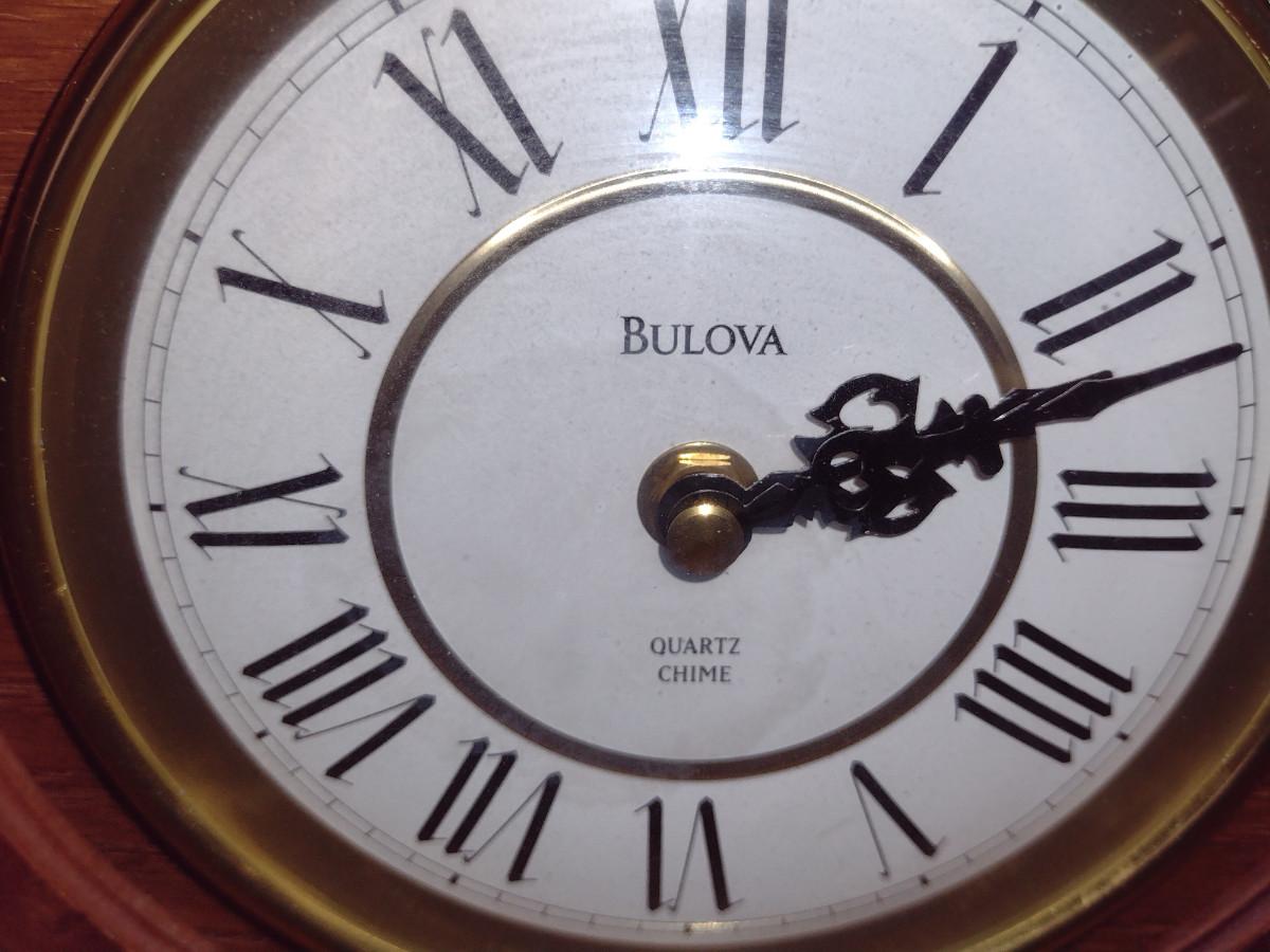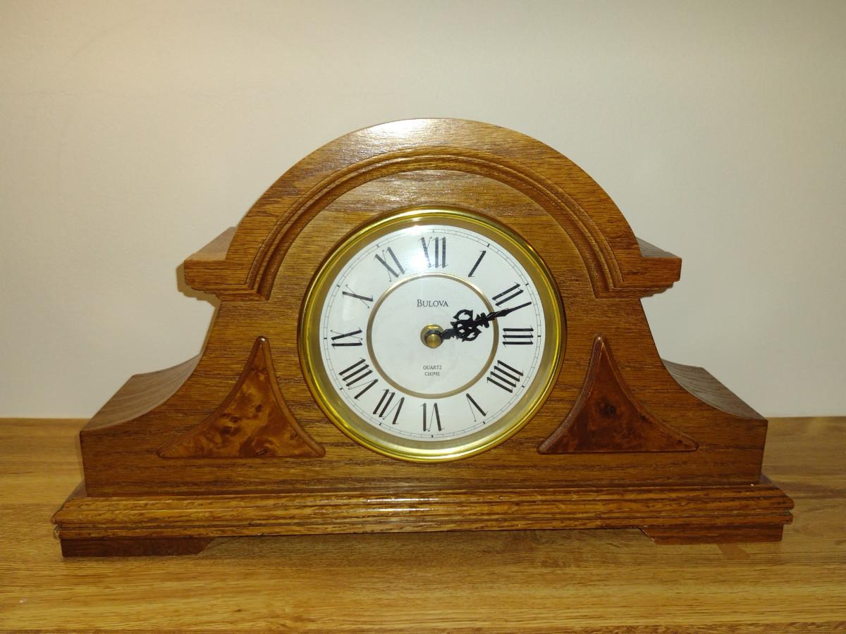 Bulova Wood Case Mantle Clock. In working condition. Battery operated. Chime is working.