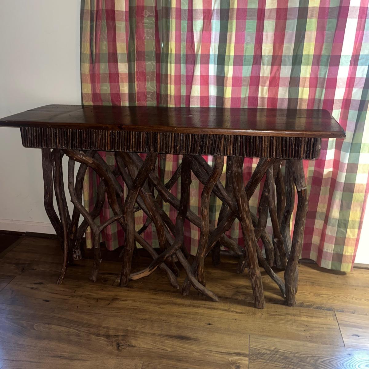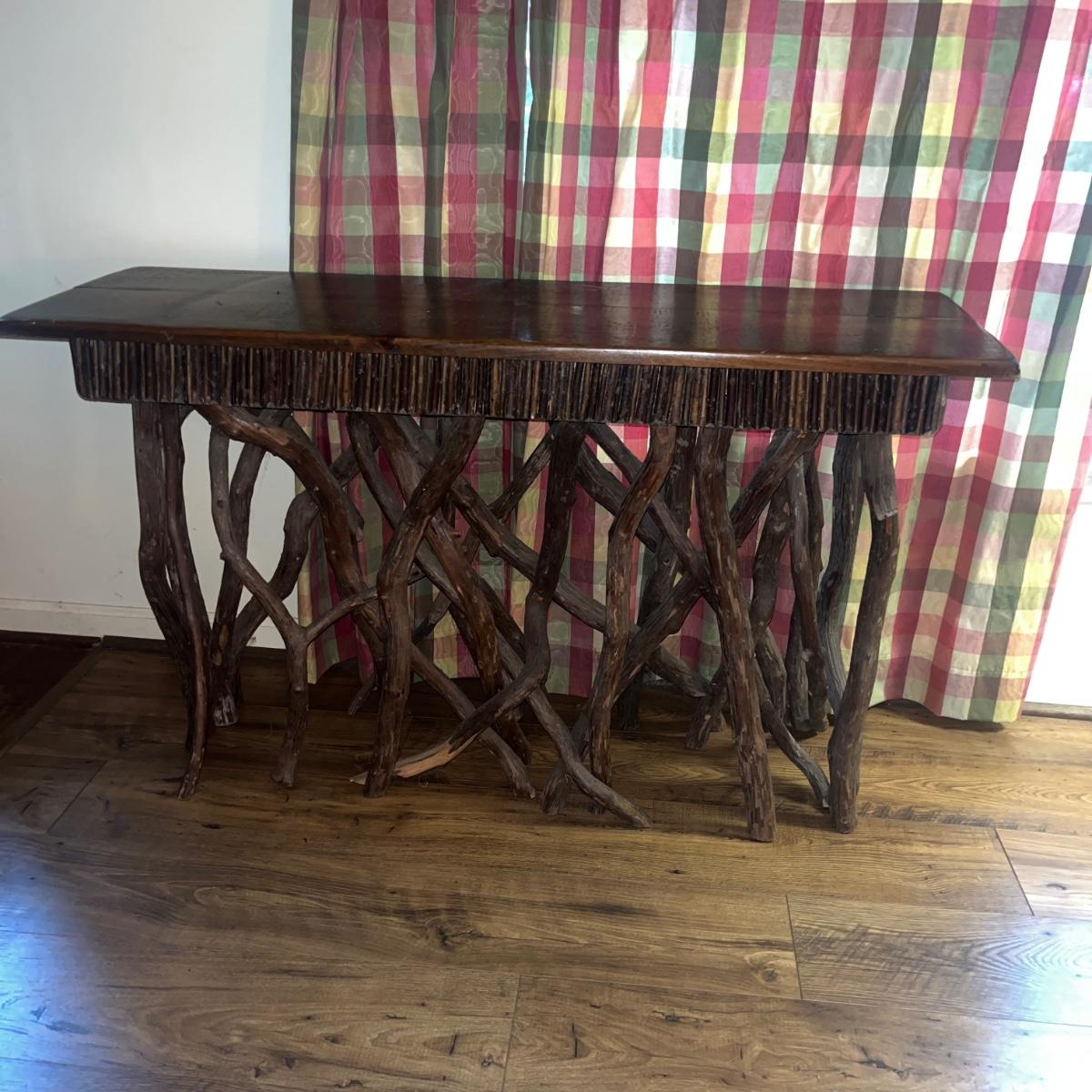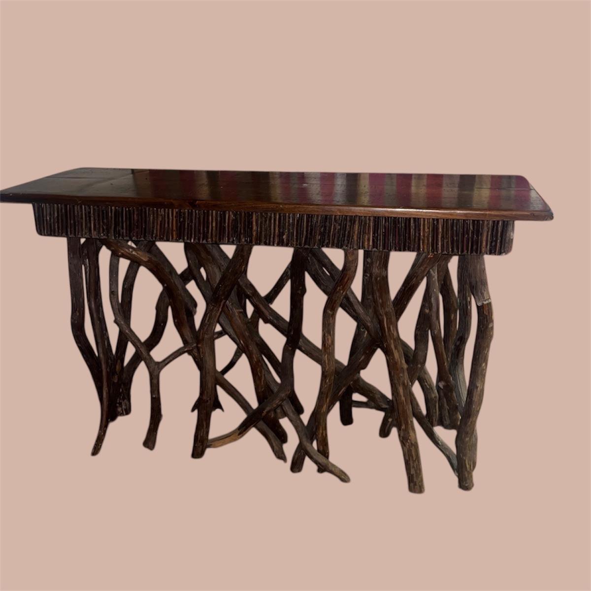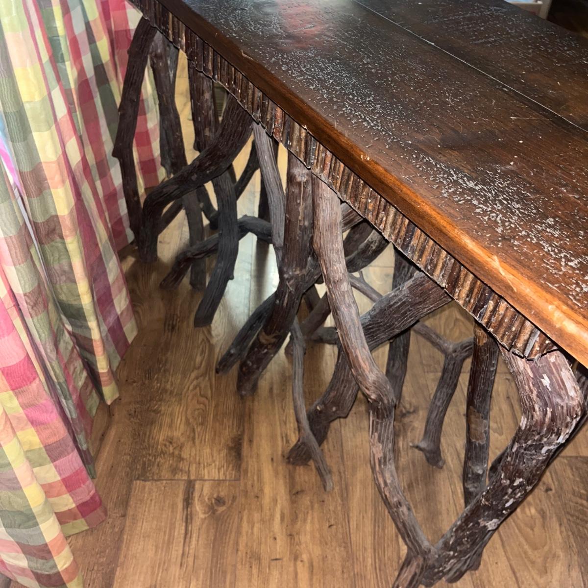 This sofa table has a bunch of branches that are the legs with a wooden top that has a large indent on one side, see pictures. Table measures 48” x 16” x 29”H.