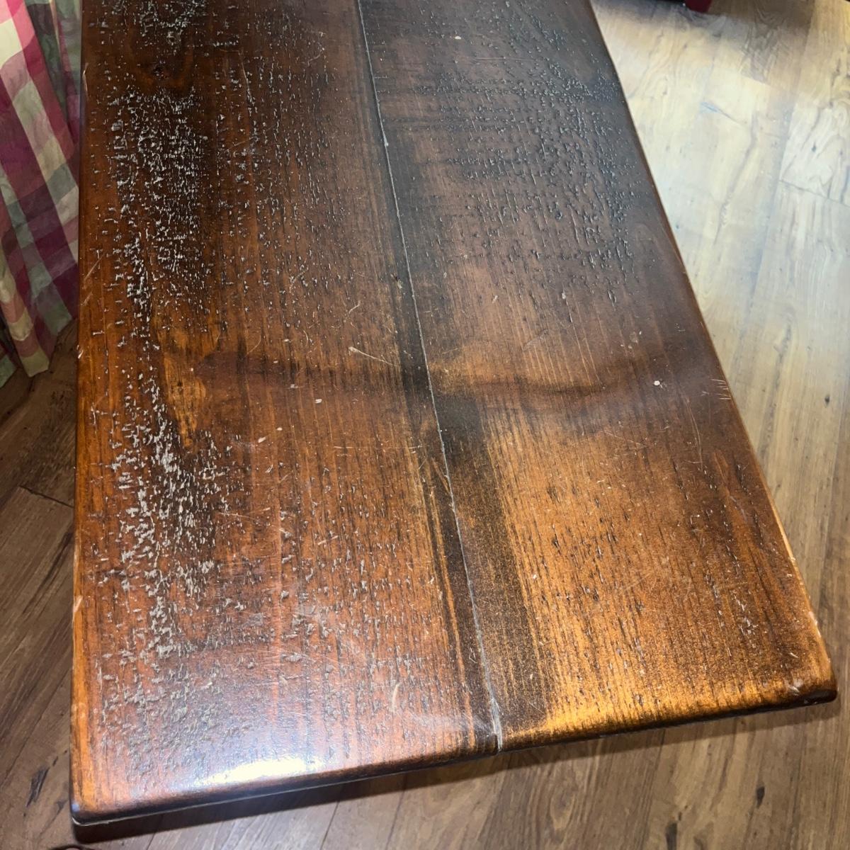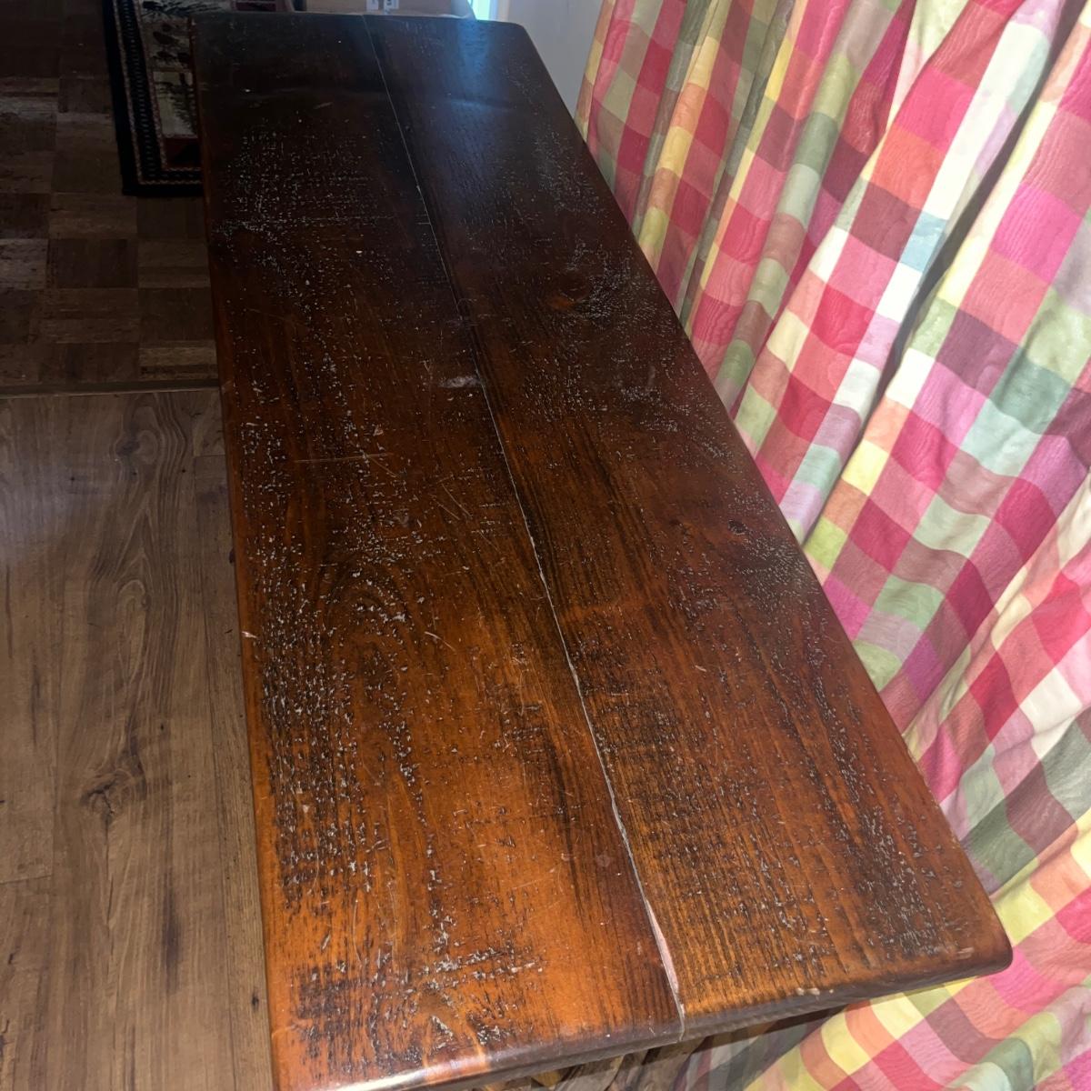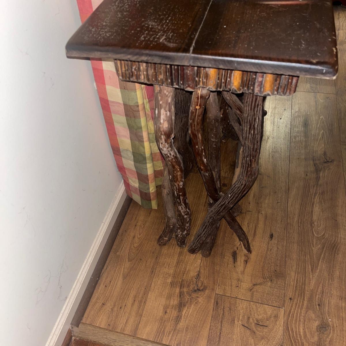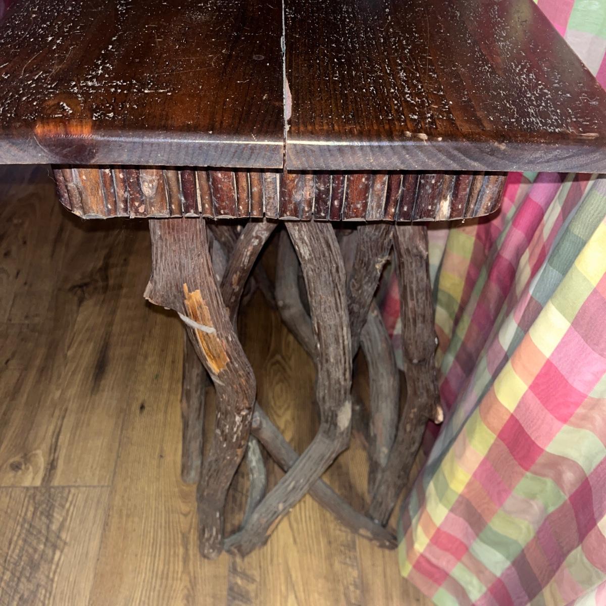 This sofa table has a bunch of branches that are the legs with a wooden top that has a large indent on one side, see pictures. Table measures 48” x 16” x 29”H.