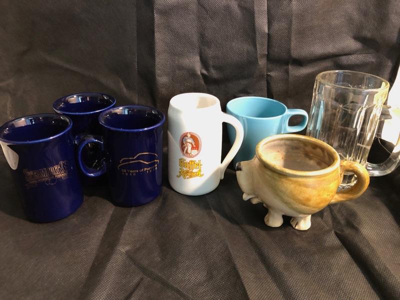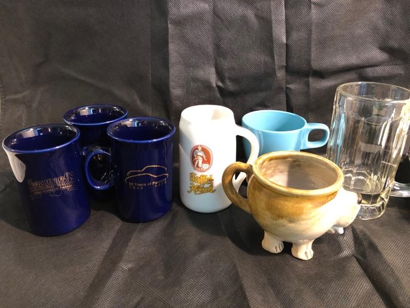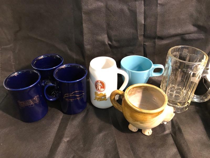 3 Blue Steamboat coffee mugs, 1 dog mug, 1 German stein, 1 glass mug and a blue diner mug