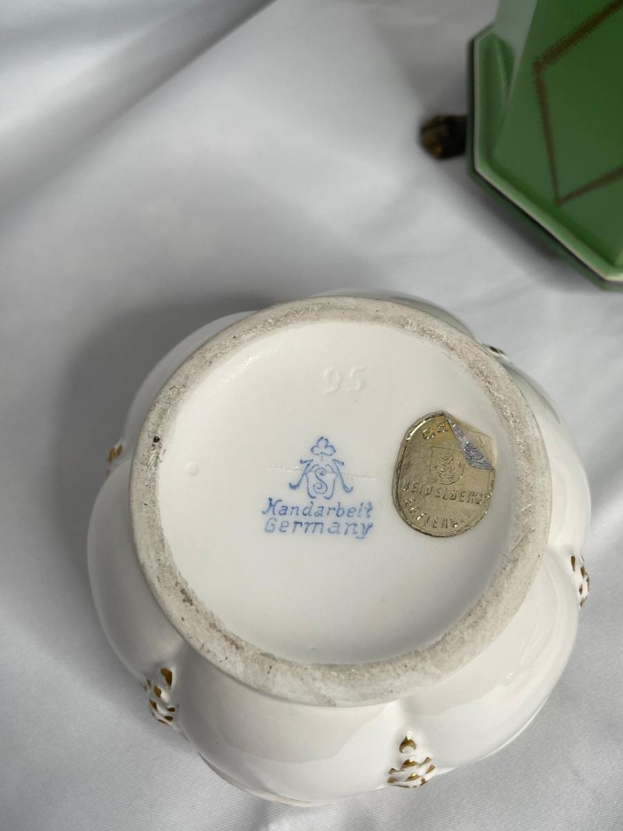 Ivory Victorian jar trimmed in gold with top covered with rose