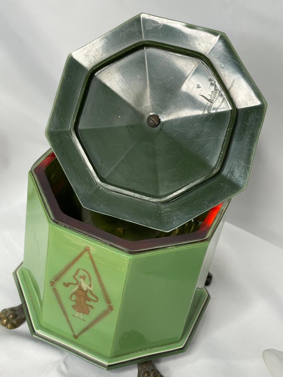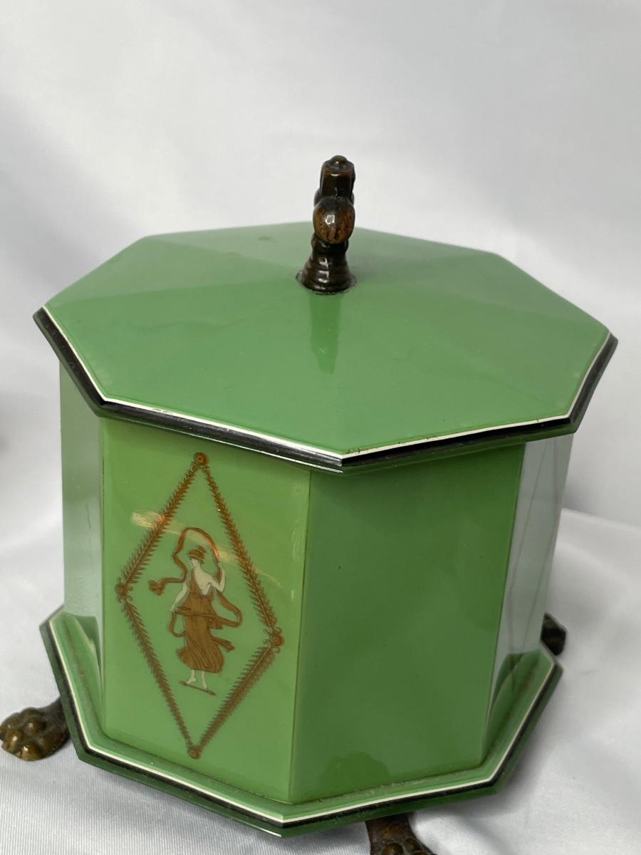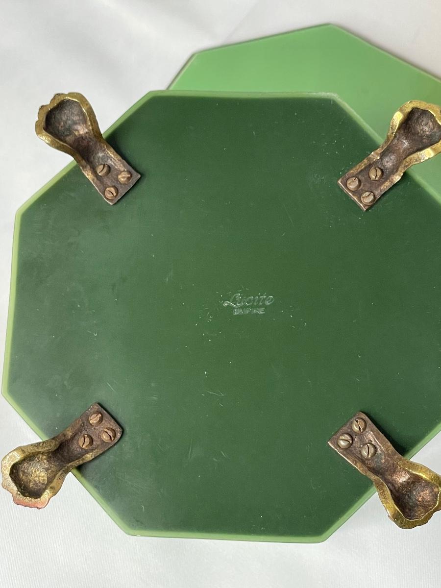 Green lucite by Empire jar with brass feet and inside liner with lid and brass handle - so cute
