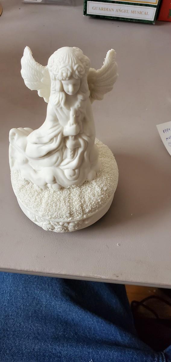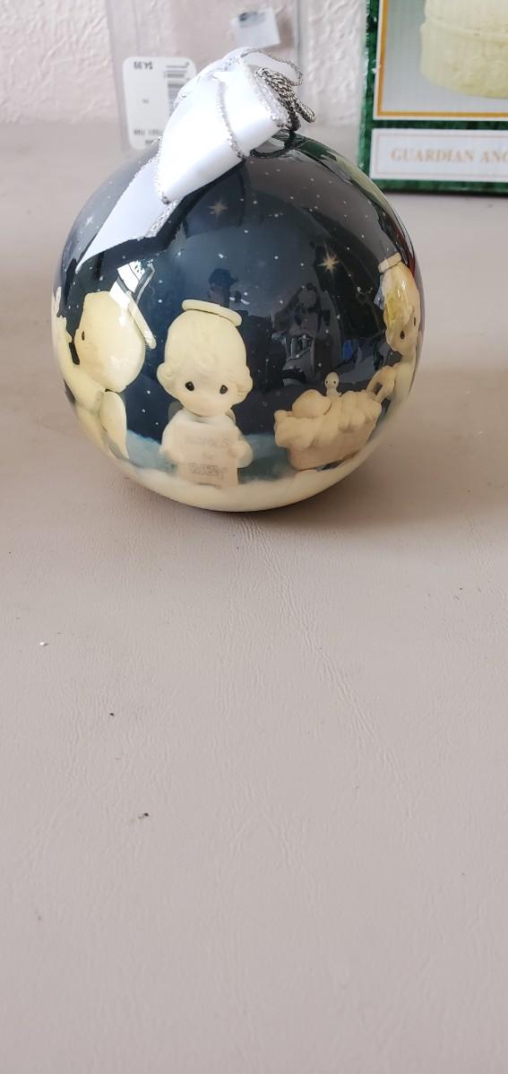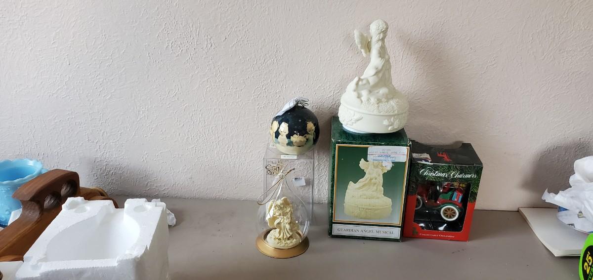 This lot features a precious moments ornament,musical guardian angel that works great,Christmas charmers collectable ornament, a beautiful angel ornament all have a original packaging except for the angel ornament which original Styrofoam