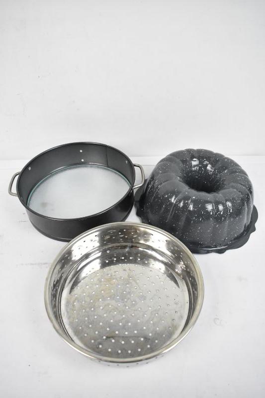 Bundt Cake Pan, Pampered Chef Springform Pan with Glass Bottom, and Strainer