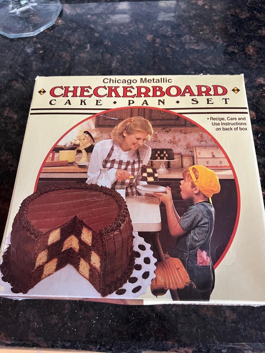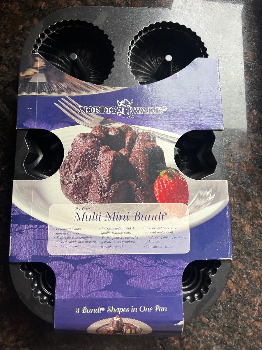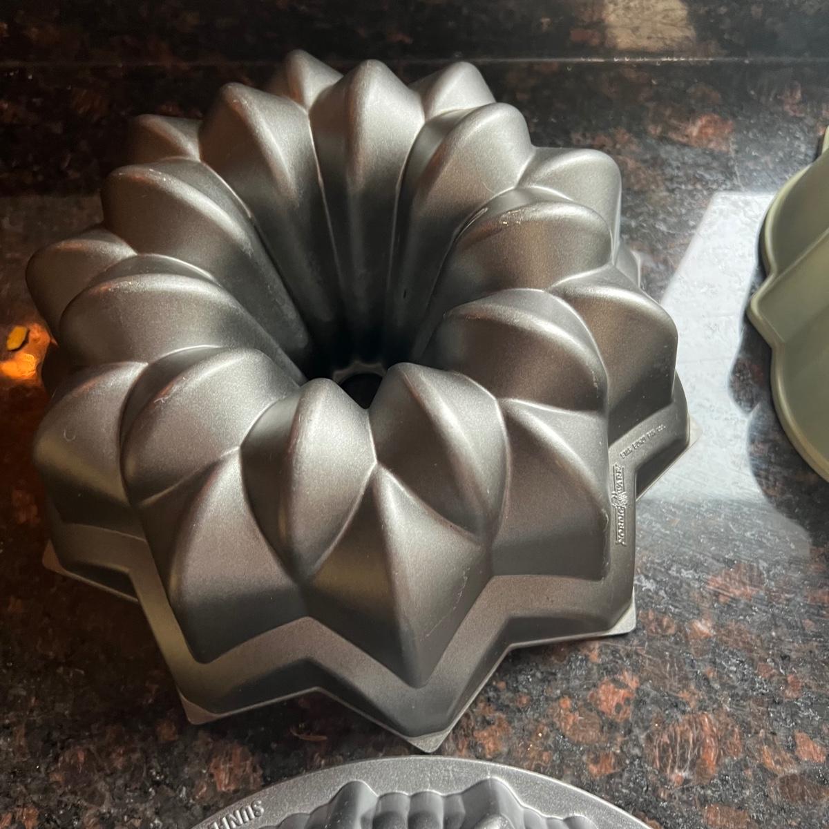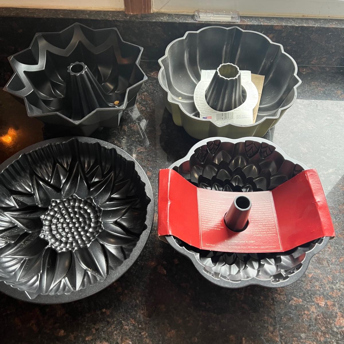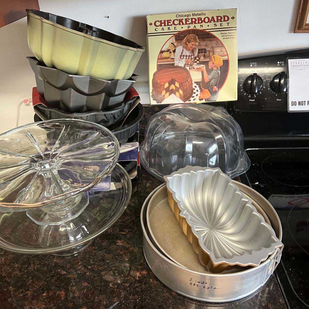 Four large non-stick Bundt pans with different styles, each approximately 10 cups. Two cake serving platters each approximately 10.5”D x 4”H. One large plastic covered cake carrying container that is approximately 11”D x 7”H. A new inbox, Chicago metallic checkerboard cake pan set, and two Nordic Ware mini bundt pan forms, also never been used. A stylish metal loaf pan that's 10” x 5” x 3”H, two metal 9”D cake pans and one 10”D x 3”H spring form pan. Some items appear to be unused and or in original packaging. Please see items for details.