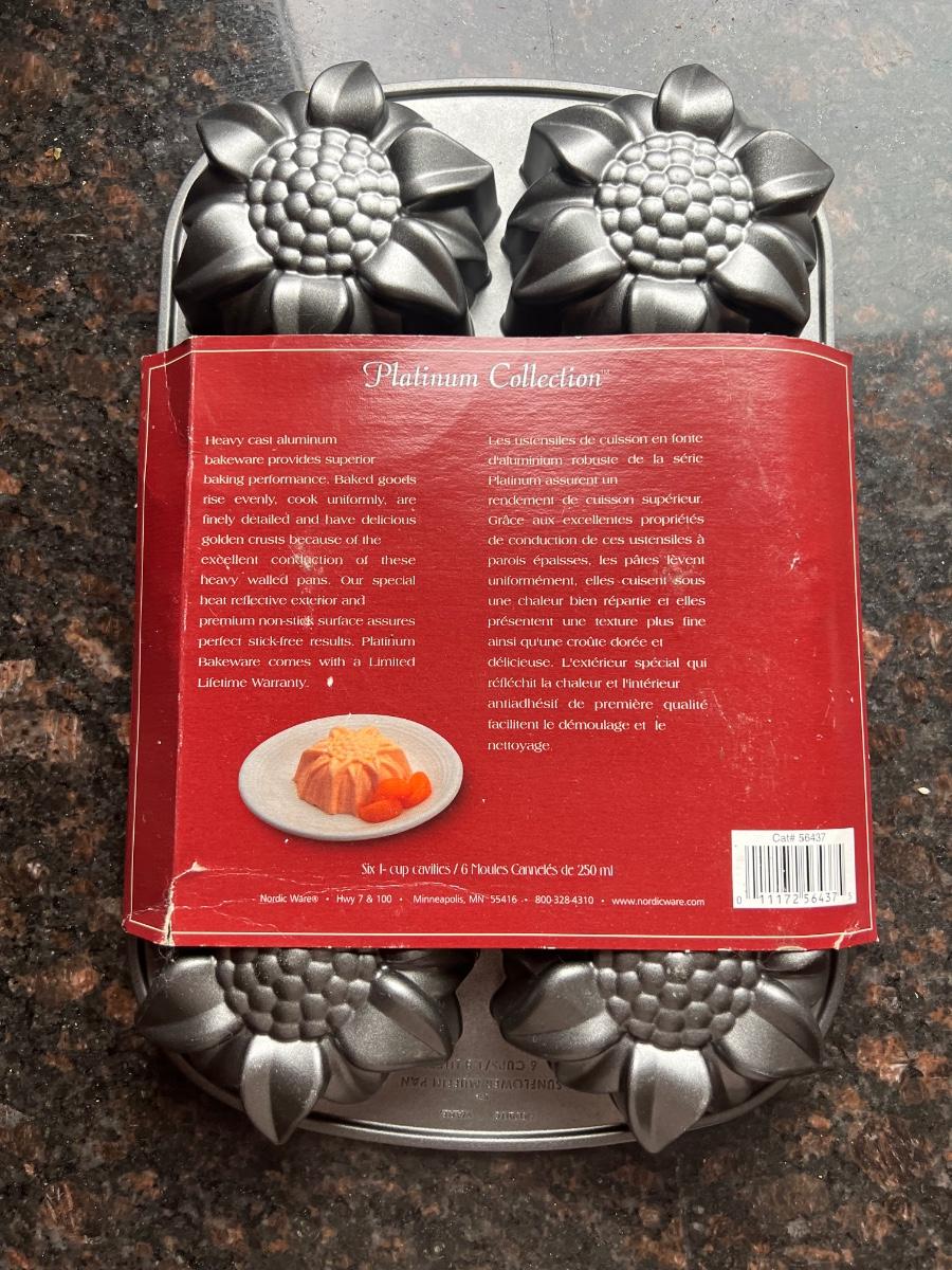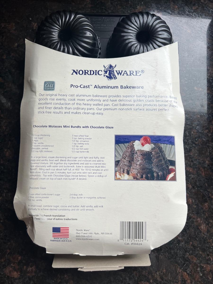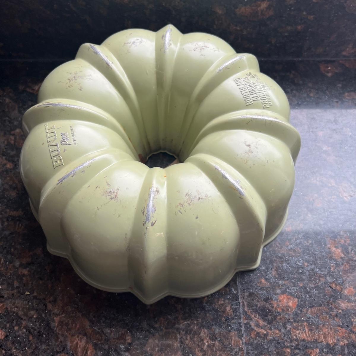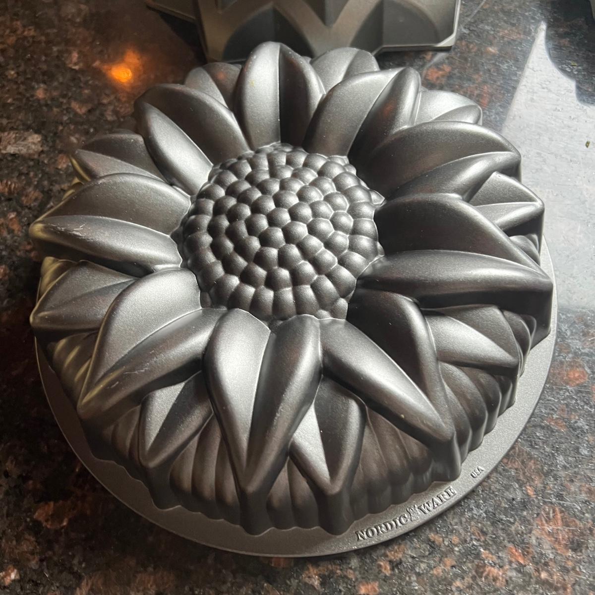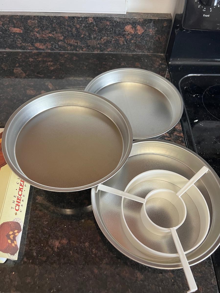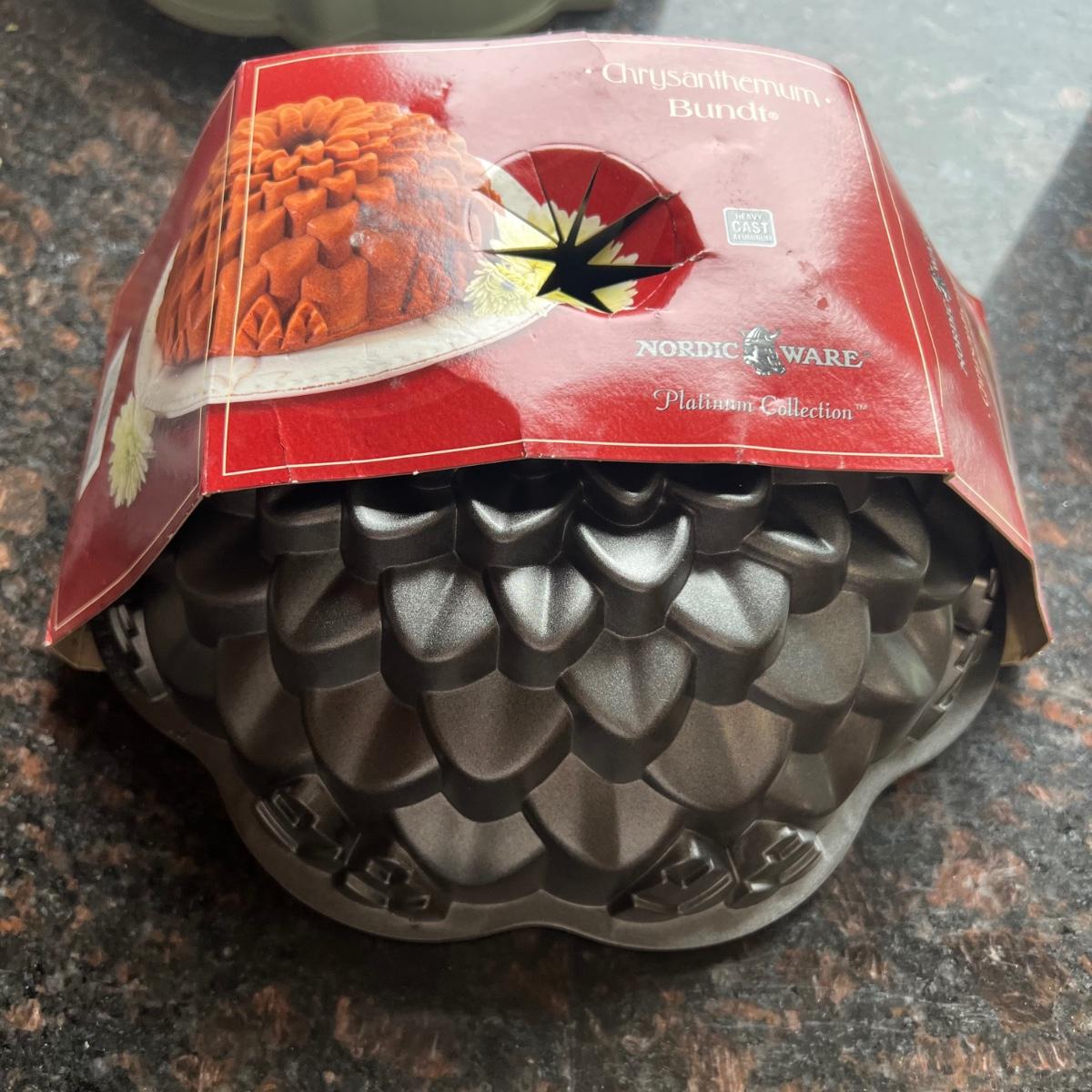 Four large non-stick Bundt pans with different styles, each approximately 10 cups. Two cake serving platters each approximately 10.5”D x 4”H. One large plastic covered cake carrying container that is approximately 11”D x 7”H. A new inbox, Chicago metallic checkerboard cake pan set, and two Nordic Ware mini bundt pan forms, also never been used. A stylish metal loaf pan that's 10” x 5” x 3”H, two metal 9”D cake pans and one 10”D x 3”H spring form pan. Some items appear to be unused and or in original packaging. Please see items for details.