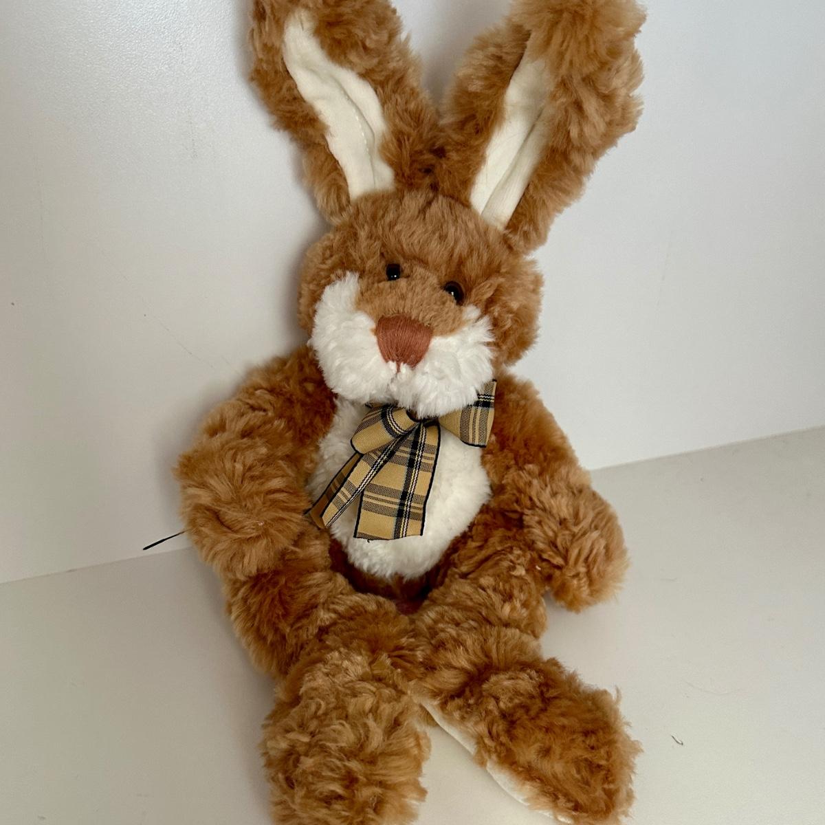 - Percy by Russ Berrie Co, Brown fur with white tummy, face, and ears. Wearing a plaid bow. 17 inches