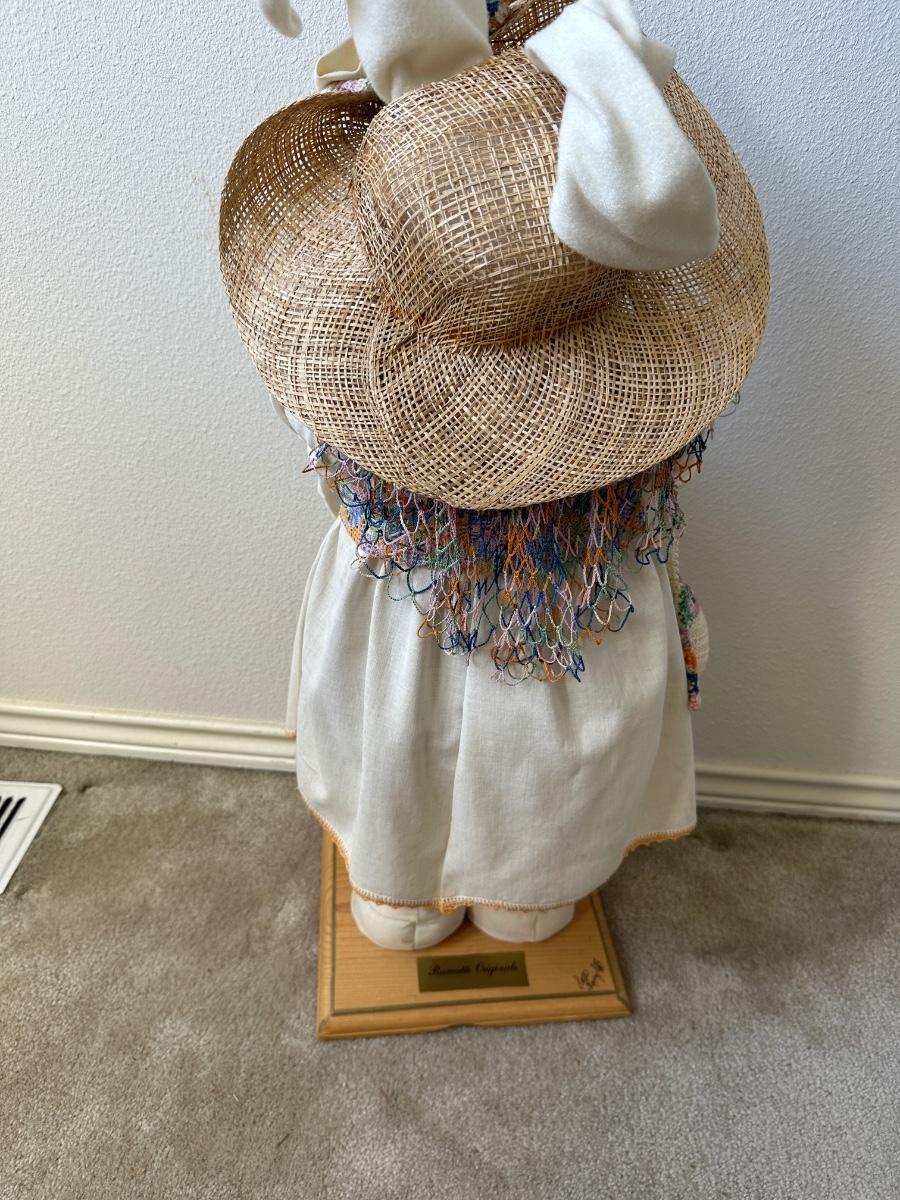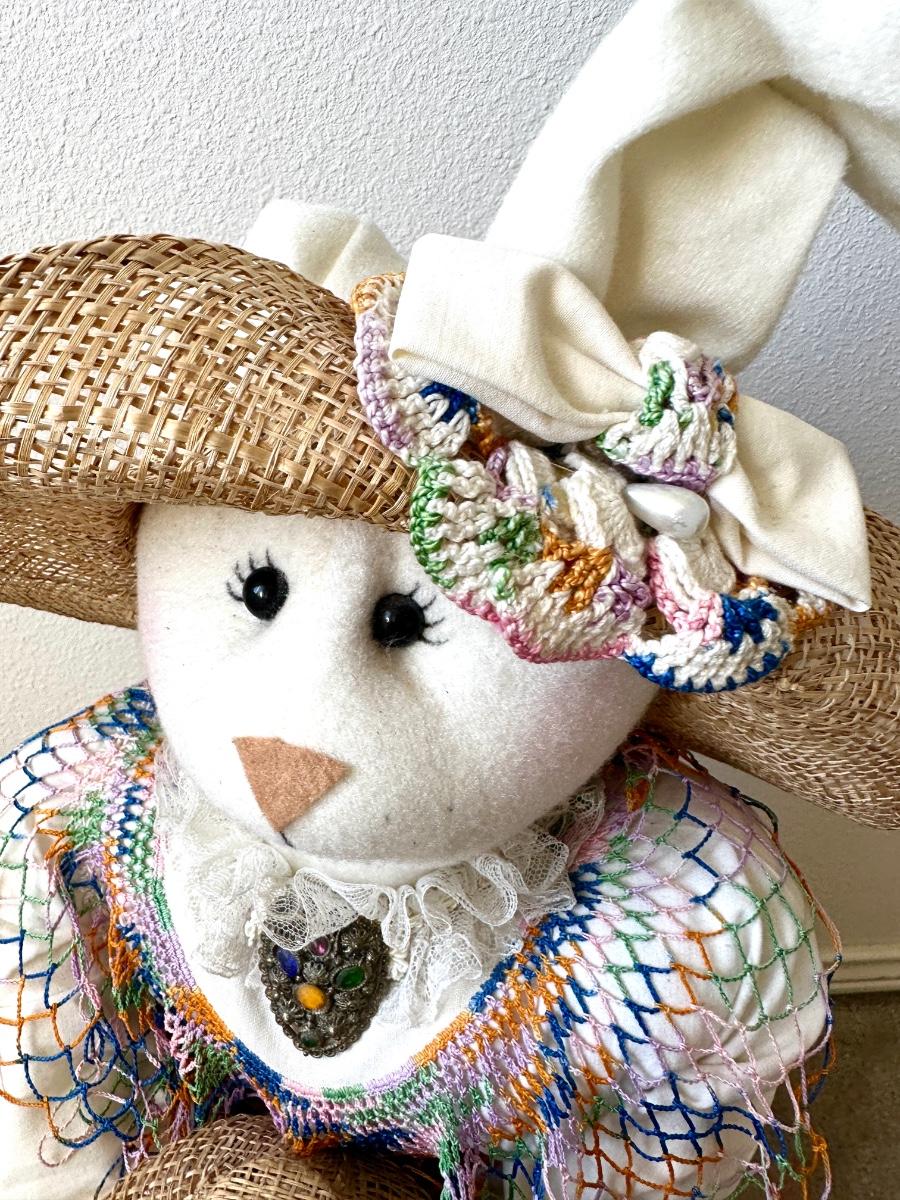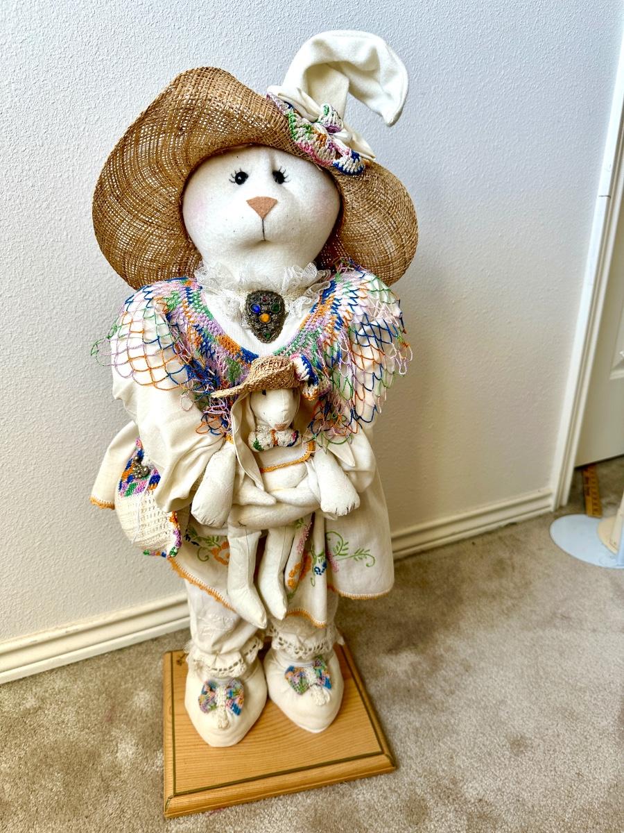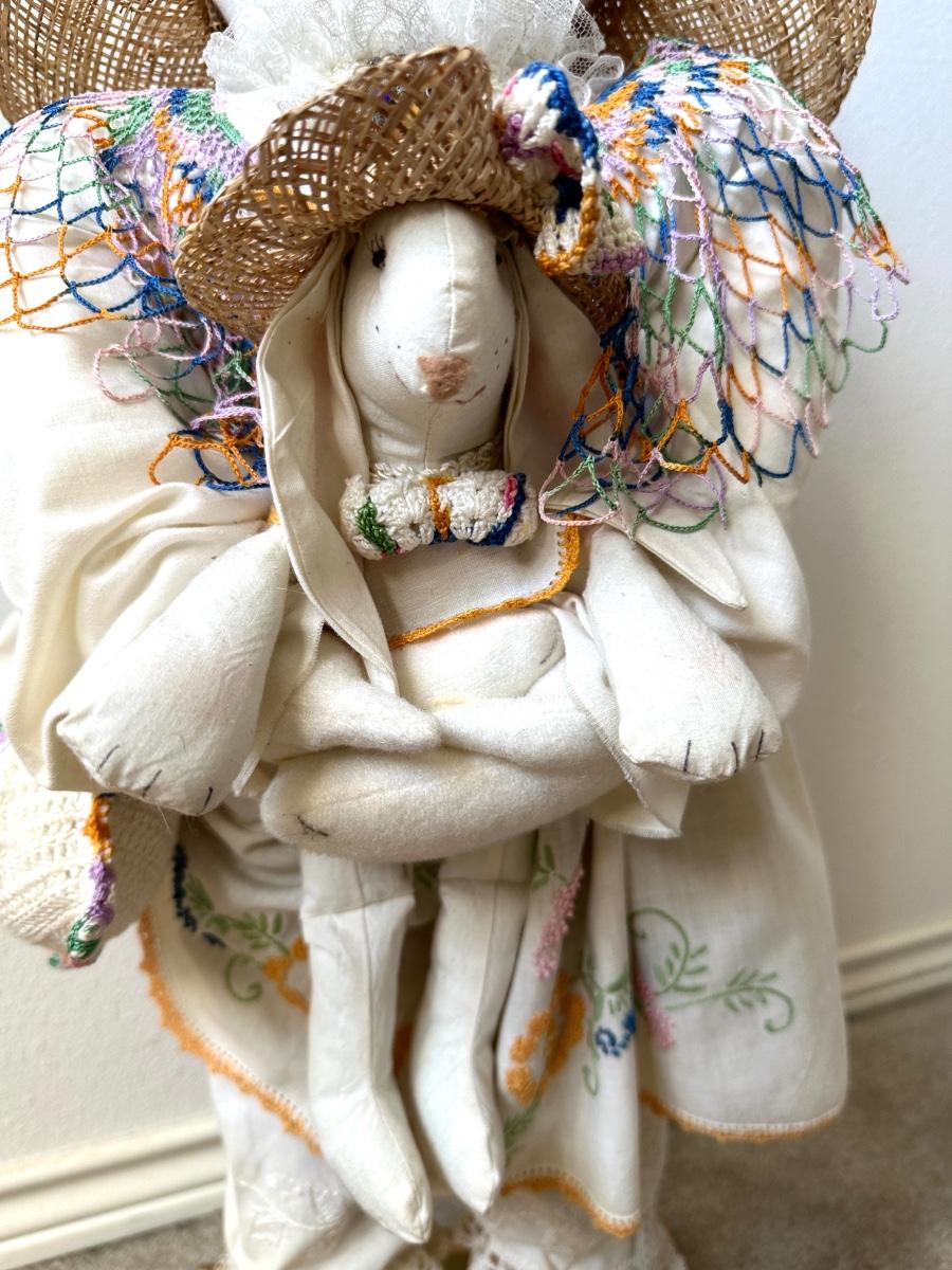 Bunny & Child by Ramatti Originals (Patti Ramy designer) Bunny carries a baby. Dressed in white with embroidered flowers wearing a crocheted bag shall and has a broach at her neck. 29 inches tall. Signed and dated. Due to the high value of this item, additional insurance is required if shipped.