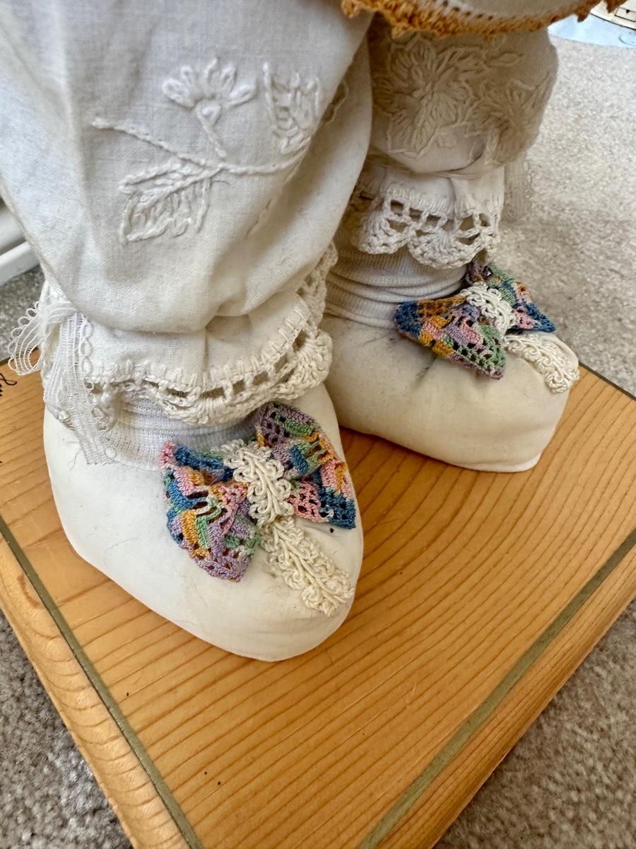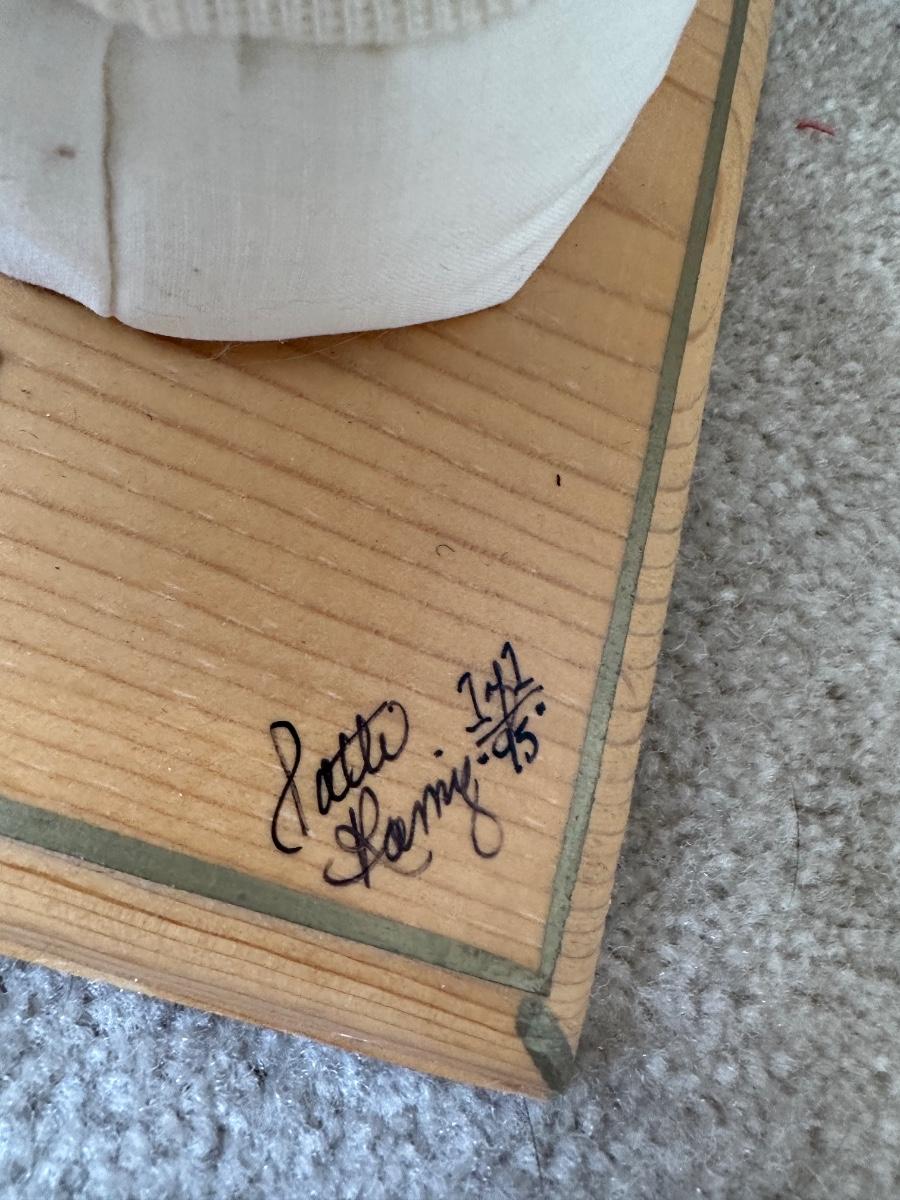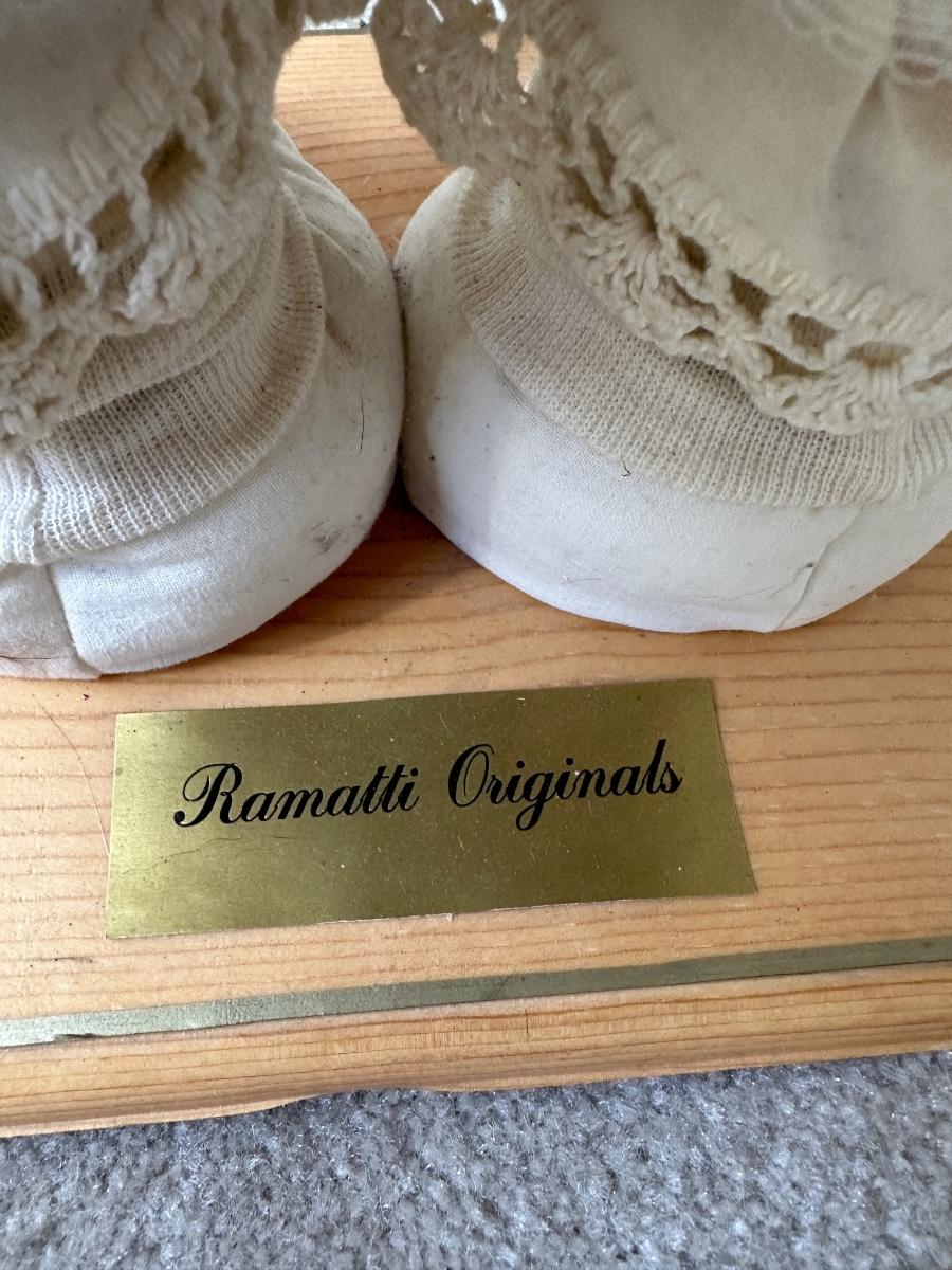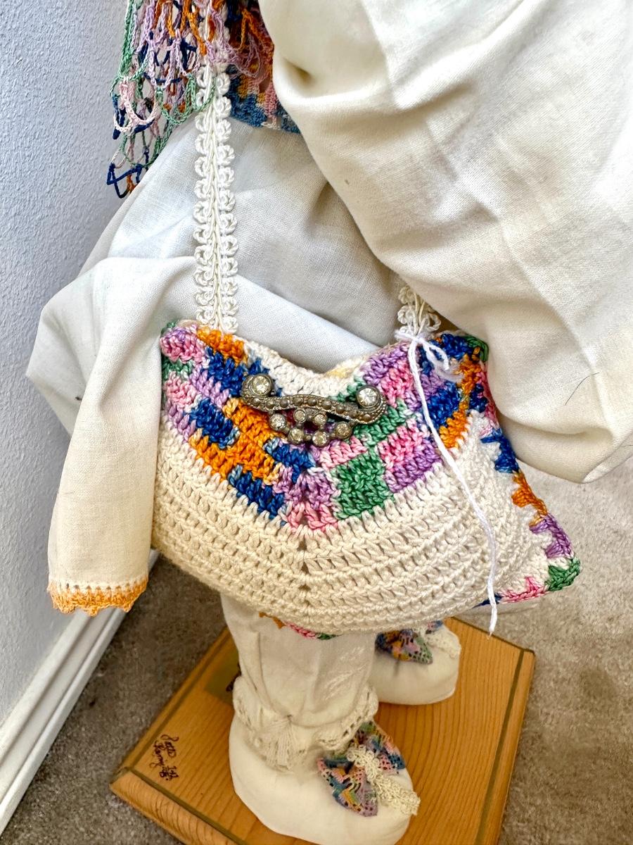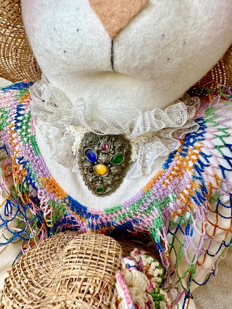 Bunny & Child by Ramatti Originals (Patti Ramy designer) Bunny carries a baby. Dressed in white with embroidered flowers wearing a crocheted bag shall and has a broach at her neck. 29 inches tall. Signed and dated. Due to the high value of this item, additional insurance is required if shipped.