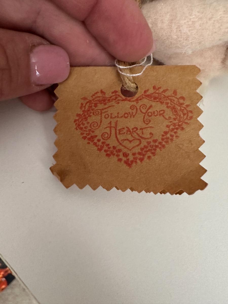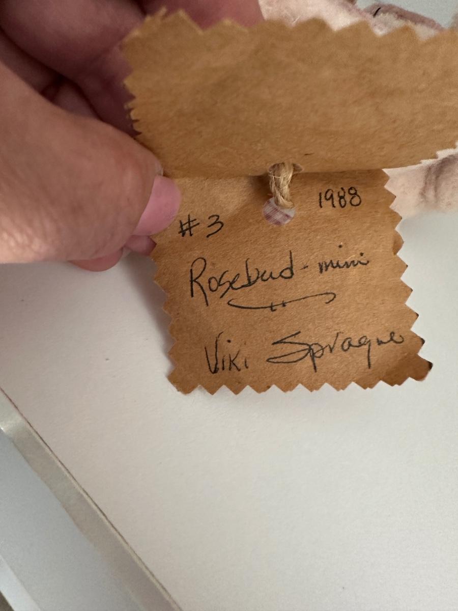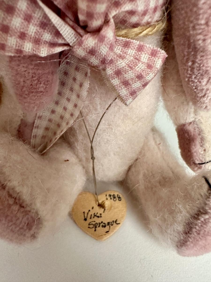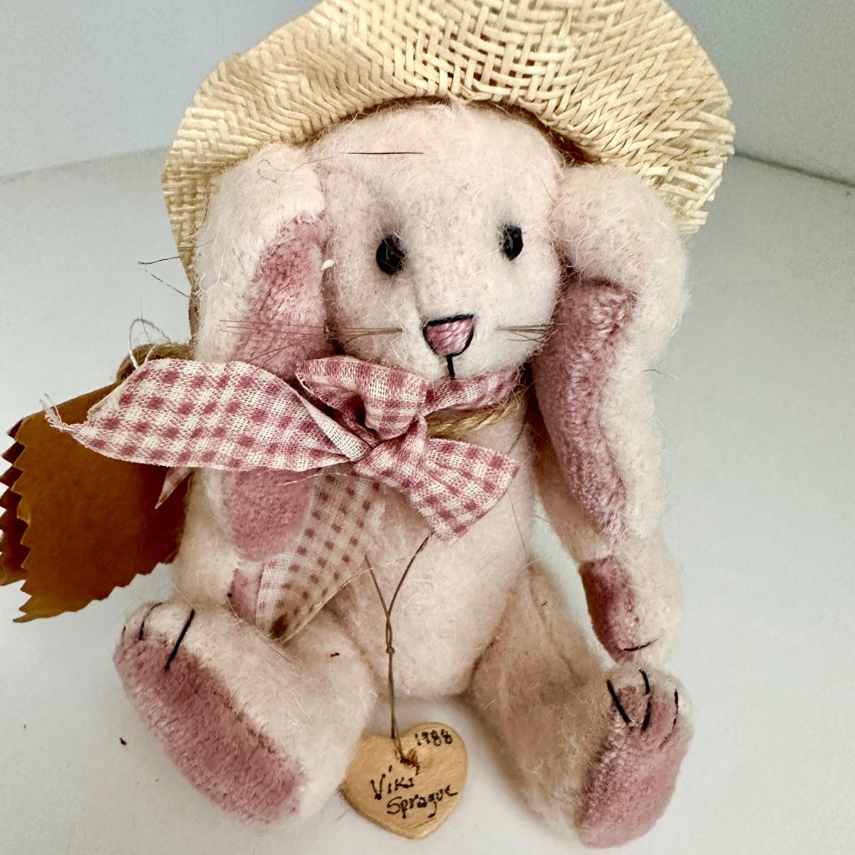 Follow your heart bunny. Rosebud by Viki Sprague. Cream color bunny with pink ears and foot pads. Wearing a pink gingham scarf . 5 inches 1988