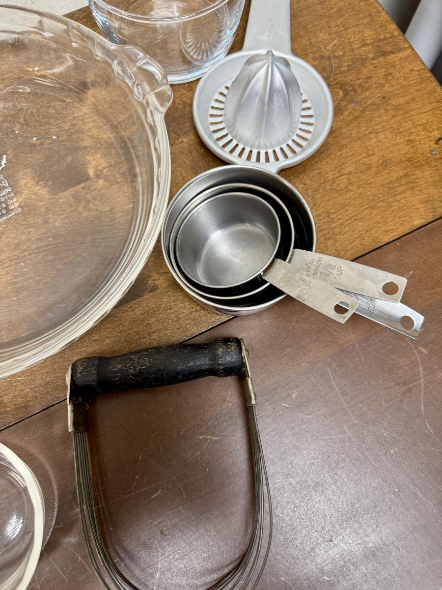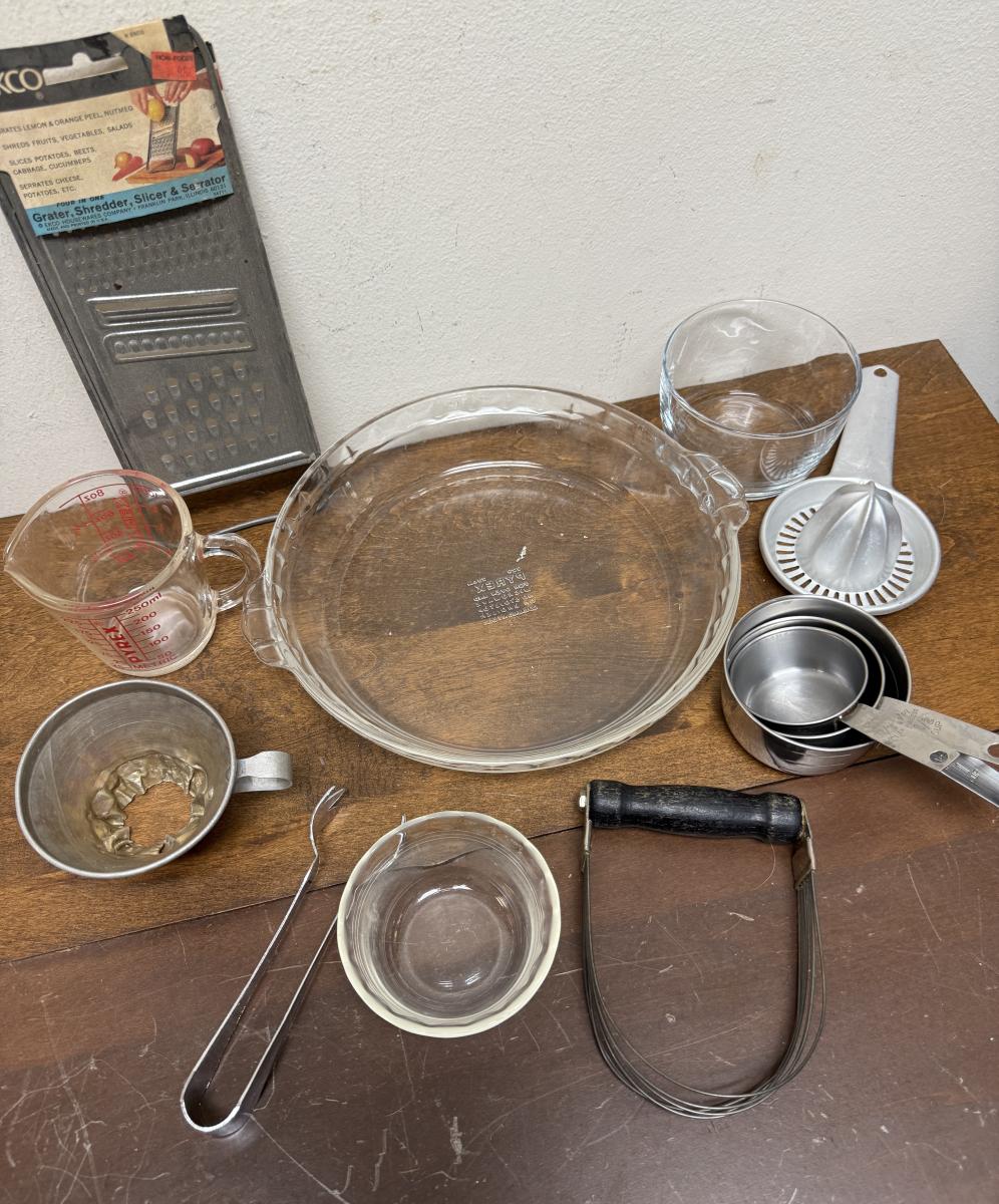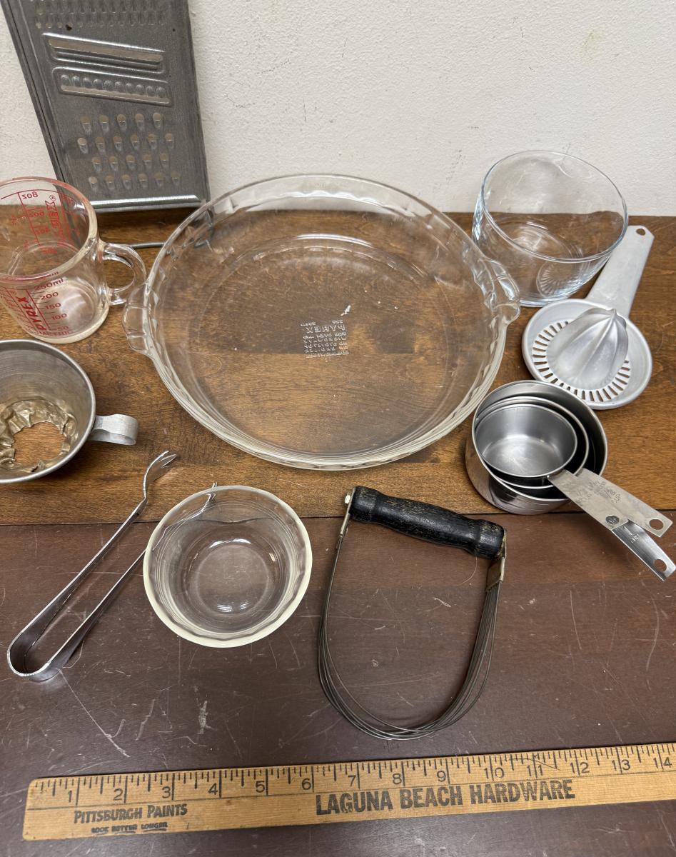 Vintage Kitchen Tools Lot - Glass Pyrex Pie Pan, Measuring Cups, etc