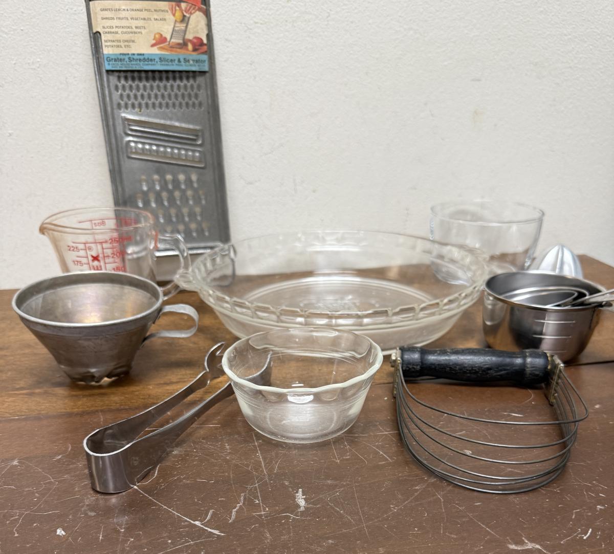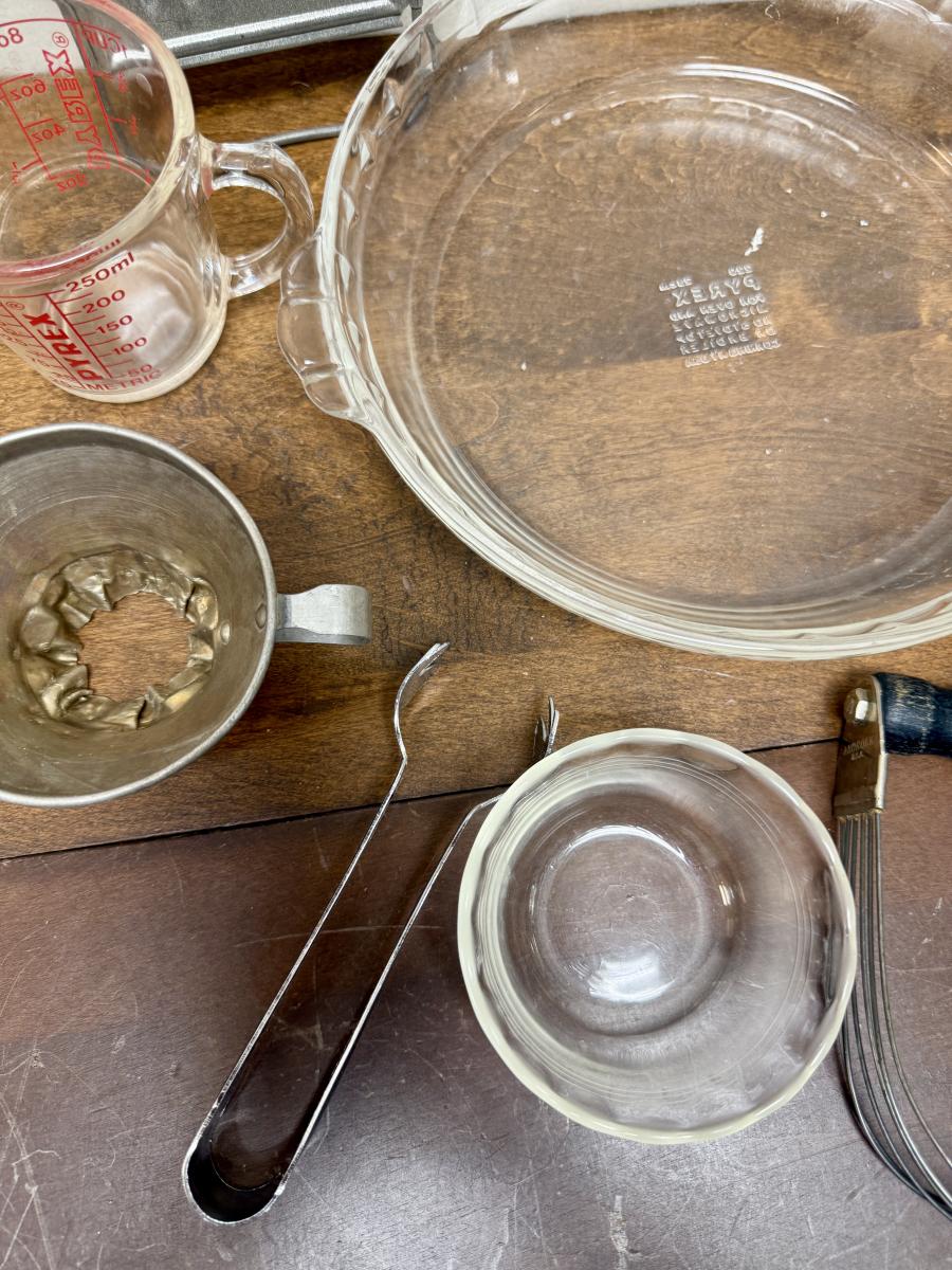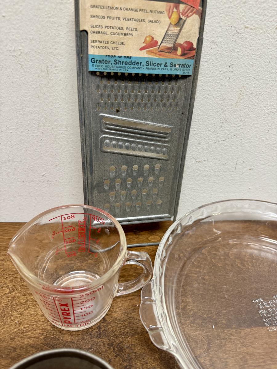 Vintage Kitchen Tools Lot - Glass Pyrex Pie Pan, Measuring Cups, etc