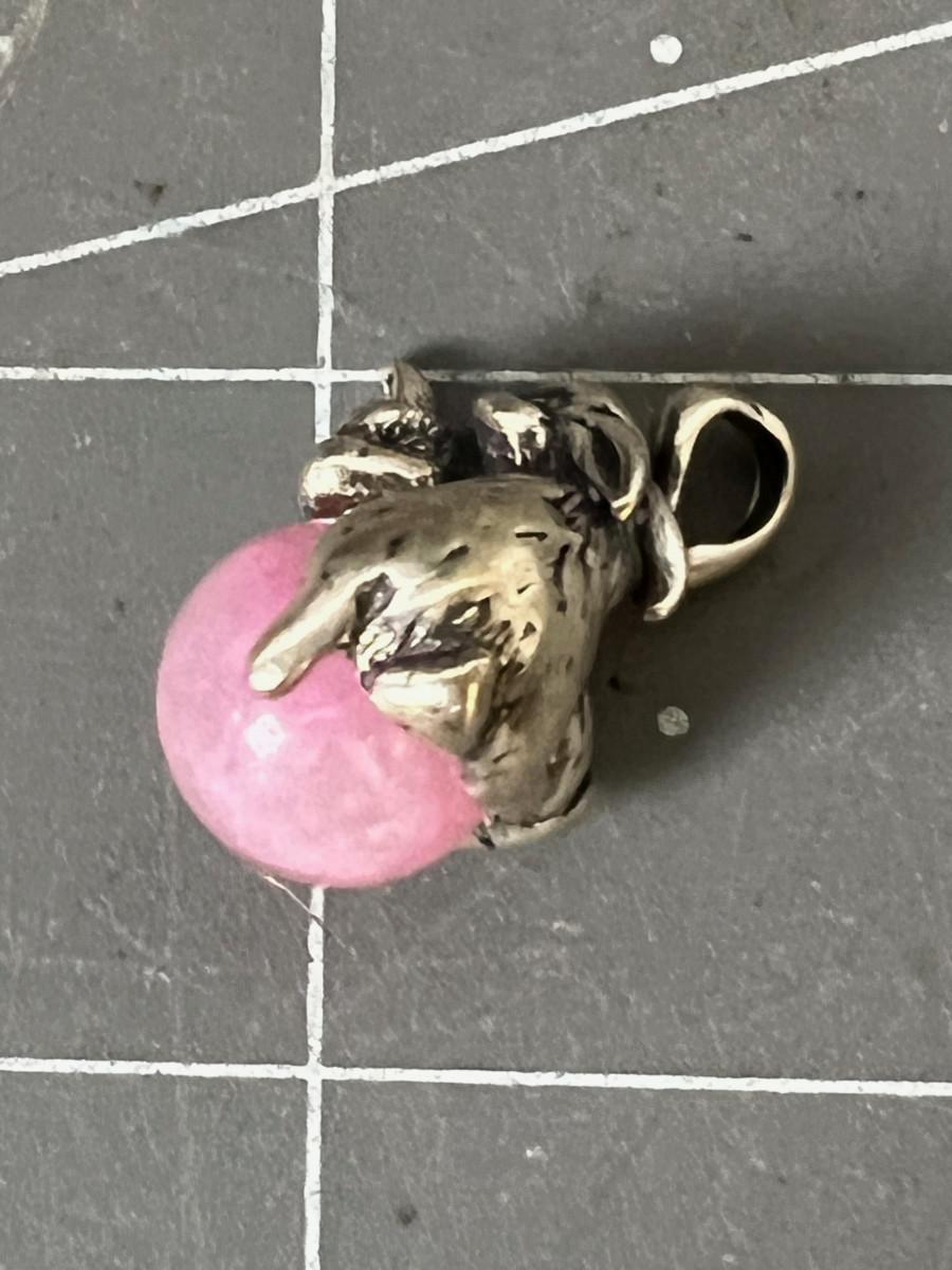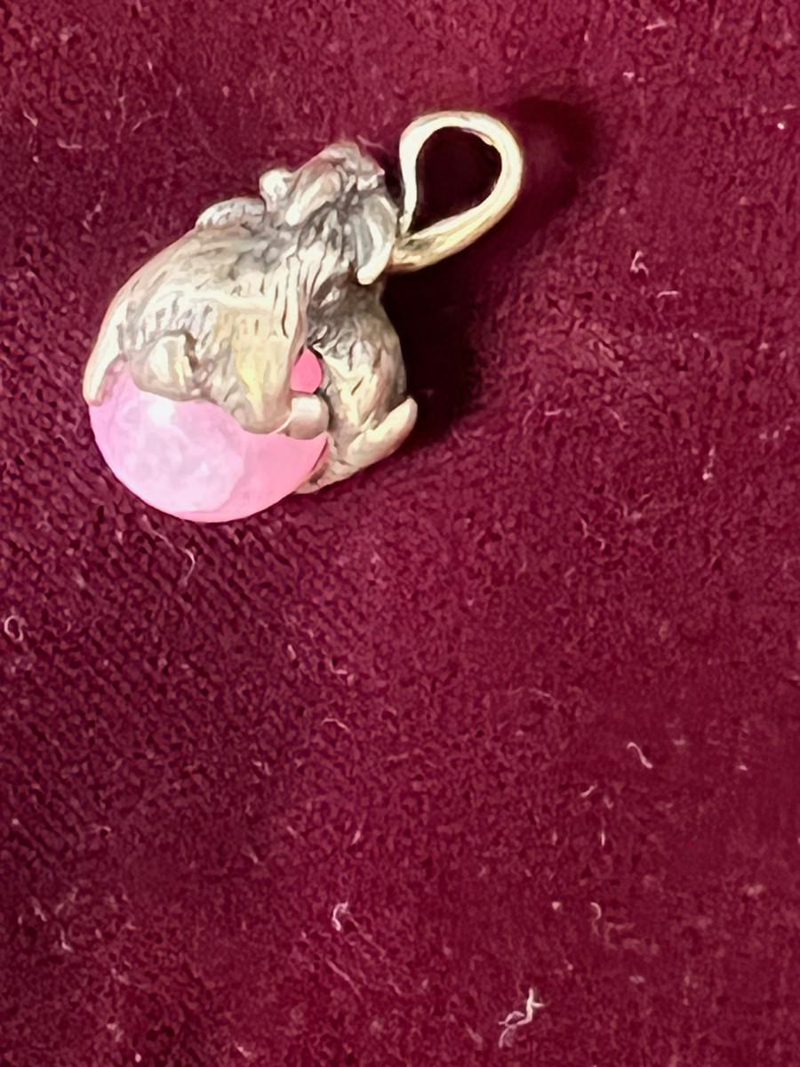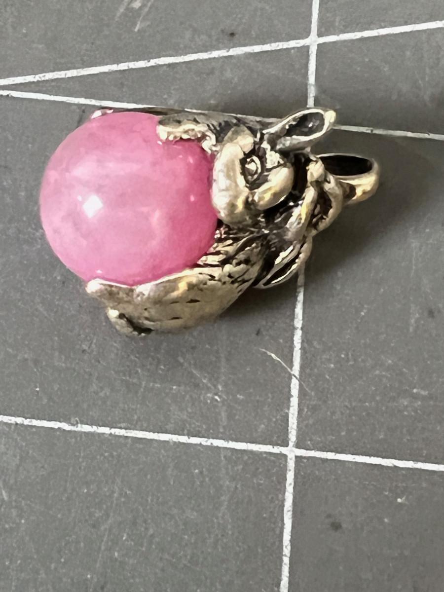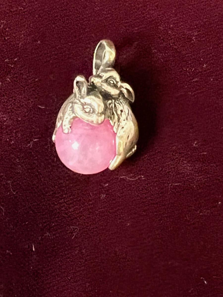 9.0 Grams silver and Rose Quartz. The Bunny is small, half of the weight is the Rose Quartz