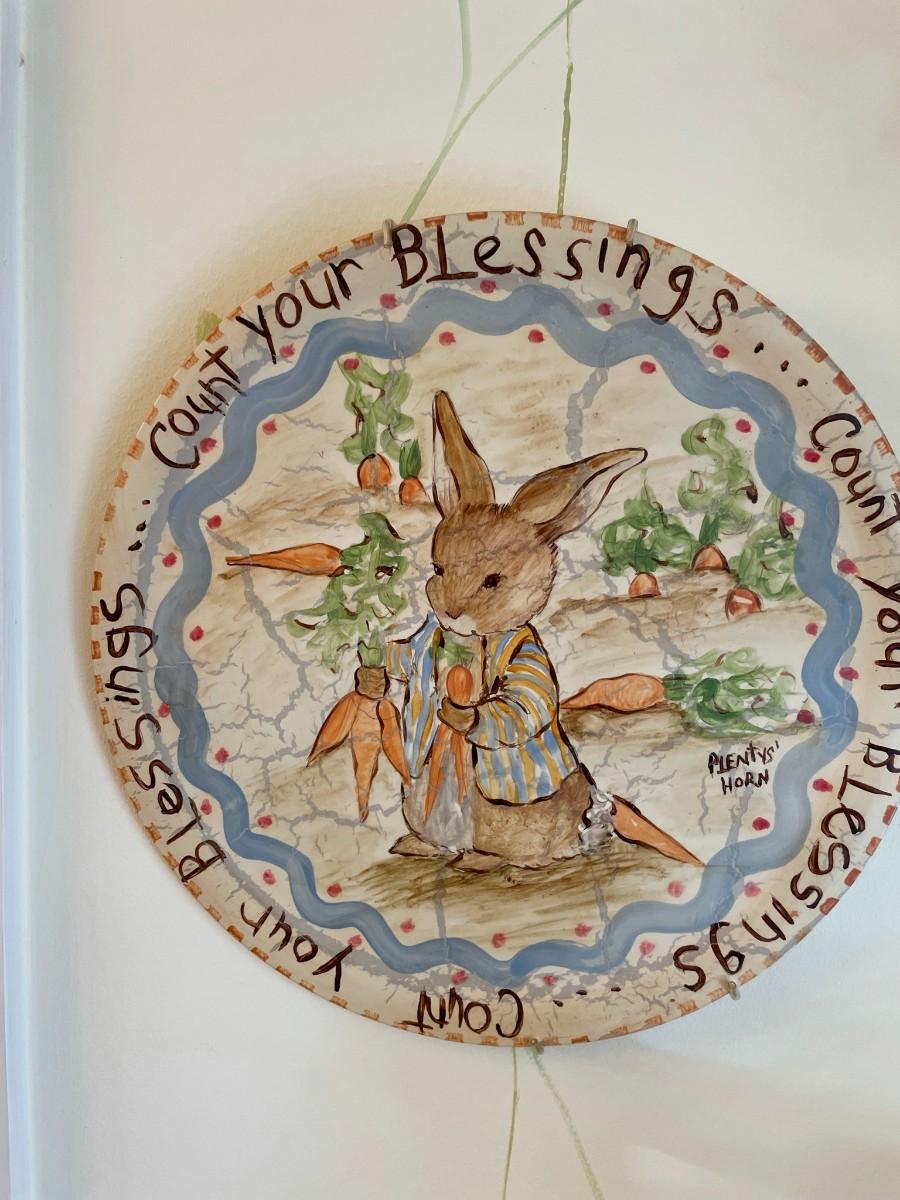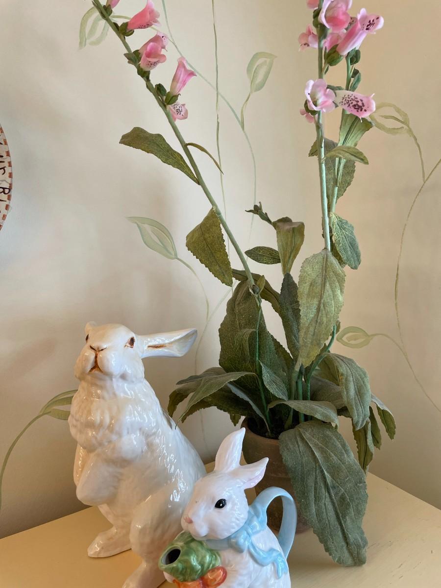 Ceramic Bunny Decor, Ceramic Bunny Teapot, "Count Your Blessings" Bunny wall decor, Flowers in pot.