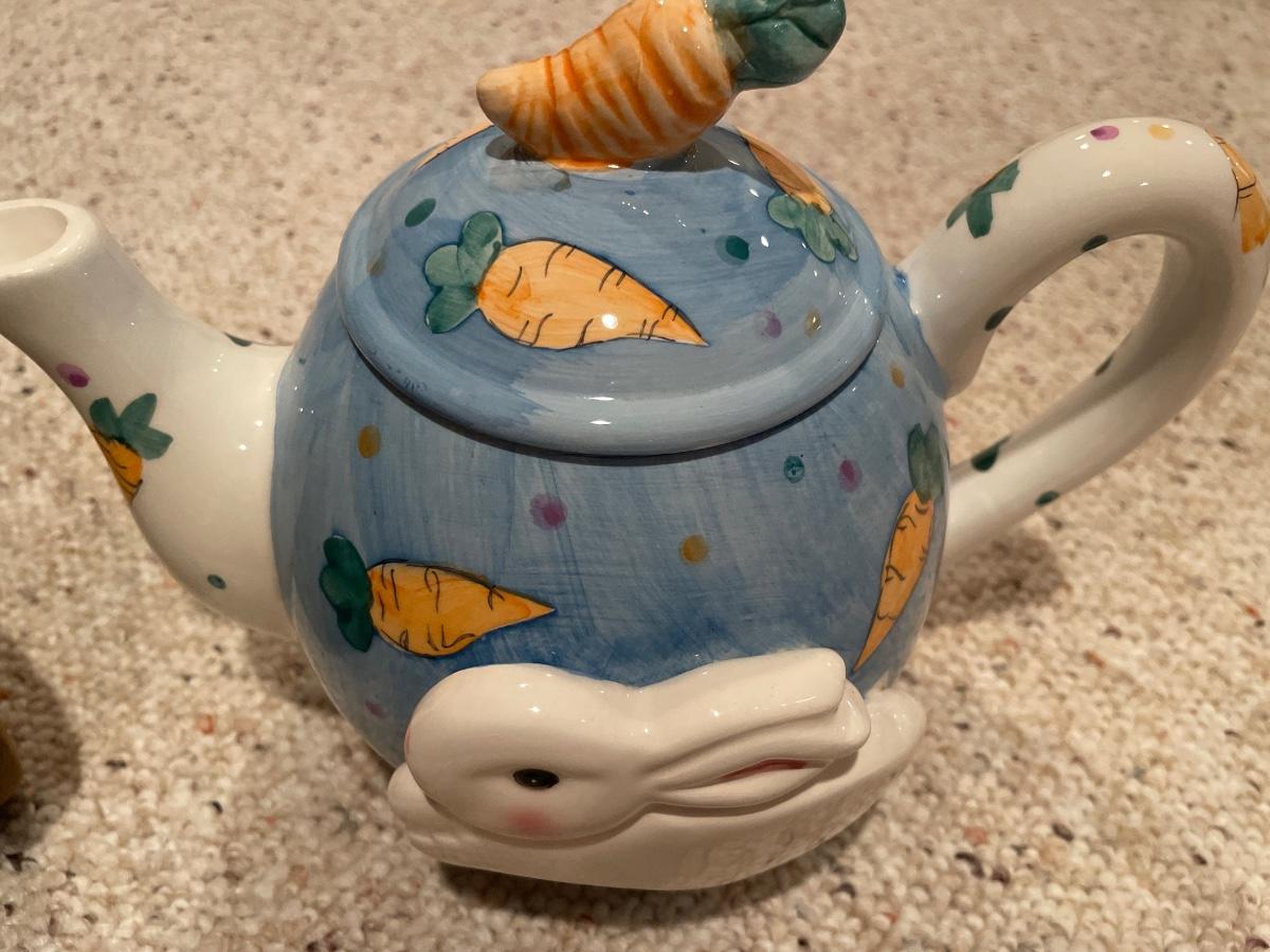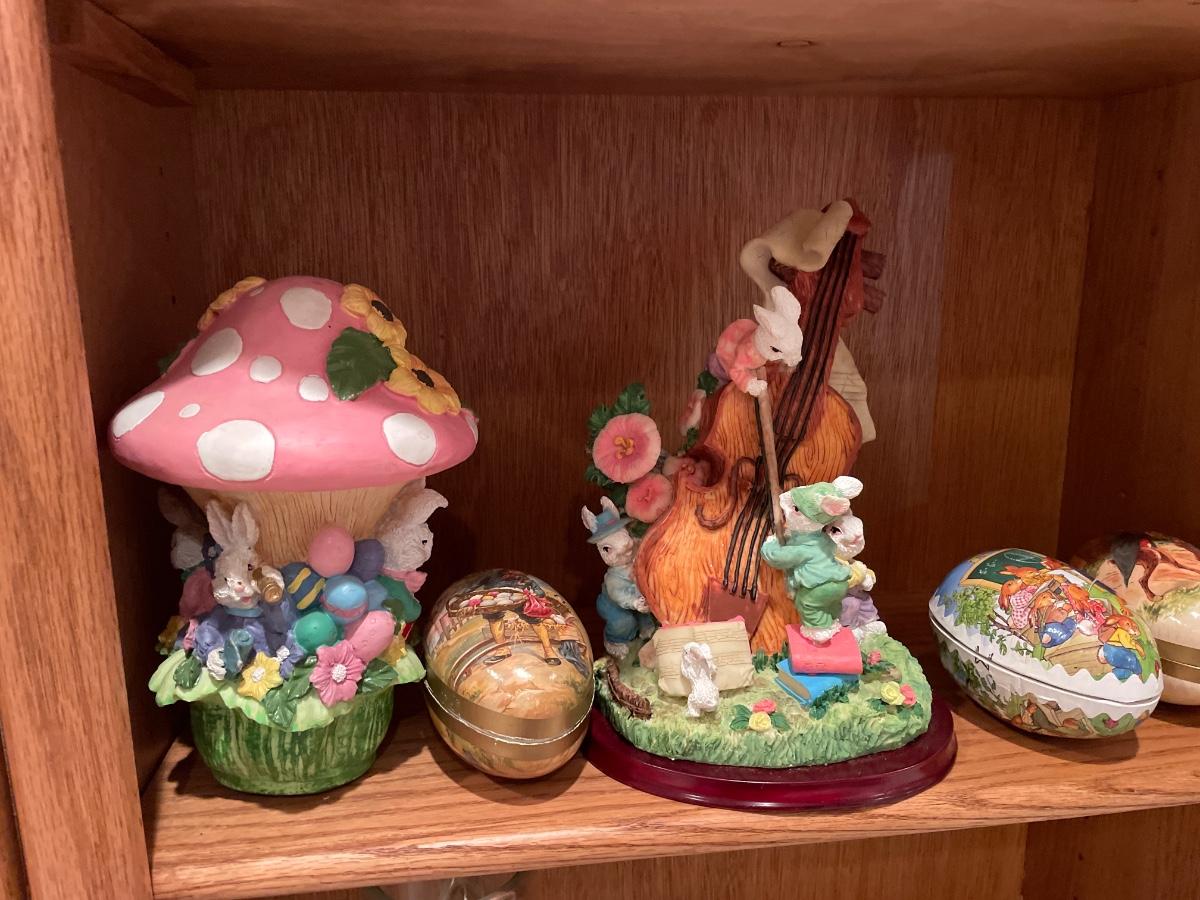 Bunny decor includes teapot , mushroom, paper eggs and violin decor