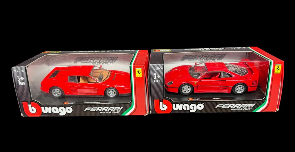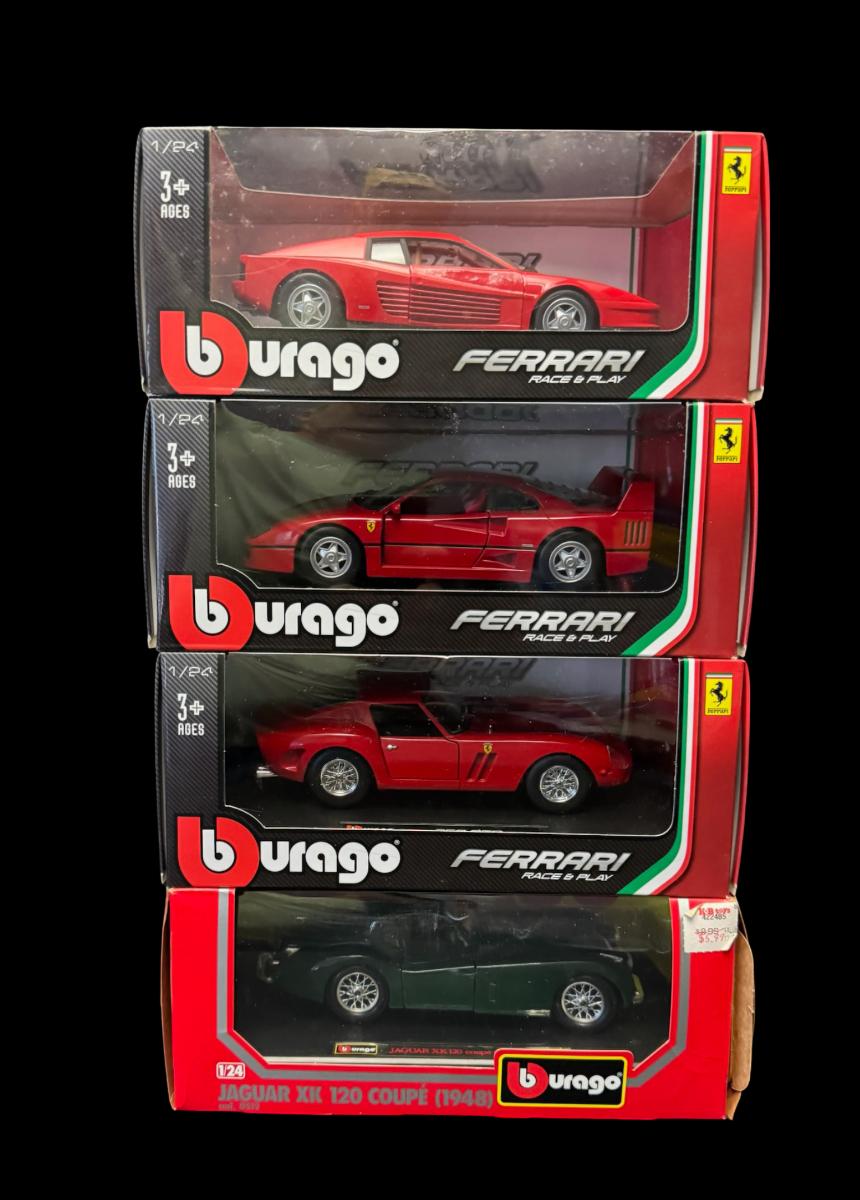 Includes a 1948 Jaguar XK120 Coupe, a Ferrari 250 GTO, a Ferrari F40, and a Ferrari Testarossa. Total of four pieces in the original boxes.