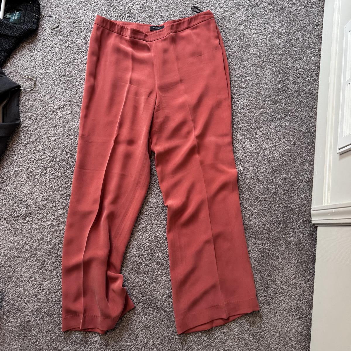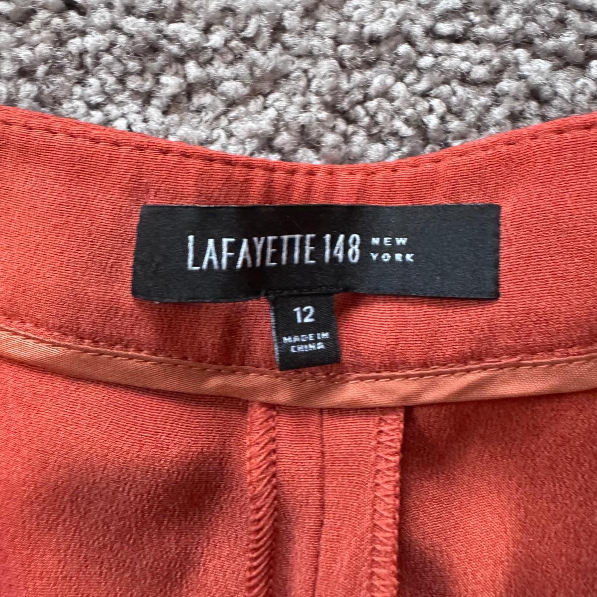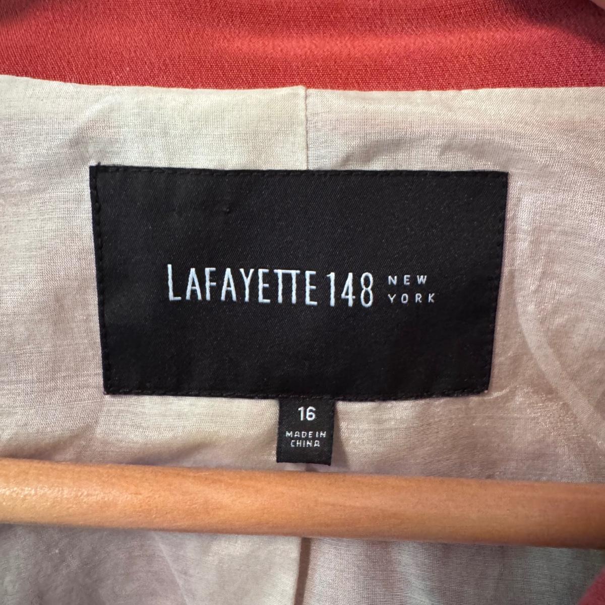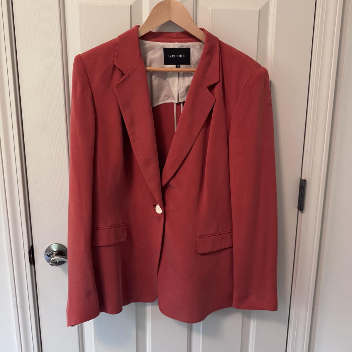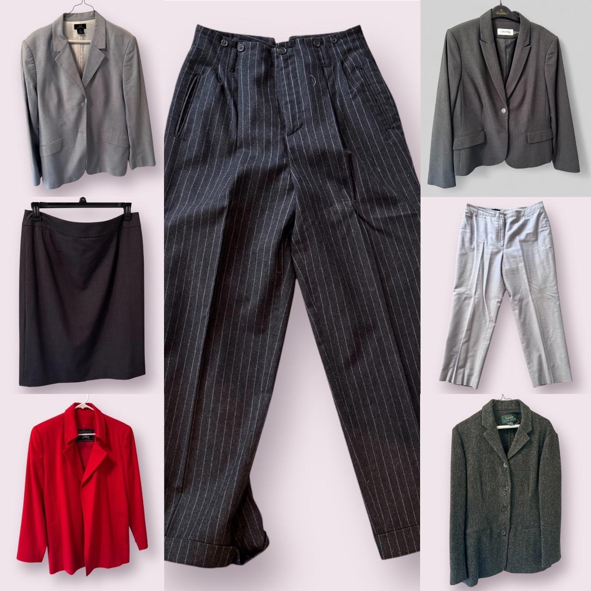 This lot includes seven women’s blazers, four pant suits with top and bottoms, and five dress pants in various colors. You’ll find the following brands: Burberry, Brooks Brothers, Lafayette 148, Calvin Klein, Ralph Lauren, J. Crew, Zanella, and Bernard Zins. Most pieces are a size 14 - see pictures for all sizes. The Burberry red coat has a small stain on the front that appears to be a pen mark - see picture. The pinstriped pants pictured at the end appear to have a small mold spot - see pictures. Shipping available.