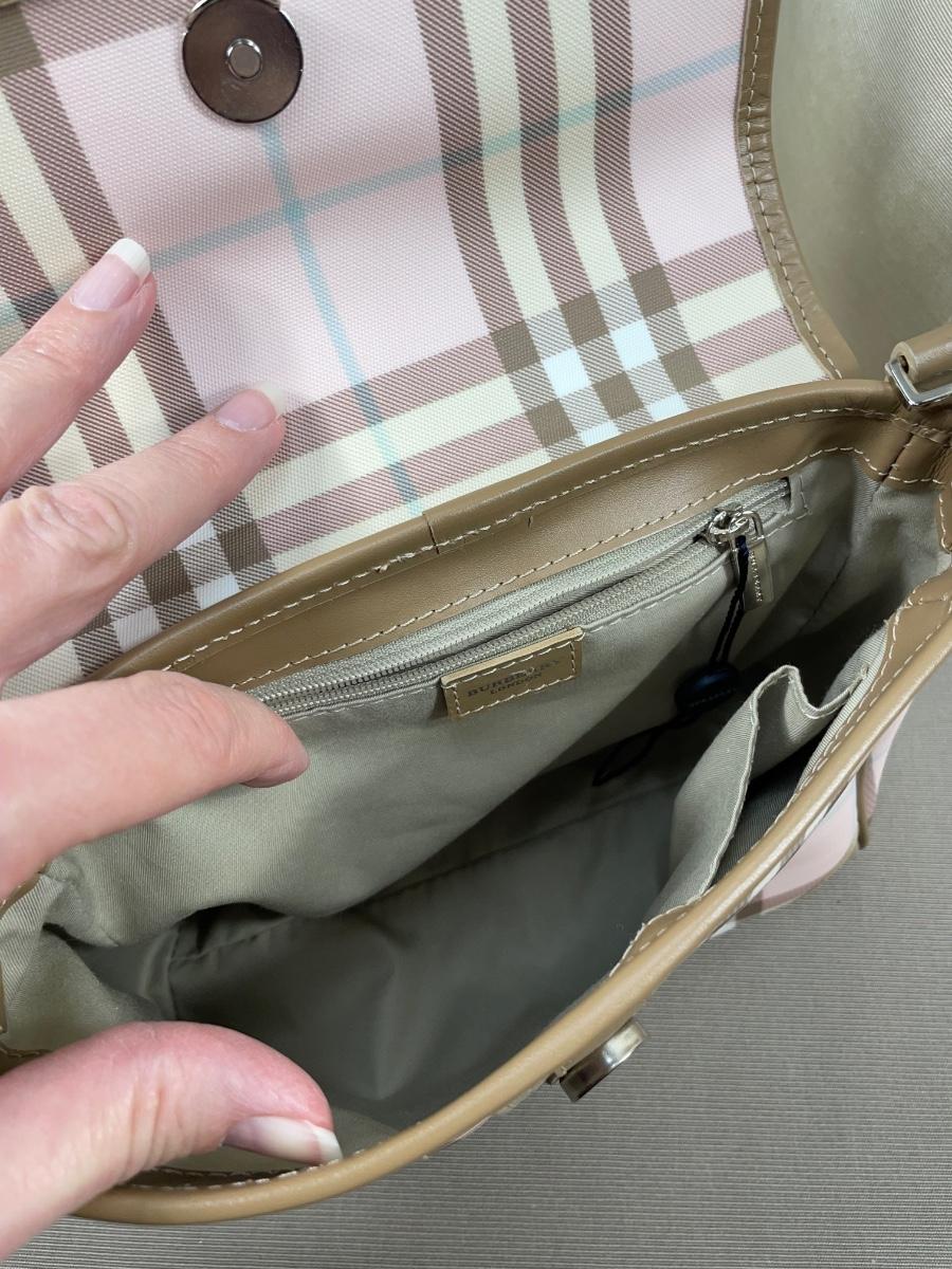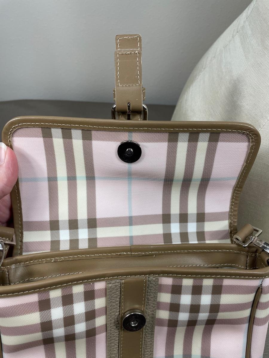 Authentic Burberry. 9” by 7” with detachable 38” crossbody strap. Next to new condition with clean interior. There is one small spot on the back as shown. Low reserve.