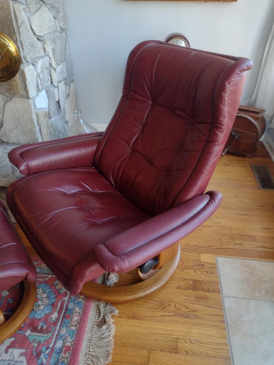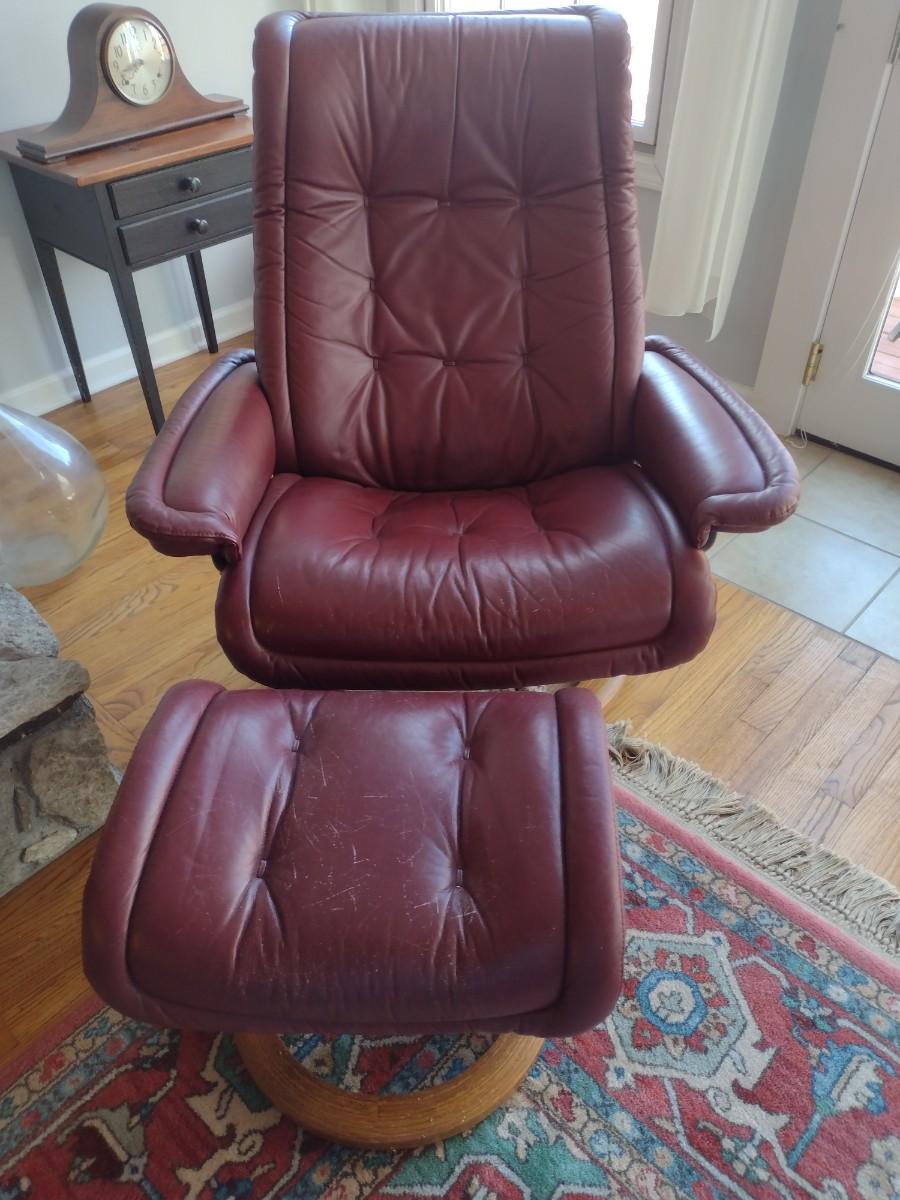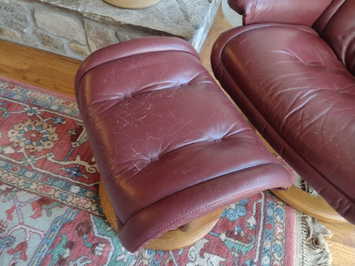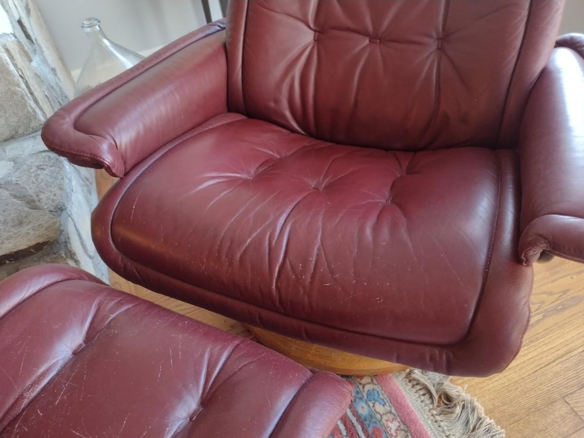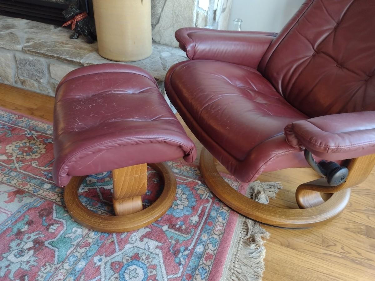 Burgandy Leather Ekornes Gravity Chair with Ottoman has wear and scratches as shown.